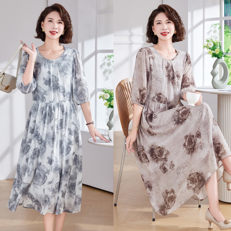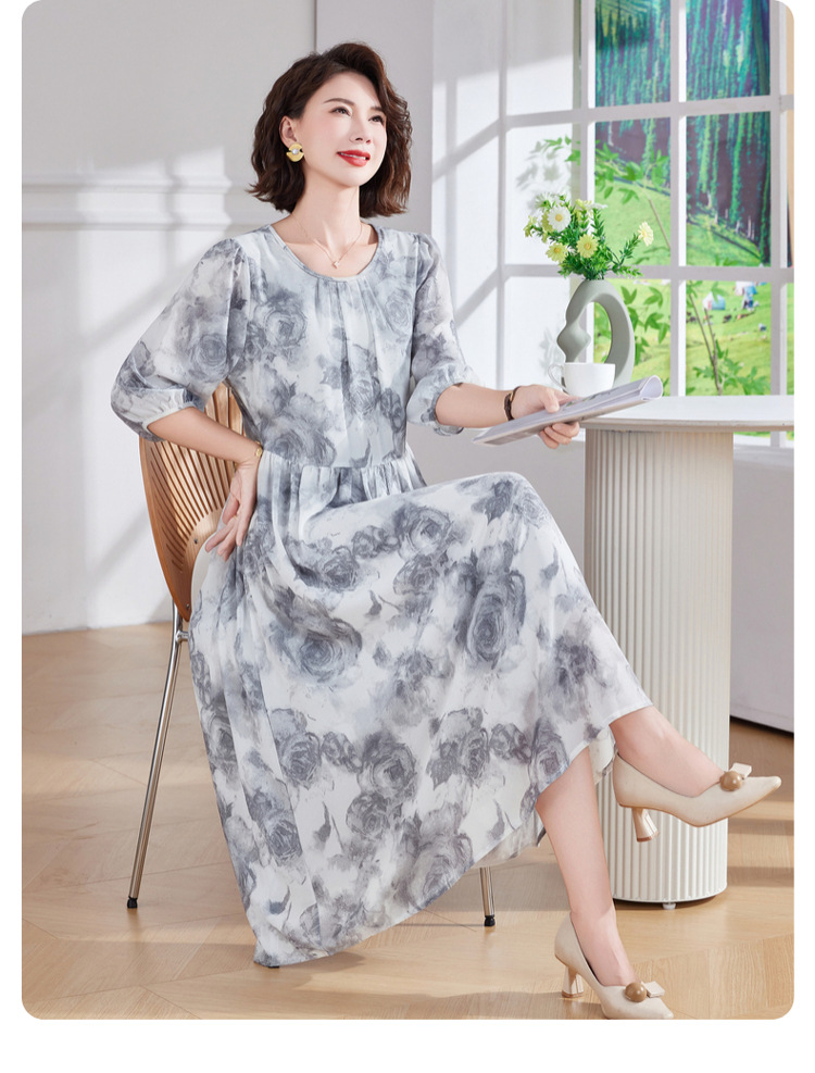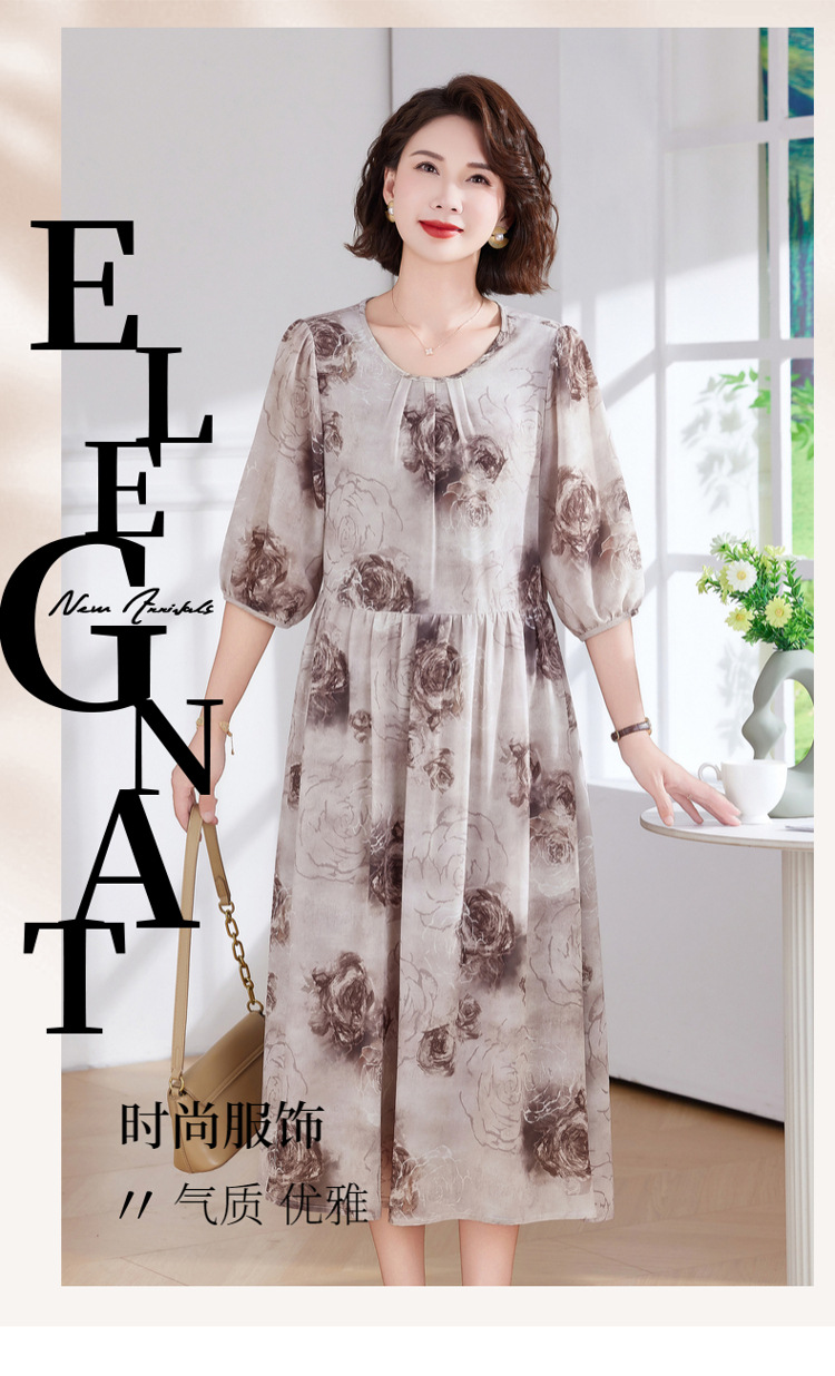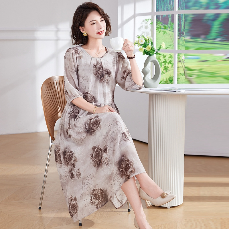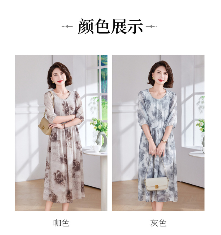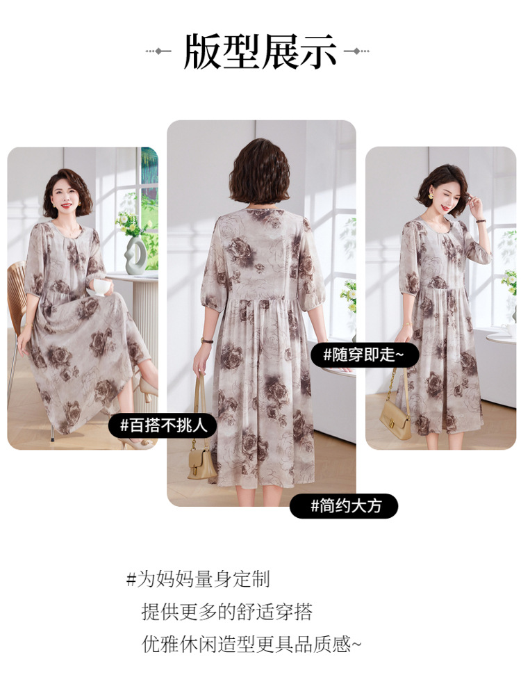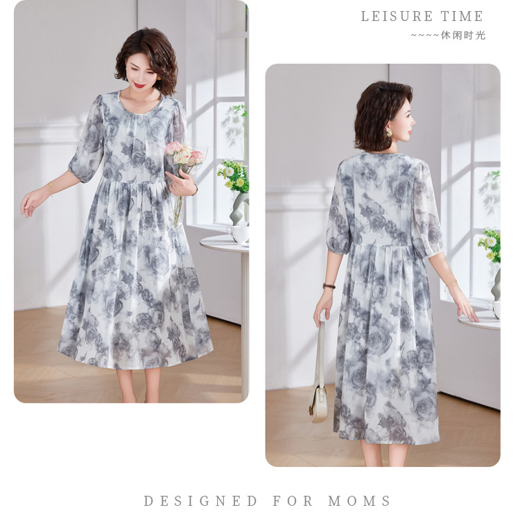Платье с принтом для женщин 2025, новый стиль лета, элегантное платье для мам среднего и старшего возраста с завышенной талией, V-образным вырезом и юбкой средней длины.