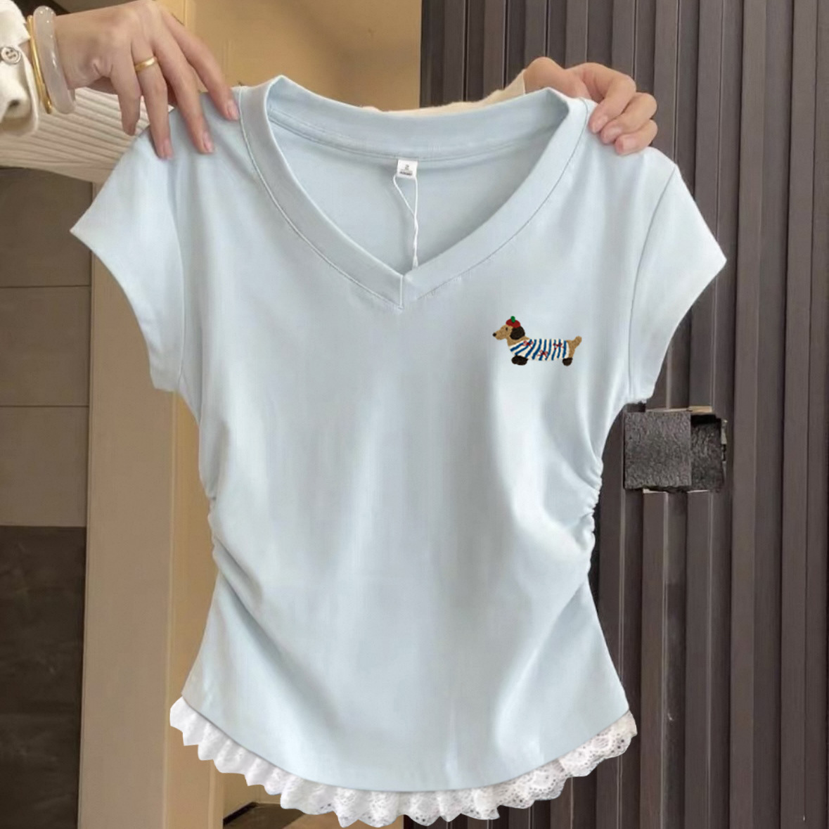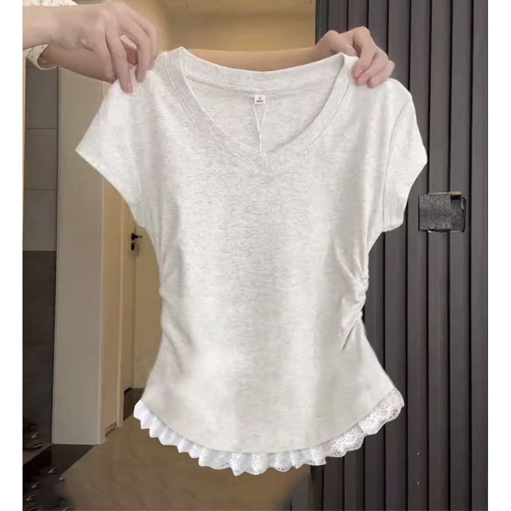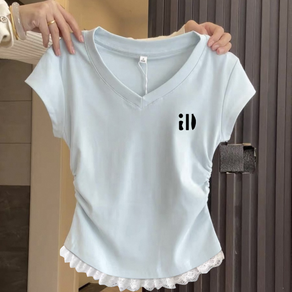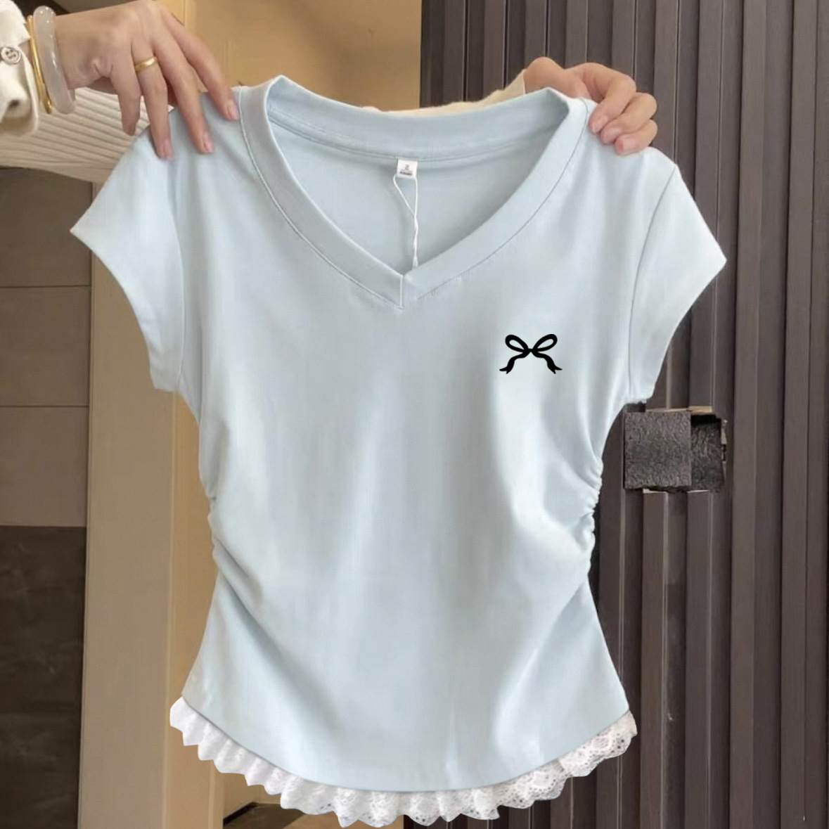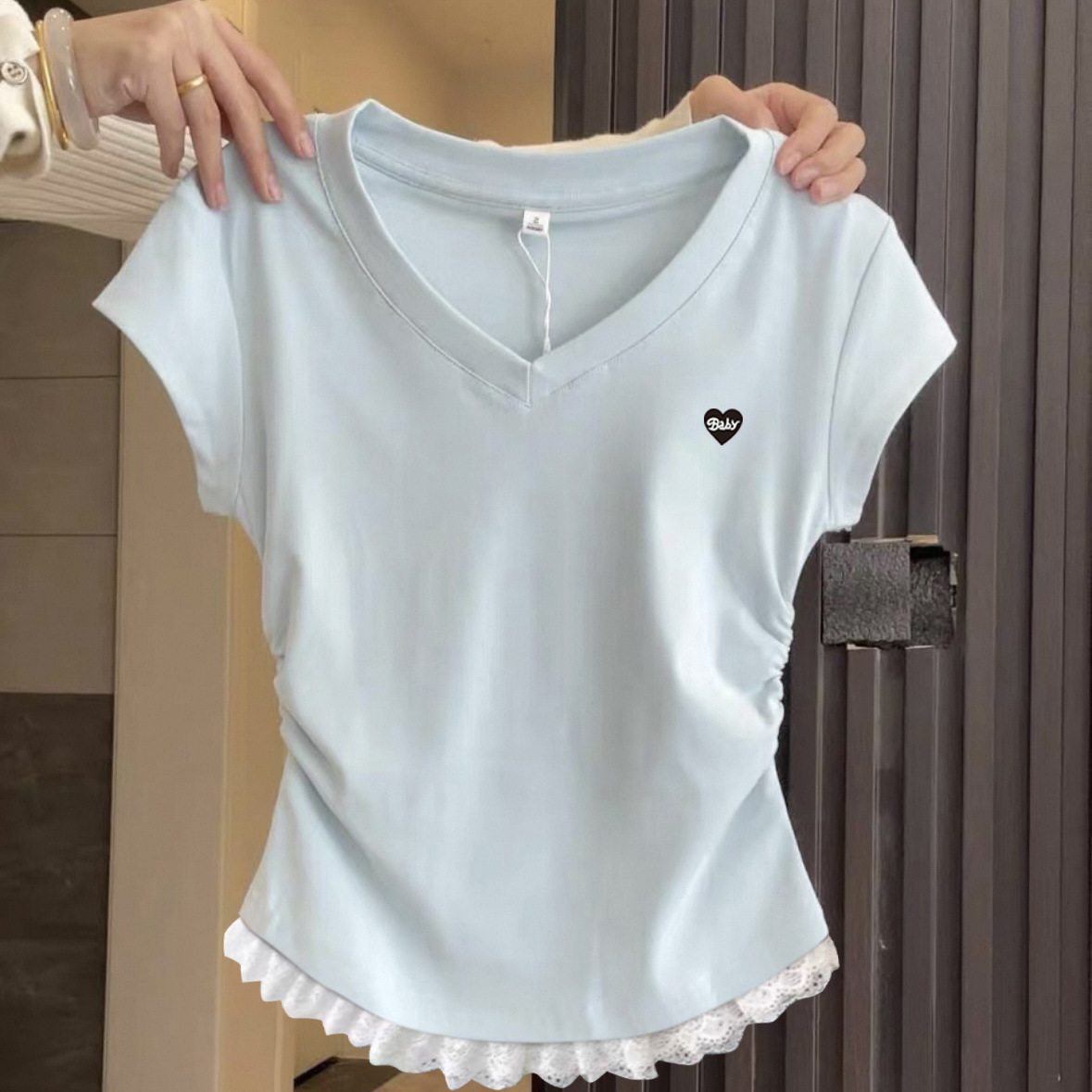 Корейская сладкая кружевная облегающая рубашка 2025, летняя новинка, популярный топ с V-образным вырезом, утягивающий эффект, короткий рукав, футболка для женщин