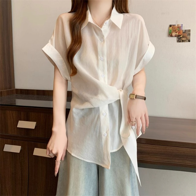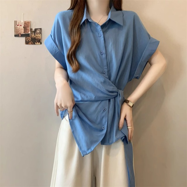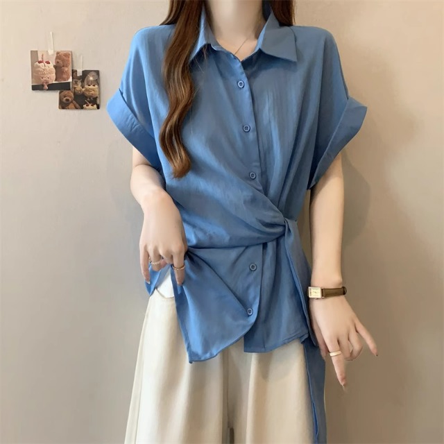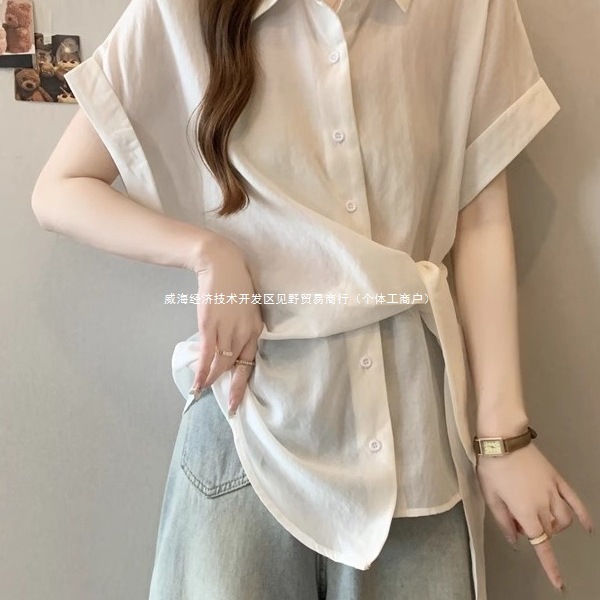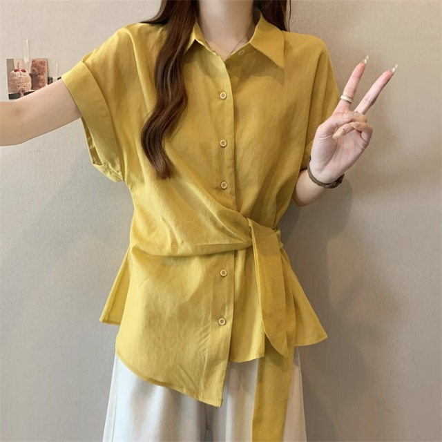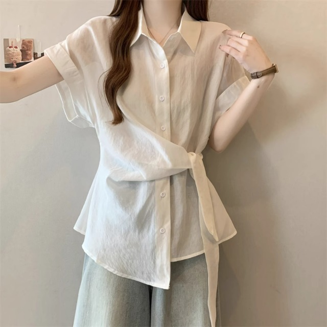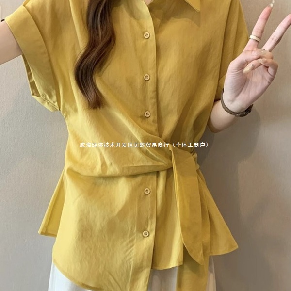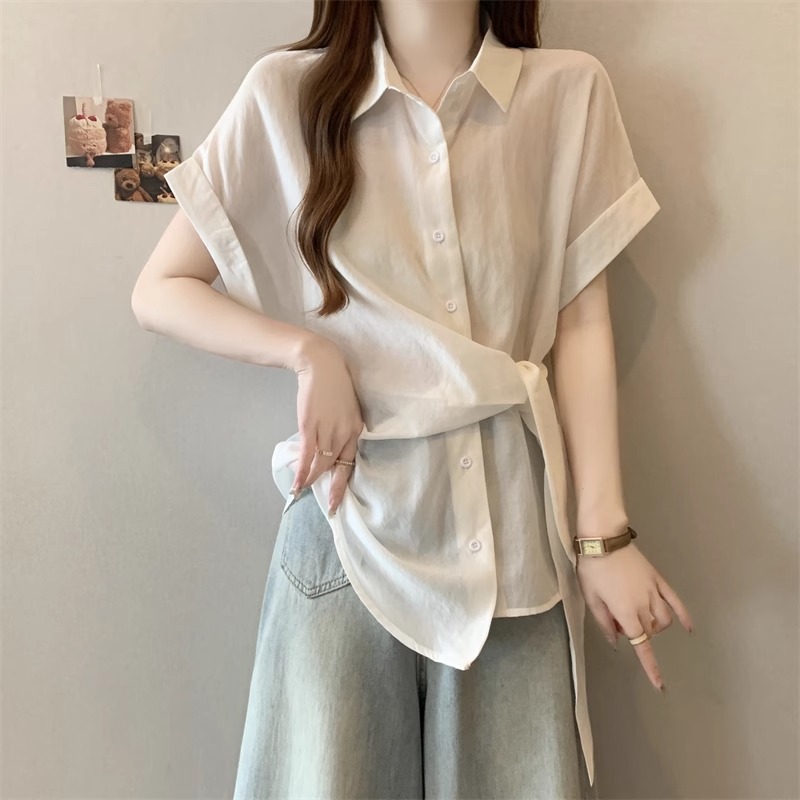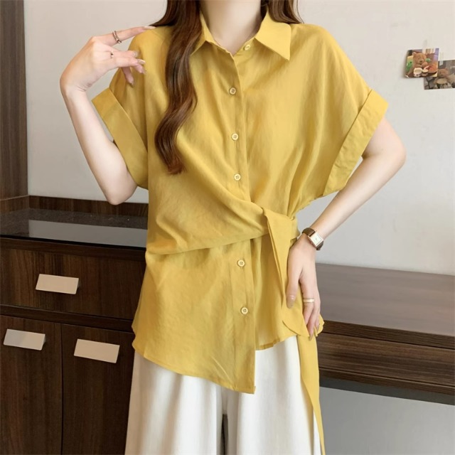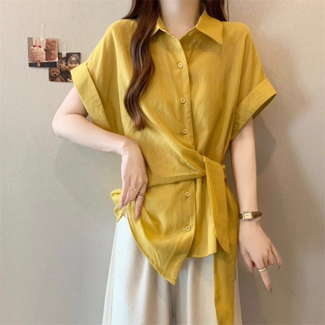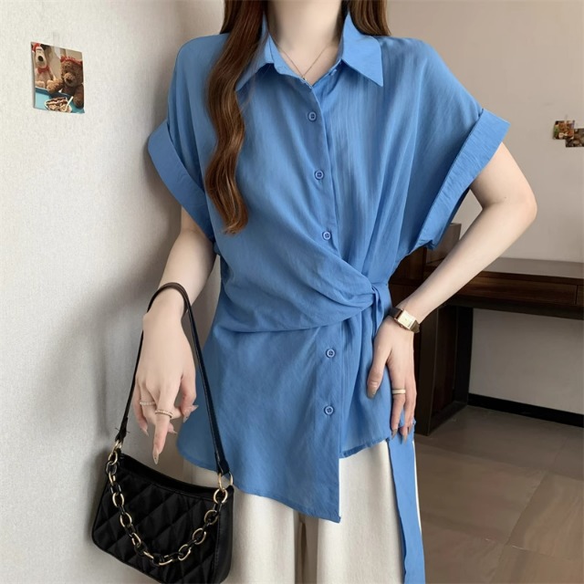 Женская рубашка с короткими рукавами и нерегулярной шнуровкой на талии, лето 2025, большой размер, толстые мм, маленькие летящие рукава, тонкий и стильный топ-рубашка