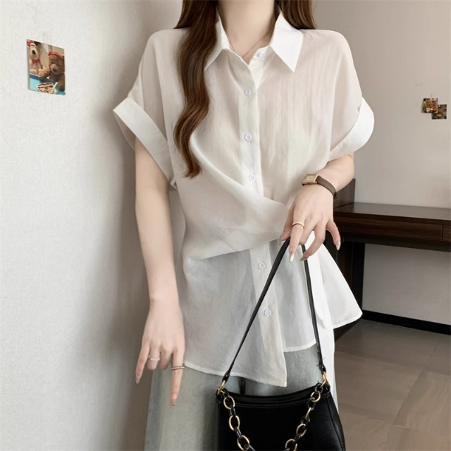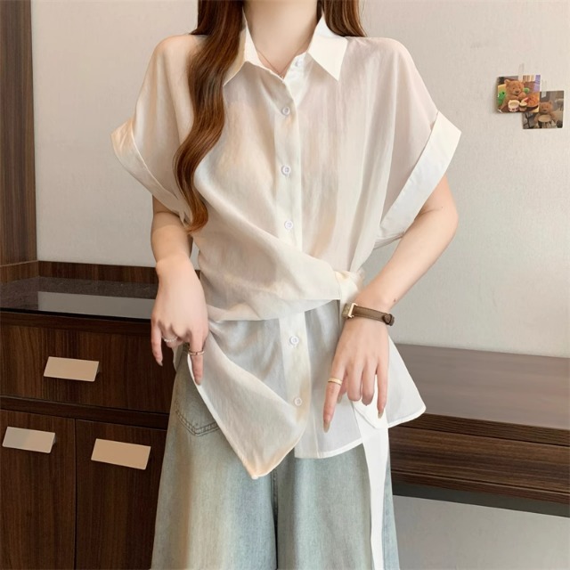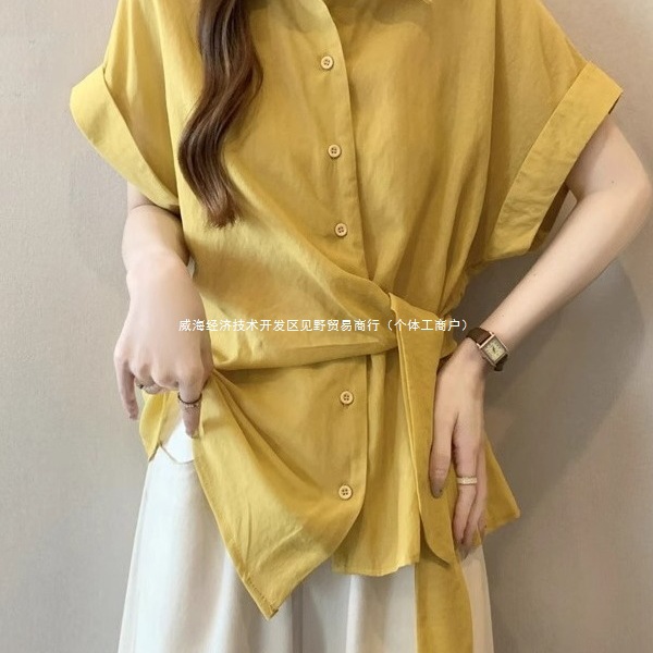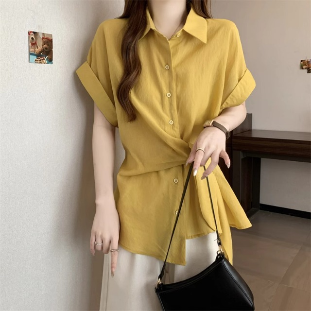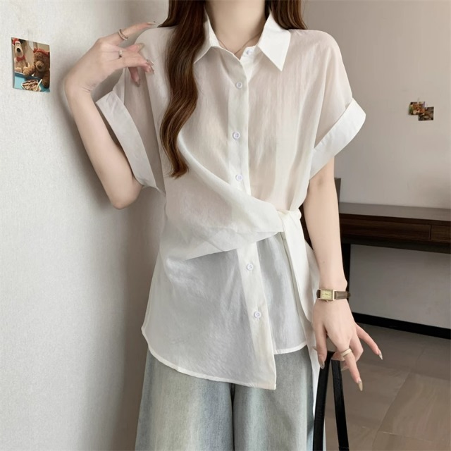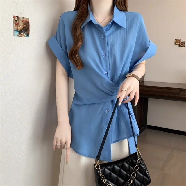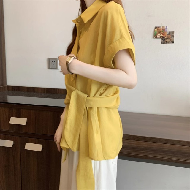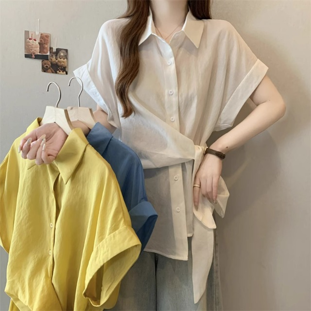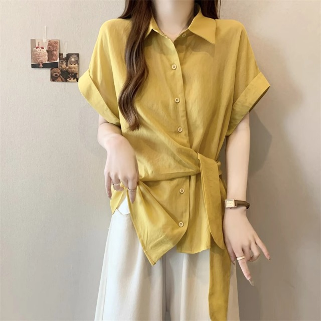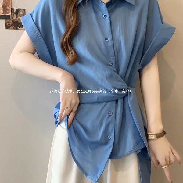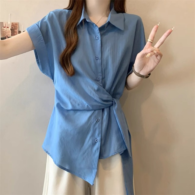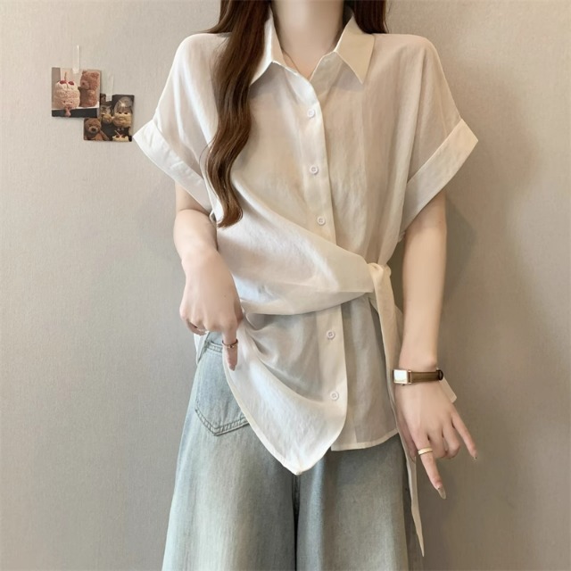 Женская рубашка с короткими рукавами и нерегулярной шнуровкой на талии, лето 2025, большой размер, толстые мм, маленькие летящие рукава, тонкий и стильный топ-рубашка