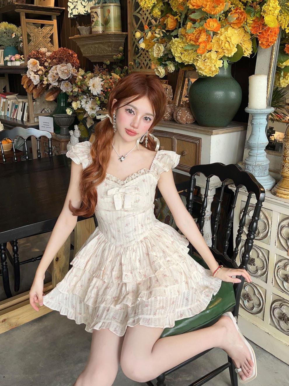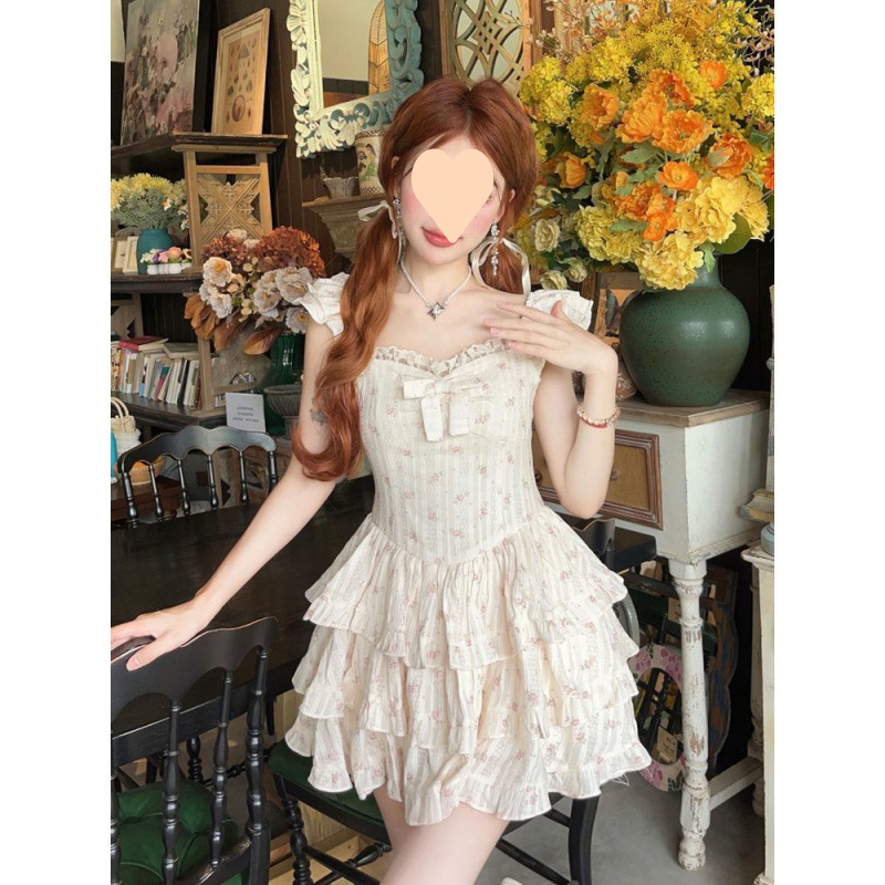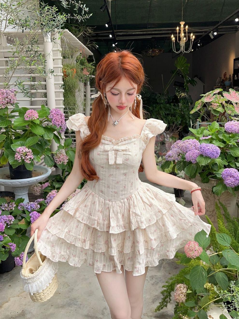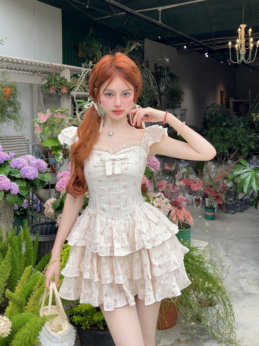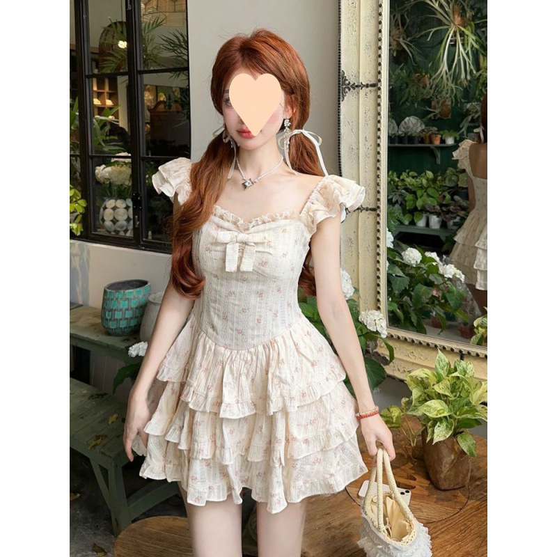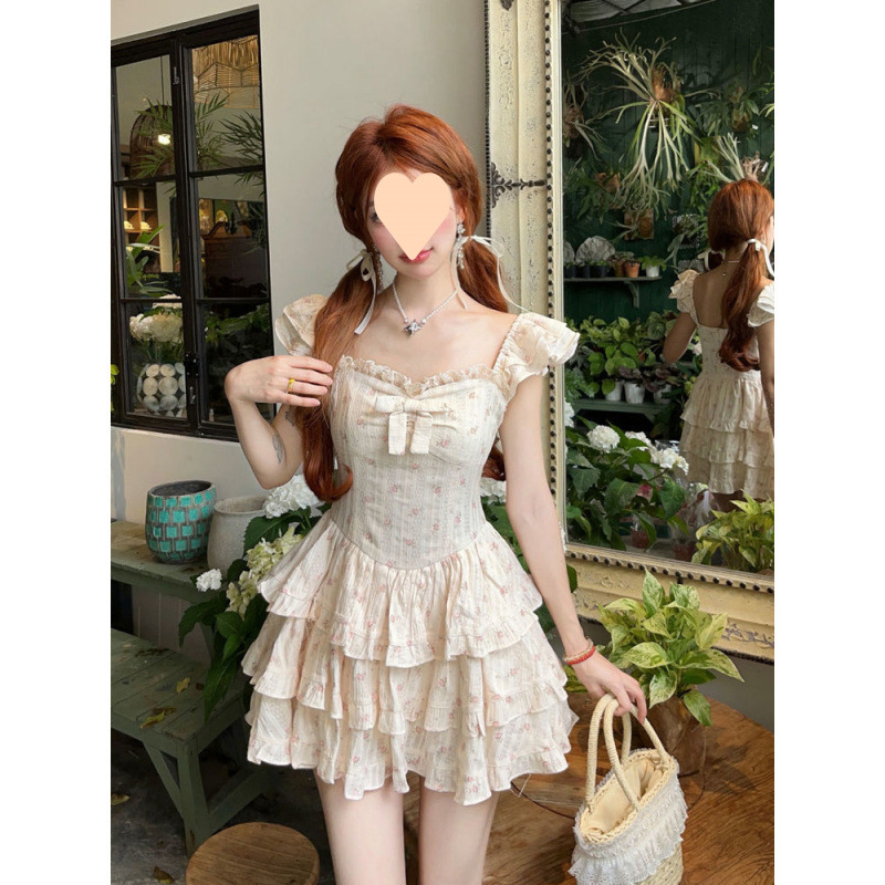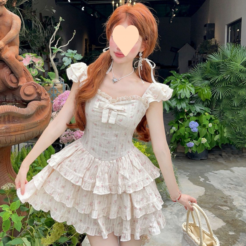 Пышная юбка принцессы с пышными рукавами для перерыва на чай, супер сказочный бант на талии, лесное платье с цветочным принтом, женское новое летнее платье