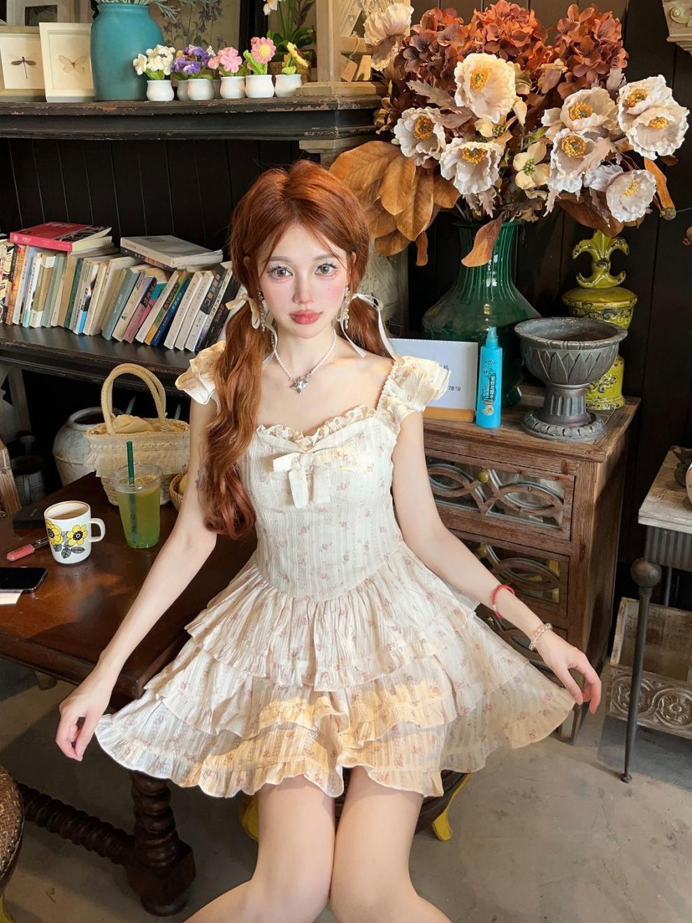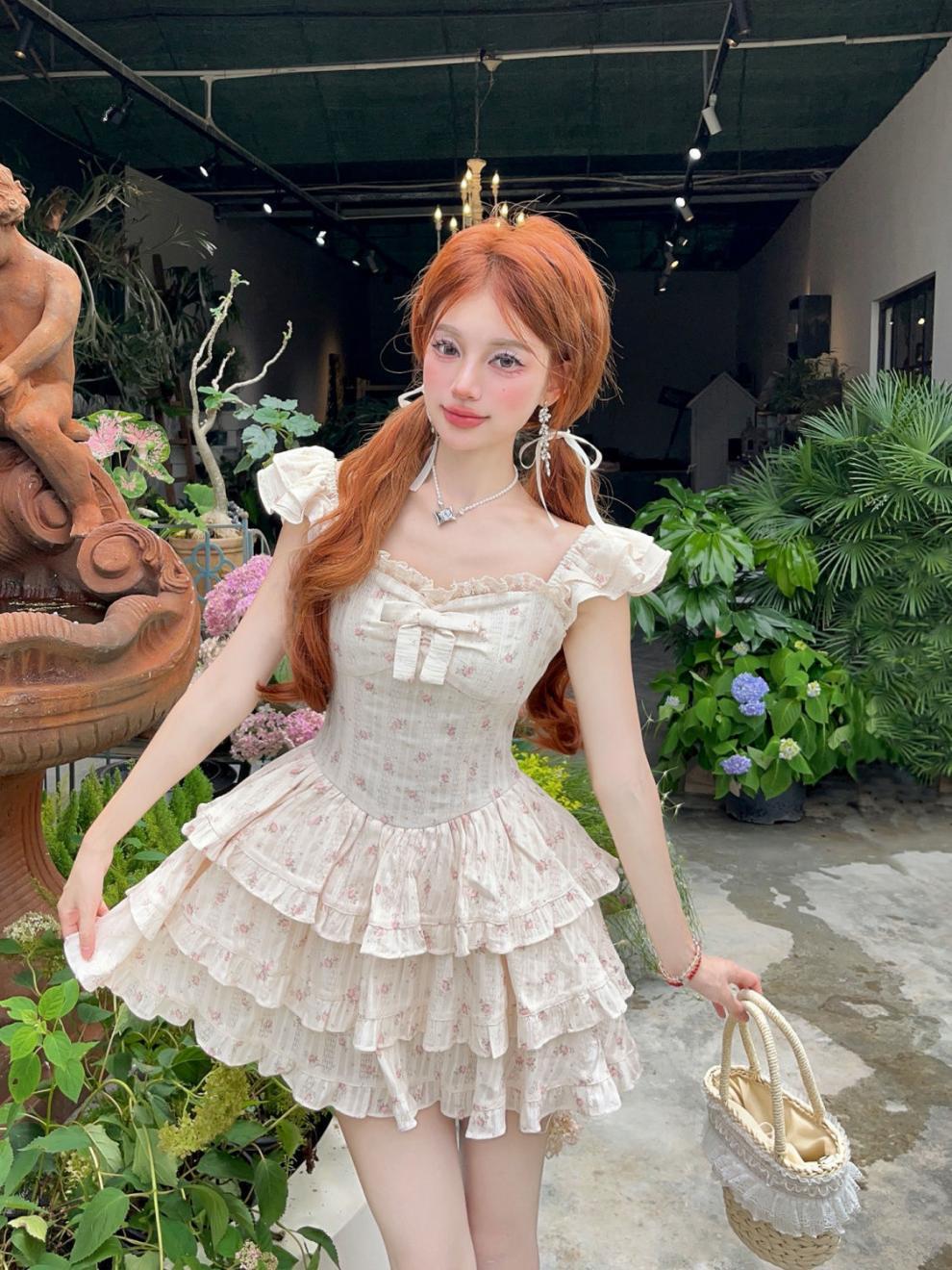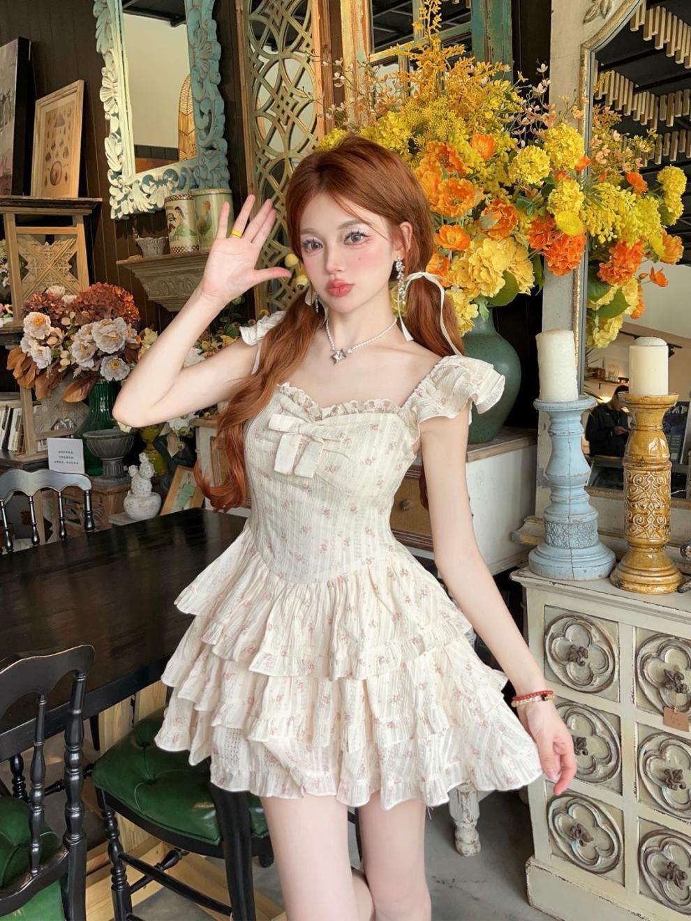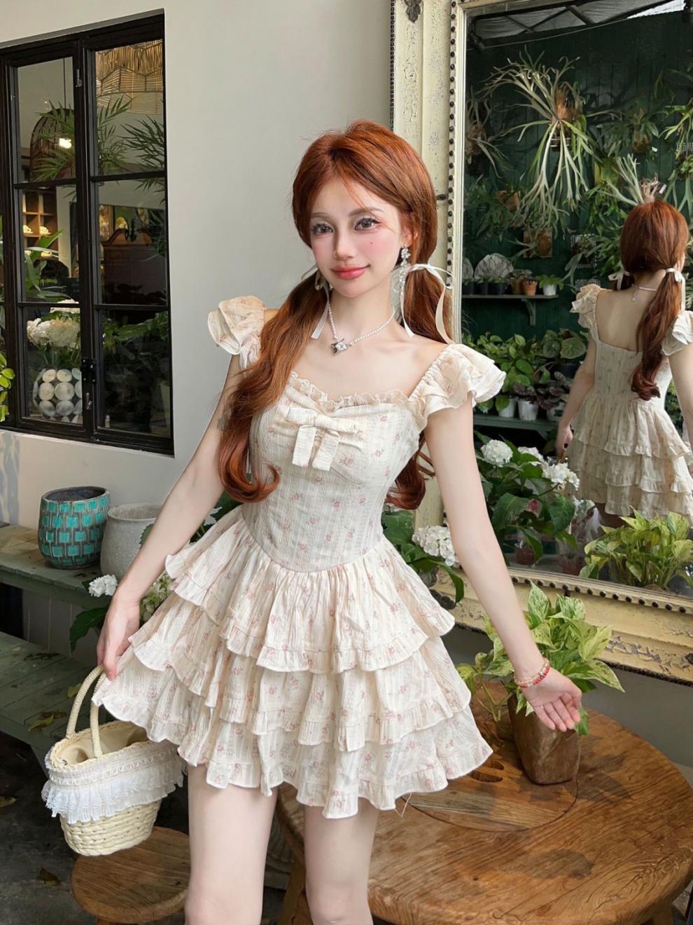 Пышная юбка принцессы с пышными рукавами для перерыва на чай, супер сказочный бант на талии, лесное платье с цветочным принтом, женское новое летнее платье