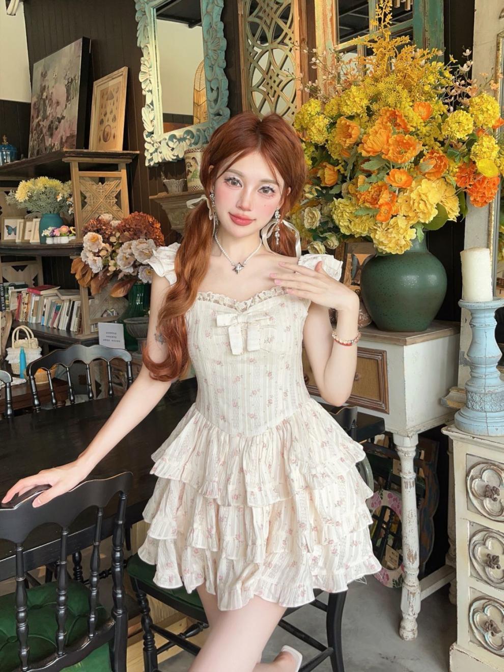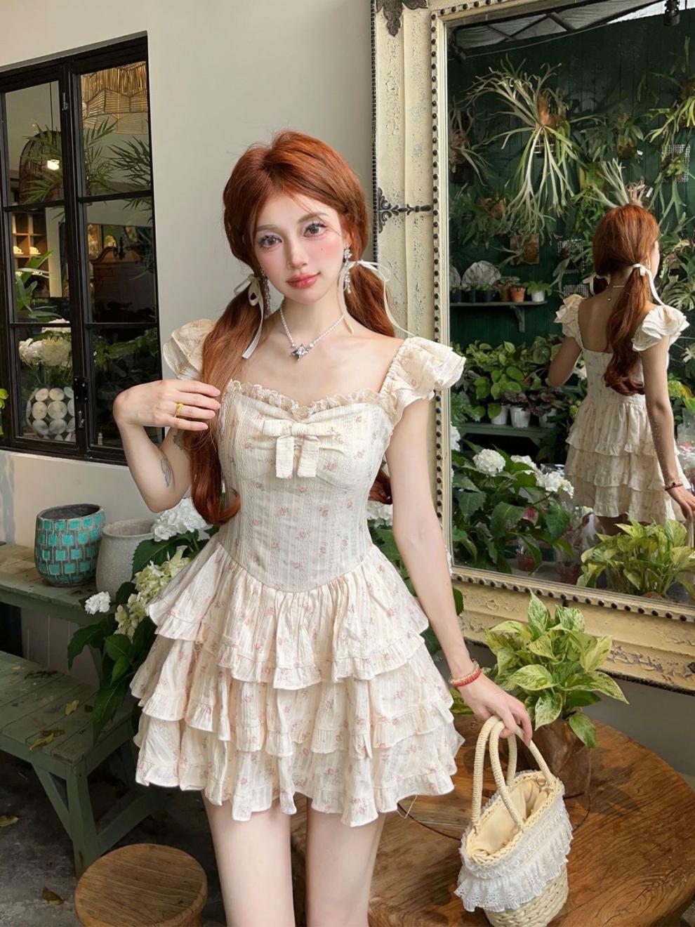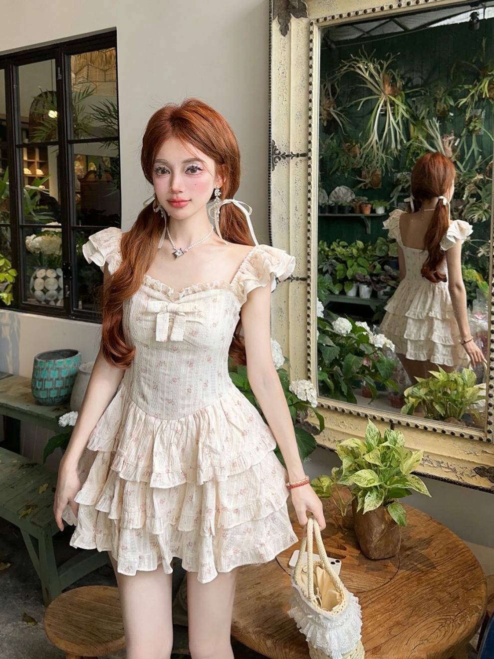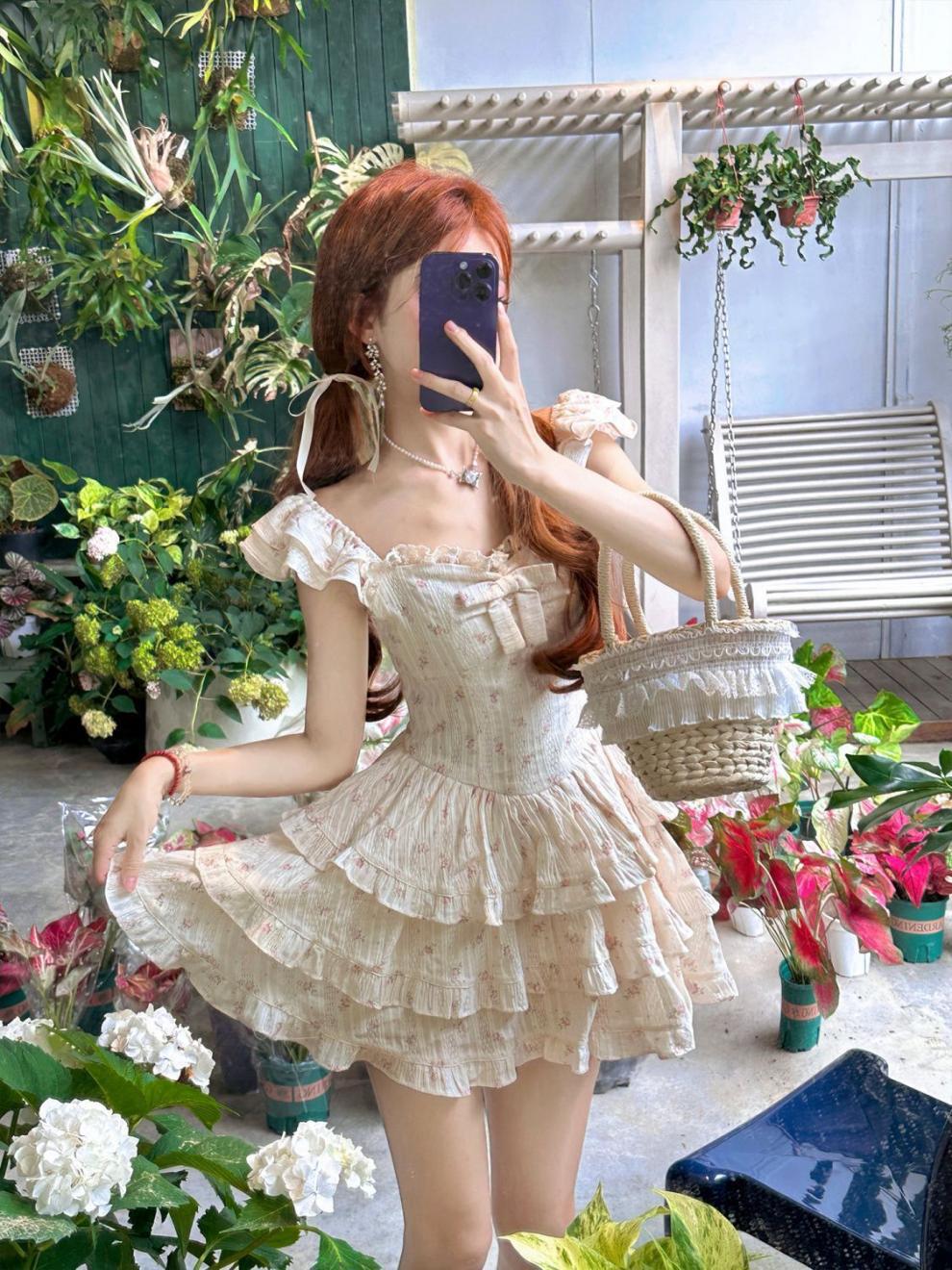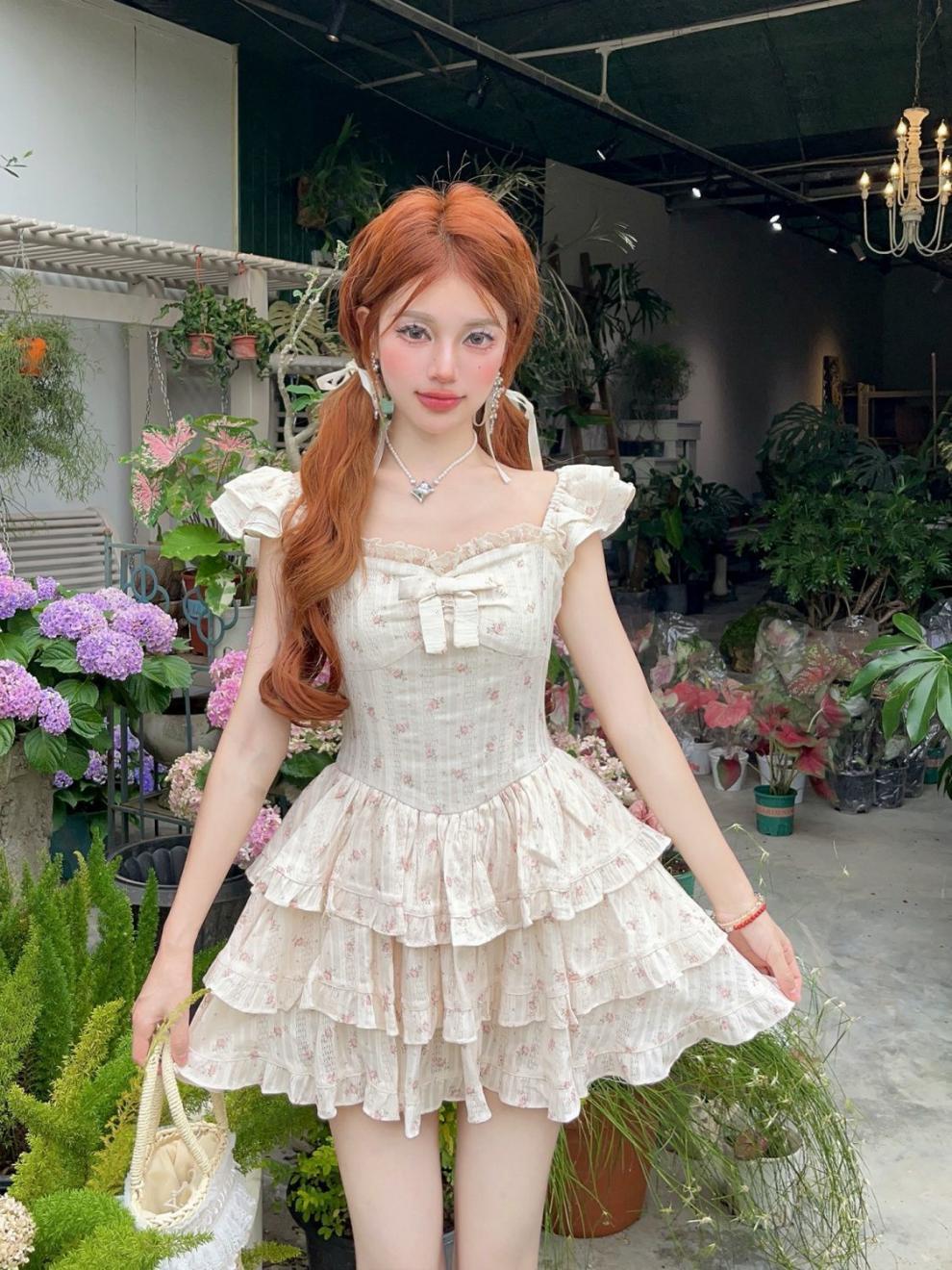 Пышная юбка принцессы с пышными рукавами для перерыва на чай, супер сказочный бант на талии, лесное платье с цветочным принтом, женское новое летнее платье