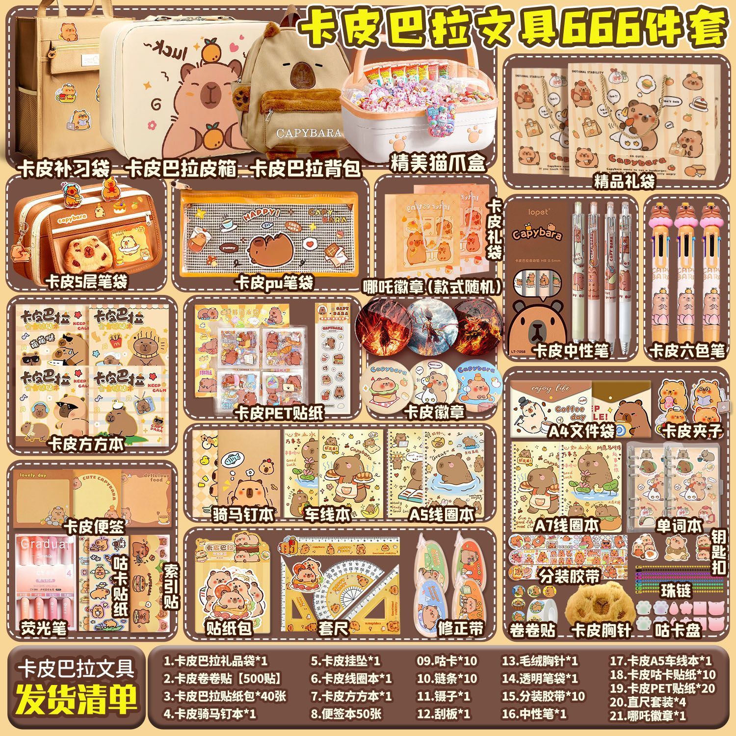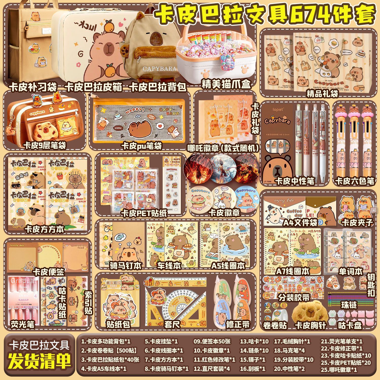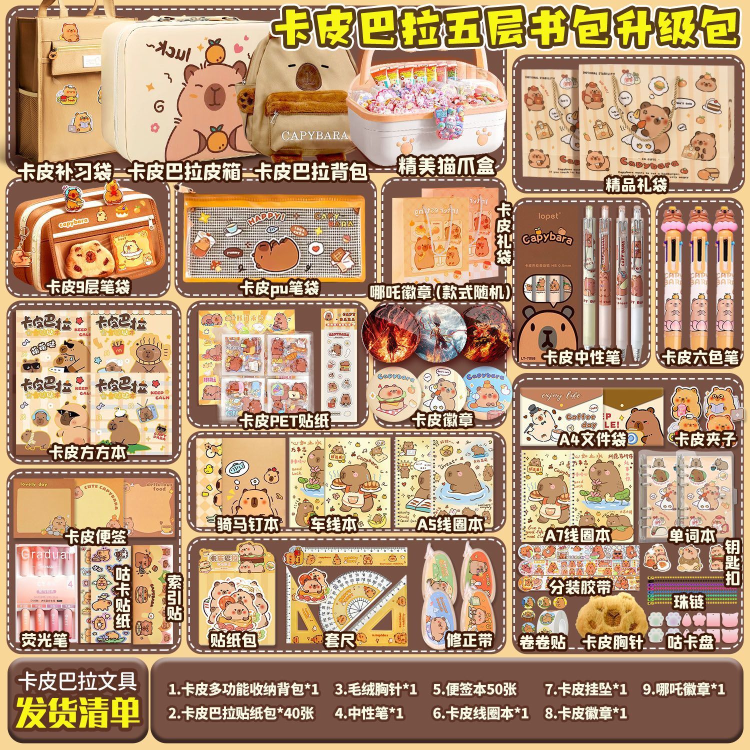 [Kapibala 666] набор штук + подарочный пакет Kapibala; [Kapibala 670] Бесплатный девятислойный пенал/коробка для хранения/квадратный блокнот; [Kapibala 672] Бесплатный девятирядный пенал/трехслойная коробка/квадратная книга; [Kapibala 690] Бесплатный роскошный чемодан Kapibala + девятирядный пенал; 【Kapibala 691】Бесплатный роскошный чемодан Kapibala + многофункциональная школьная сумка; 【Kapibala 674】Бесплатный рюкзак для хранения Kapibala/Fangfangbook; [Kapibala 685] Бесплатный девятирядный пенал/коробка для кошачьих когтей/квадратный блокнот; [Kapibala 687] Бесплатный девятирядный пенал/сумка для хранения/квадратный блокнот; Пакет обновления сумки-руководства Kapibala; Комплект обновления 9-слойного тканевого пенала Kapibala; Пятислойная школьная сумка Kapibala, модернизированная сумка