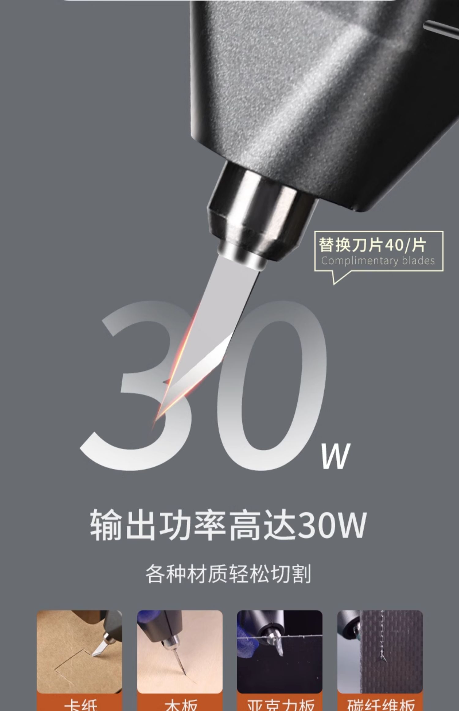 Серый — нож для резки + 40 лезвий + зарядная головка из нитрида галлия мощностью 30 Вт + индивидуальный ящик для хранения