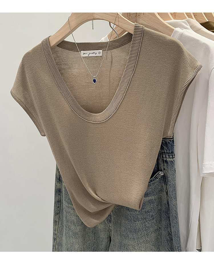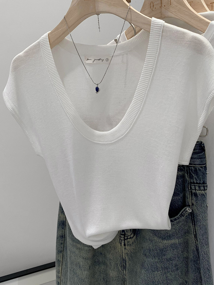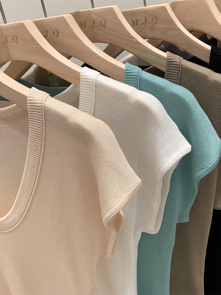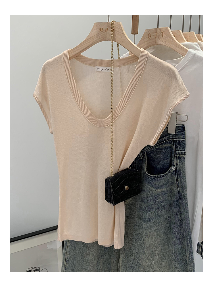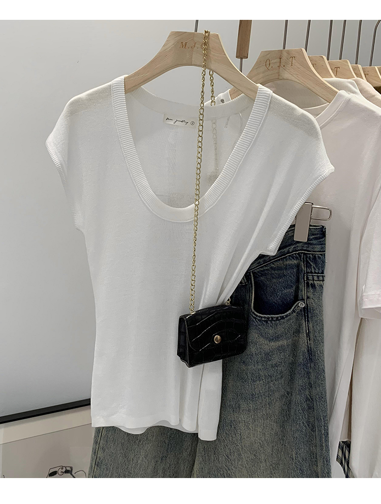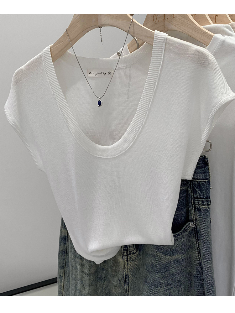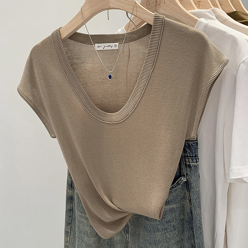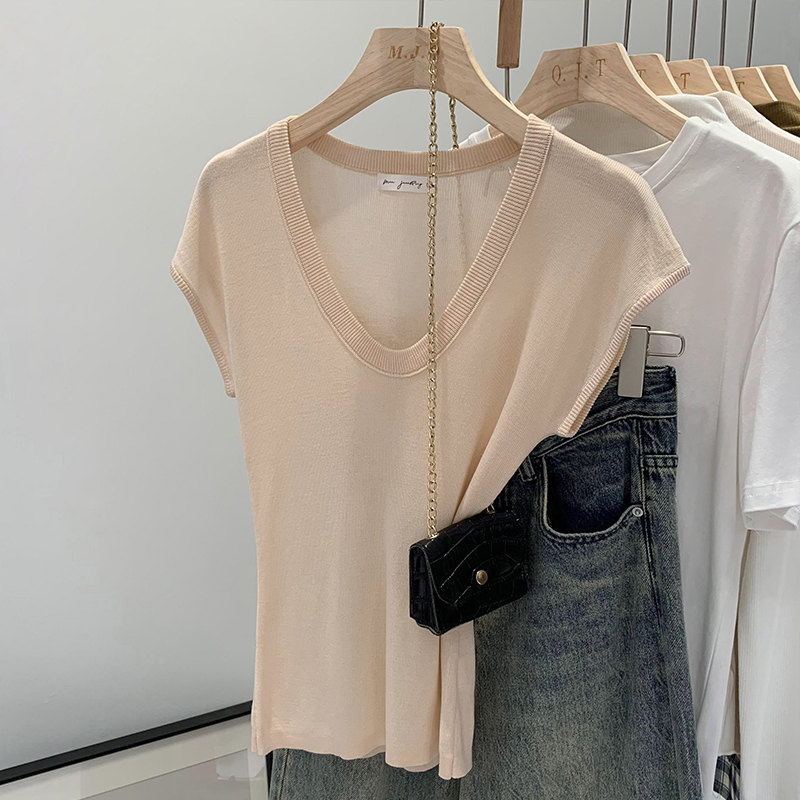 Женский трикотаж с U-образным вырезом в ленивом и непринужденном стиле, лето 2025, новая тонкая футболка с короткими рукавами, топ
