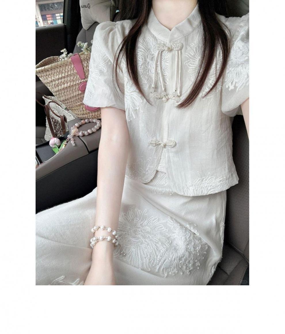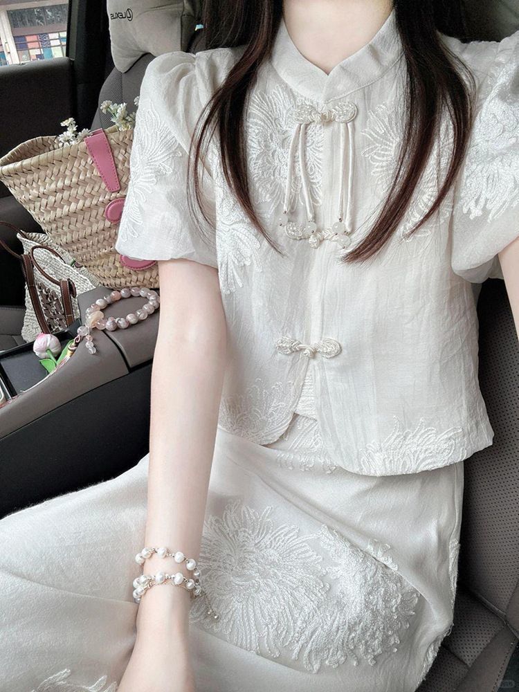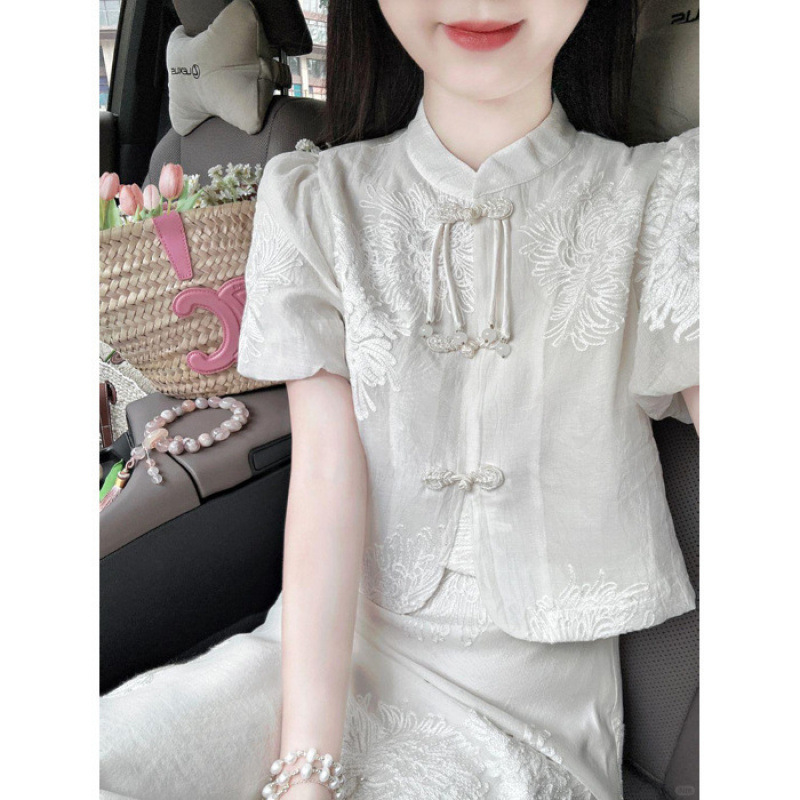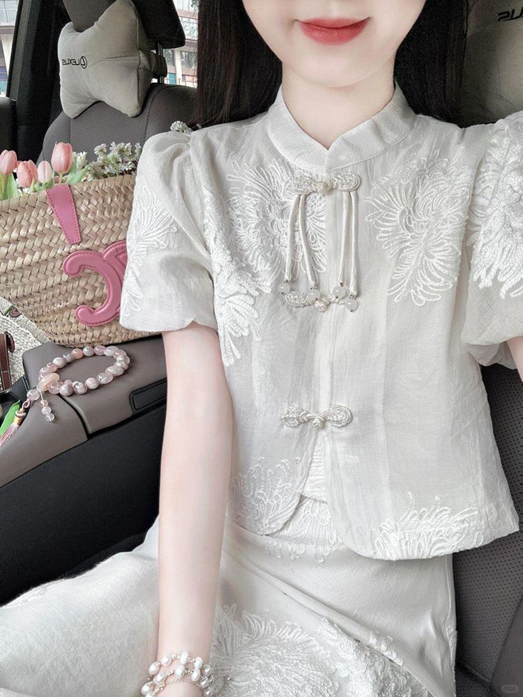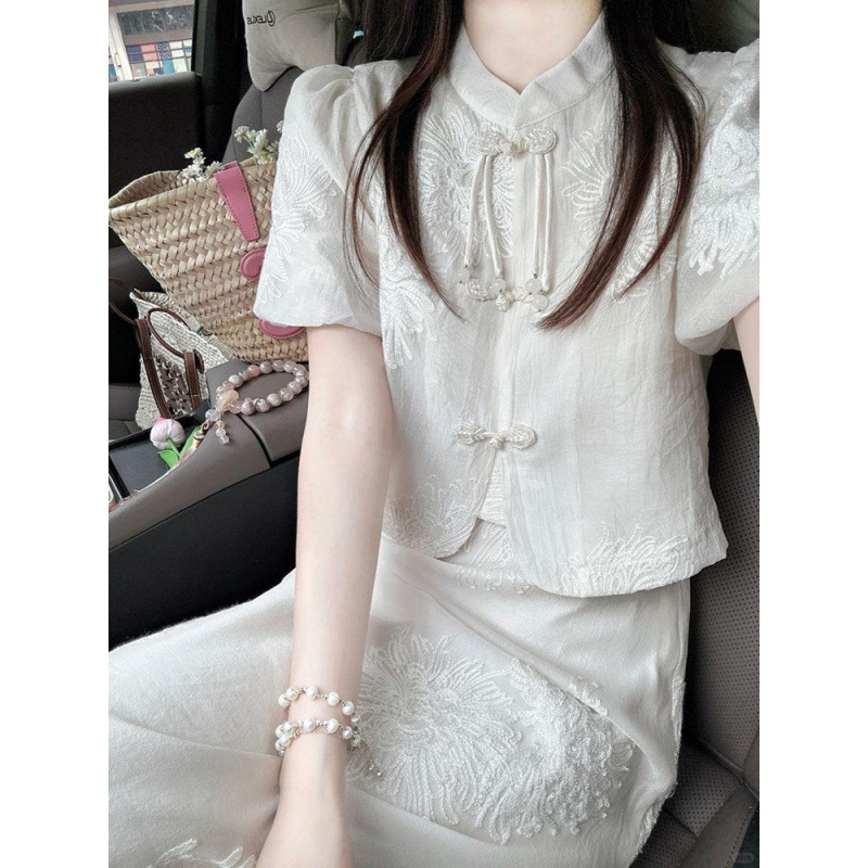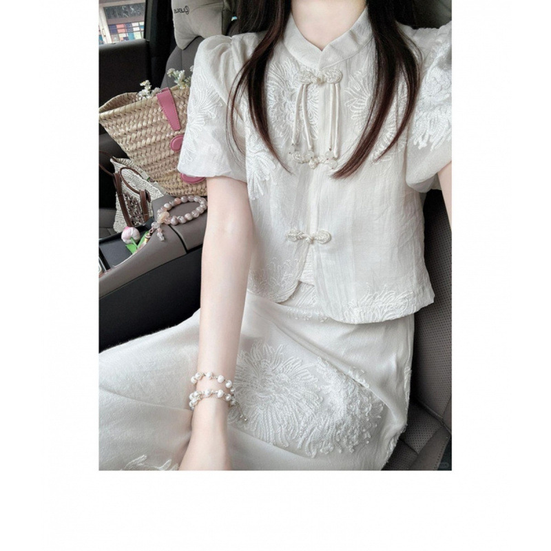 Новое китайское платье-чонсам белого цвета, улучшенная модель, лето 2025, для женщин, миниатюрная юбка, костюм из двух предметов