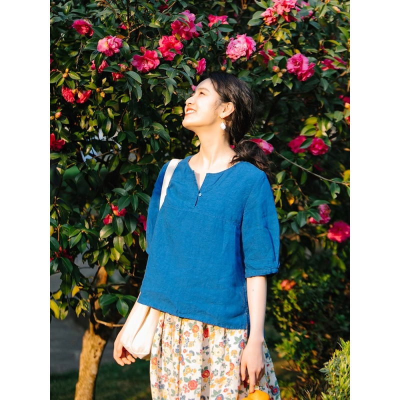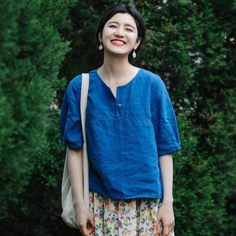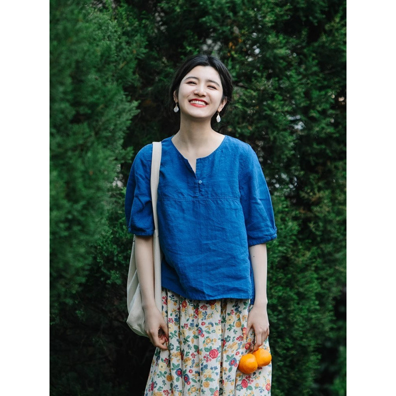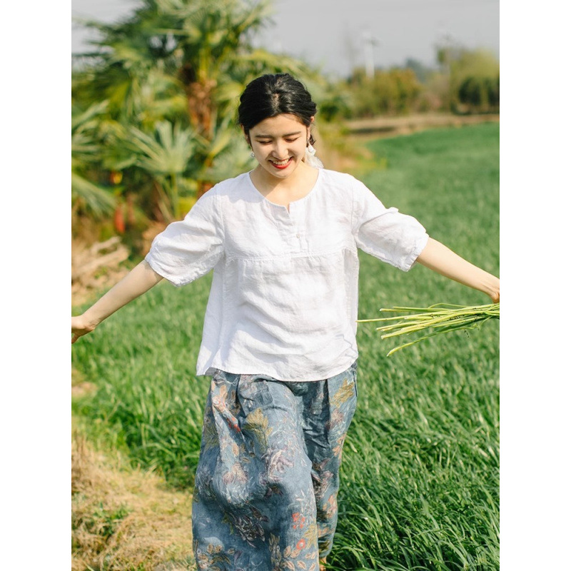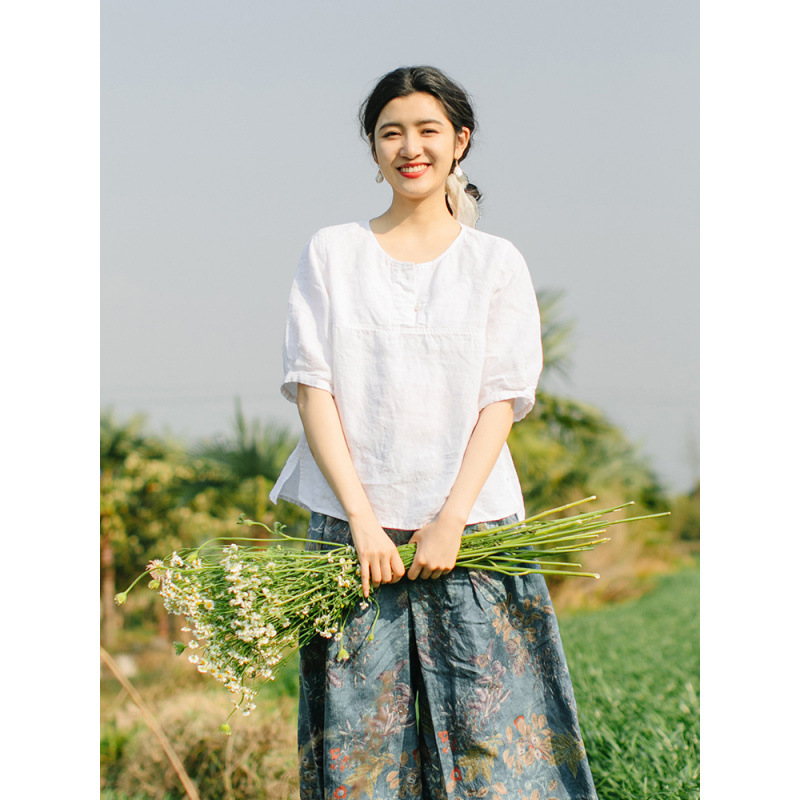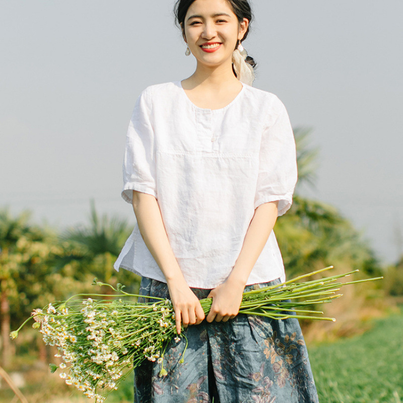 Женская хлопковая рубашка в ретро стиле, однотонная, летняя, тонкая, с круглым вырезом, свободного кроя, из хлопка и льна, 2025 года.