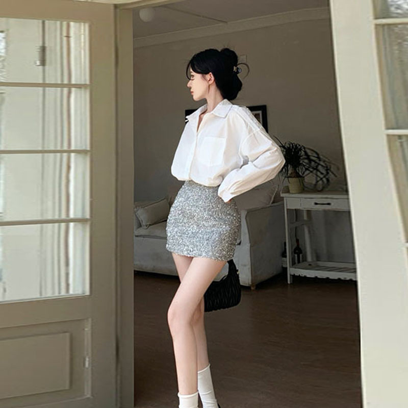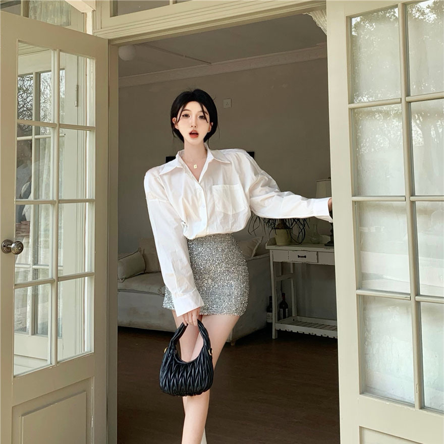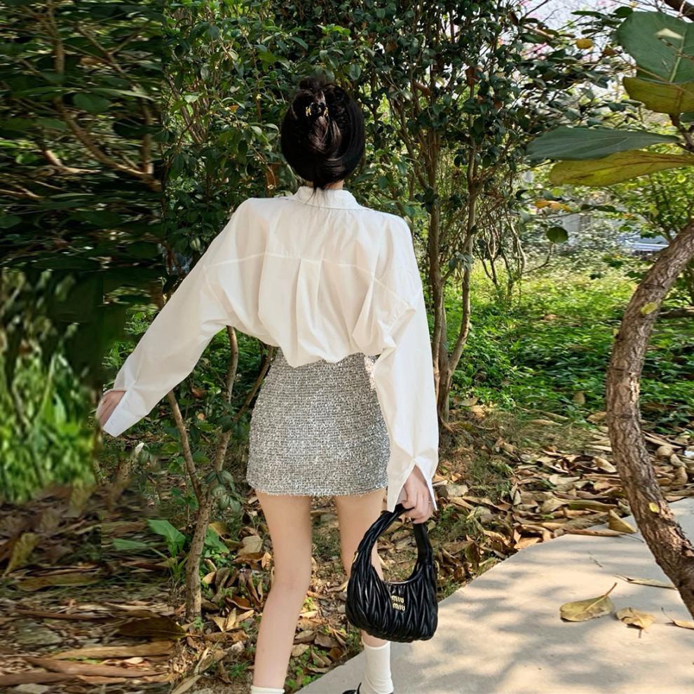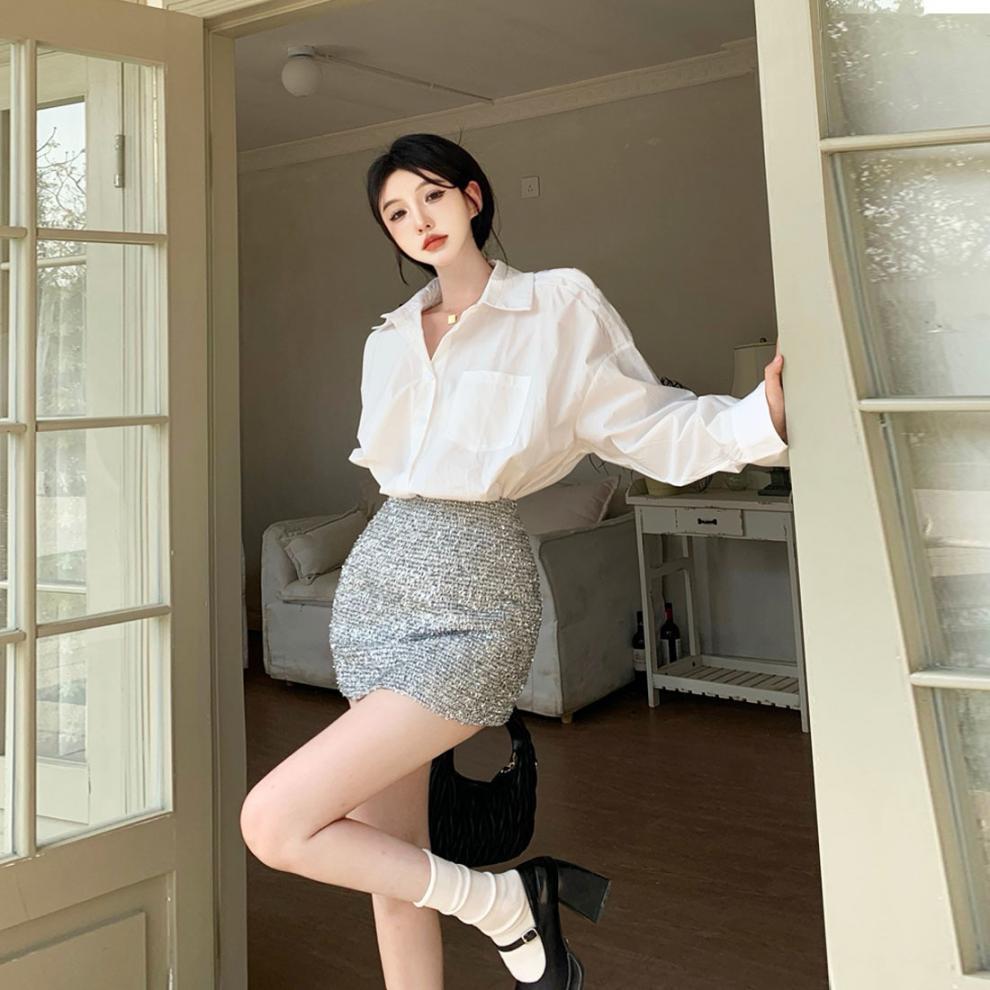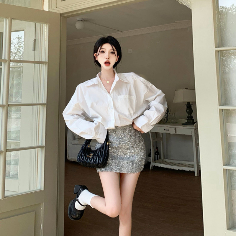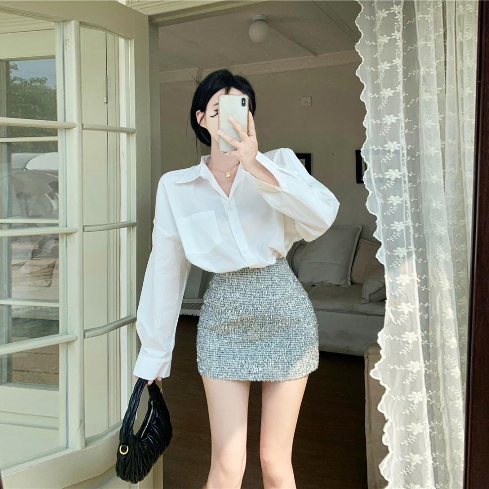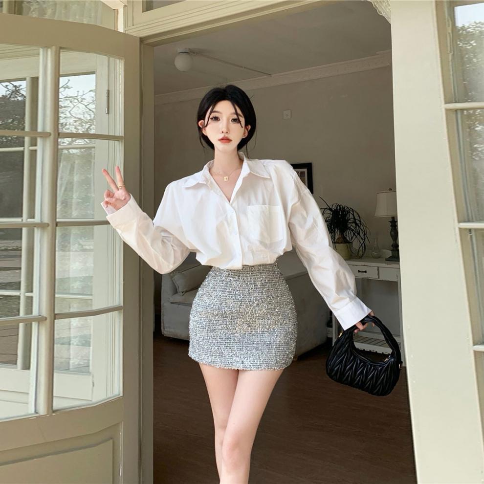 Новая весенняя универсальная свободная белая рубашка с длинными рукавами для женщин с ярким шелковым утягивающим эффектом, короткая юбка с высокой талией, закрывающая бедра, комплект из двух предметов для горячих девушек