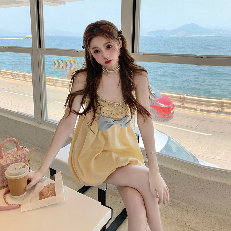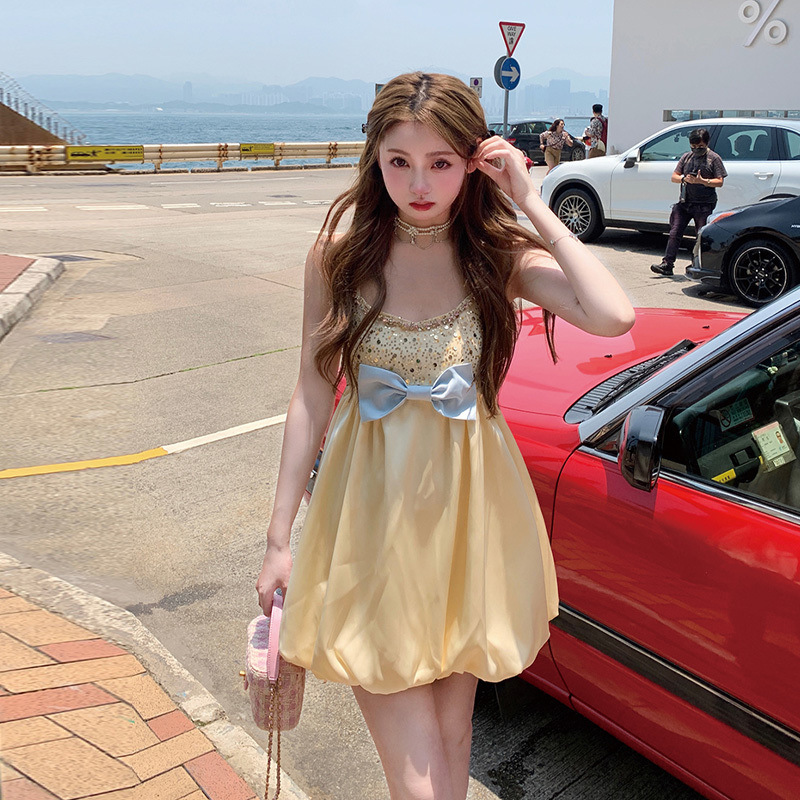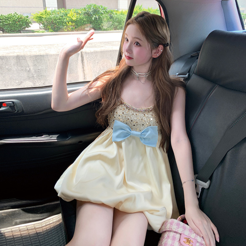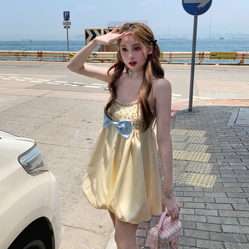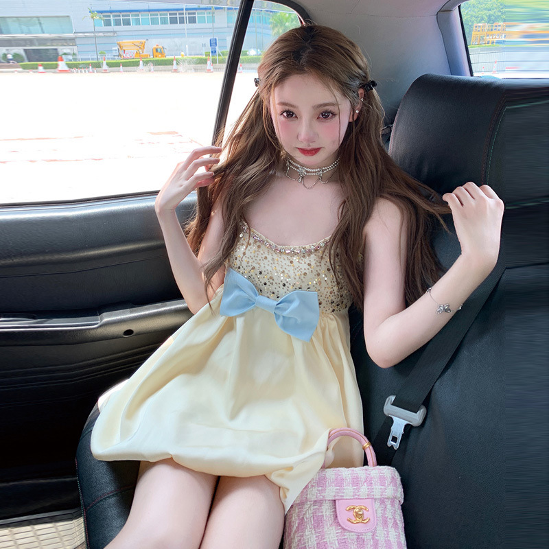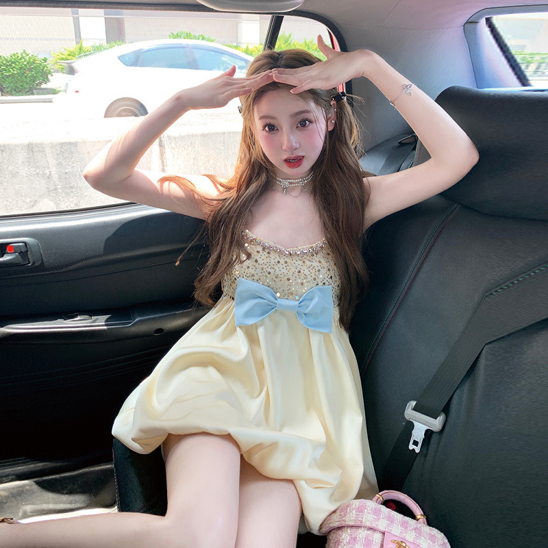 Прочное платье на тонких бретельках с бантом и стразами во французском стиле для миниатюрных женщин, милое пышное бальное платье принцессы на лето.