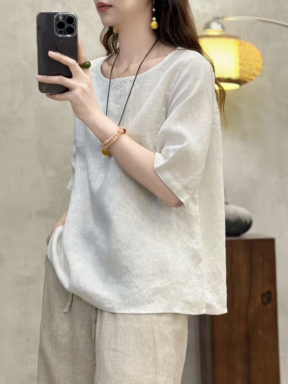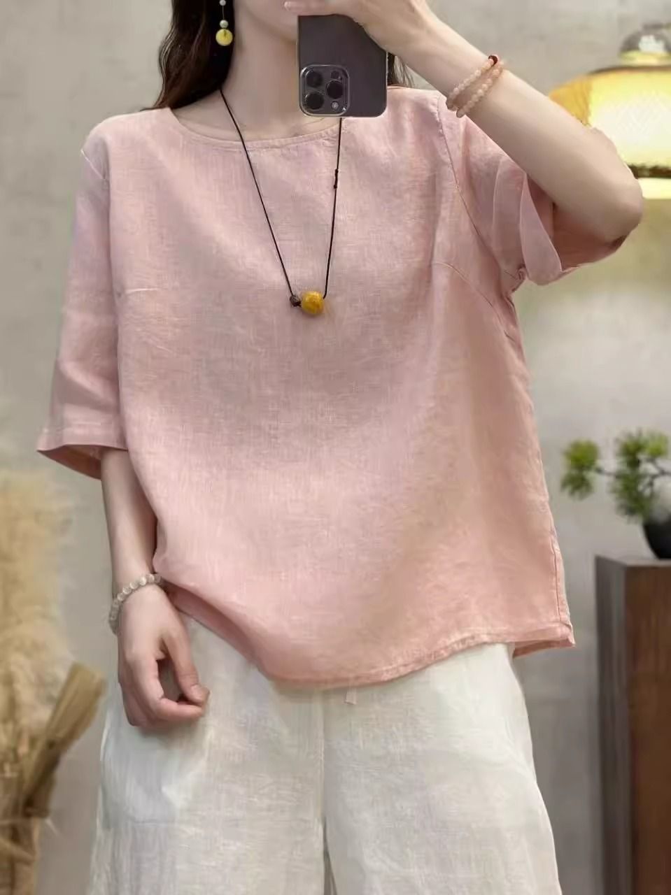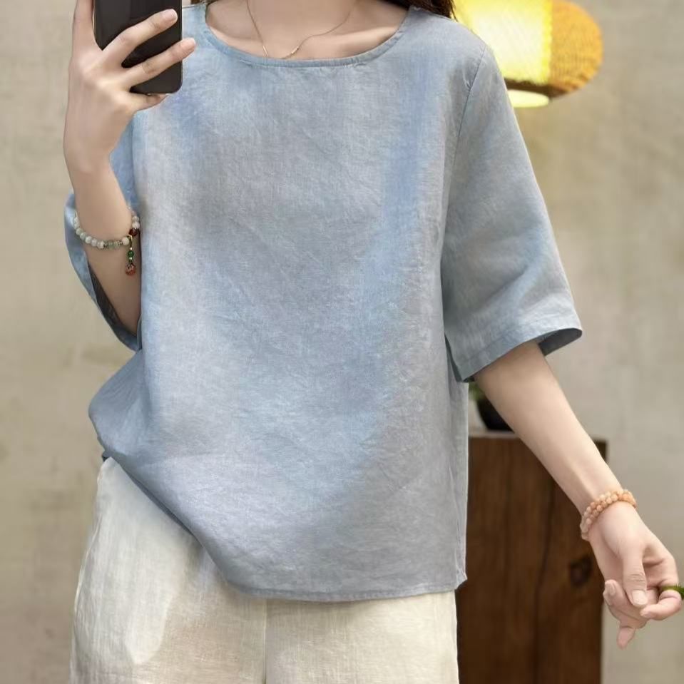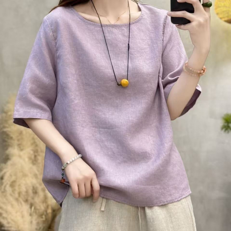2025 новый летний стиль, супер дышащая льняная французская футболка из конопли, однотонная футболка с короткими рукавами, свободный утягивающий топ для женщин