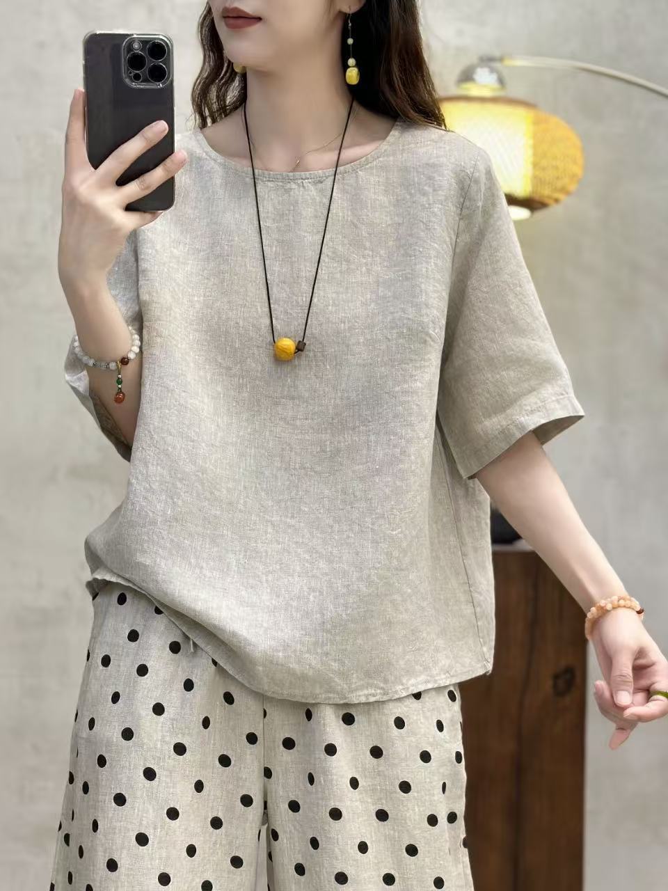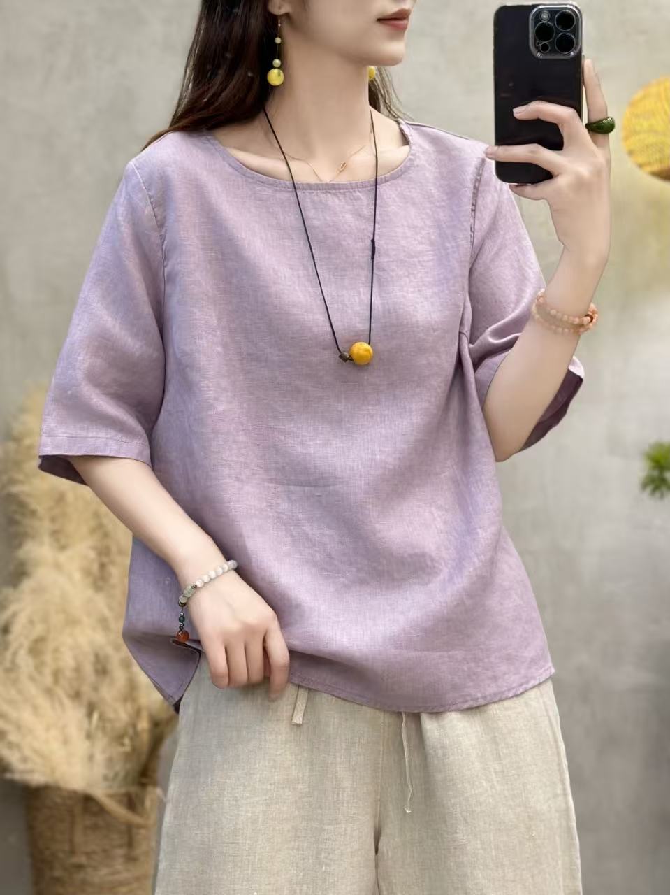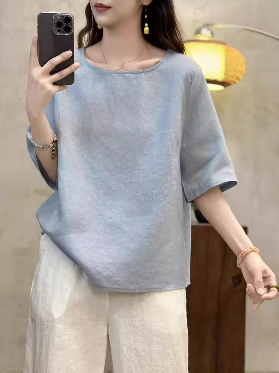 2025 новый летний стиль, супер дышащая льняная французская футболка из конопли, однотонная футболка с короткими рукавами, свободный утягивающий топ для женщин