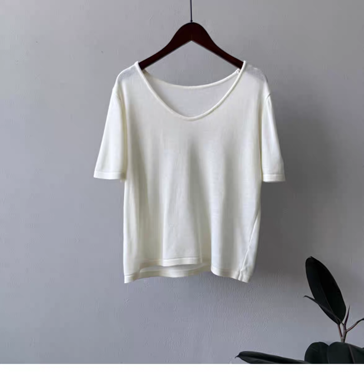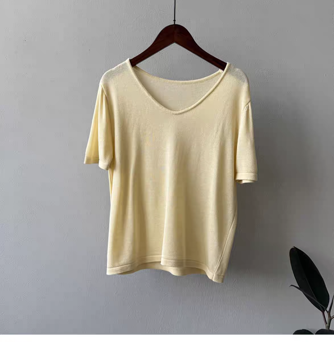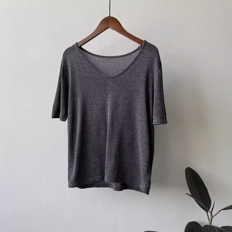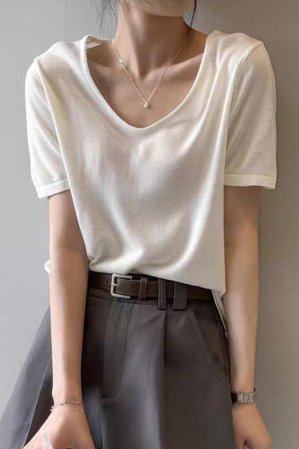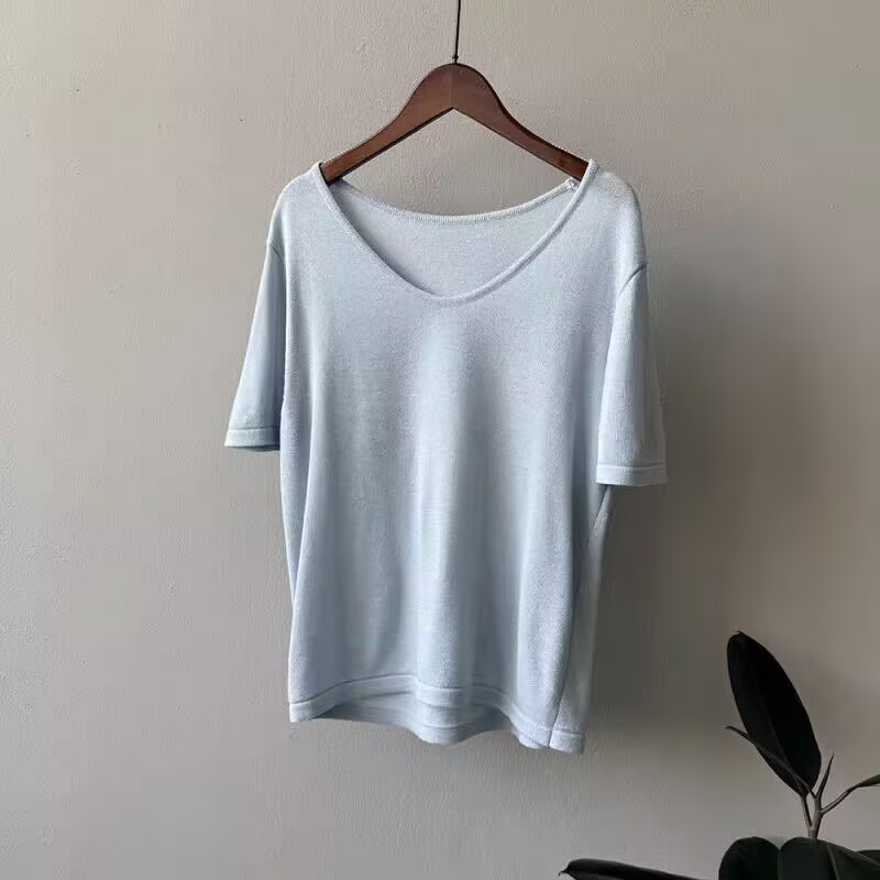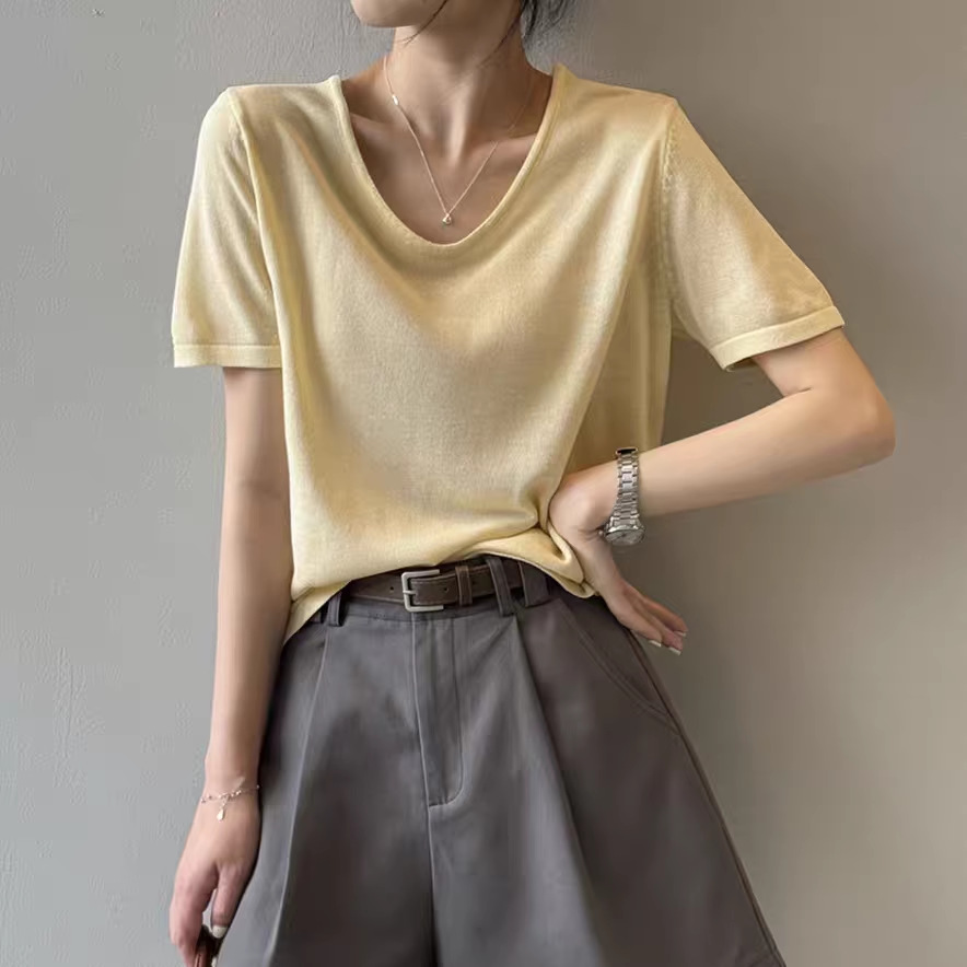 Женская майка в гонконгском стиле/футболка из тенселя с коротким рукавом, однотонная, свободная, тонкая, с V-образным вырезом, стройнящая, элегантная базовая одежда