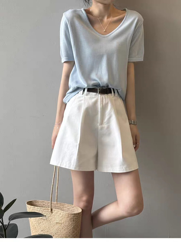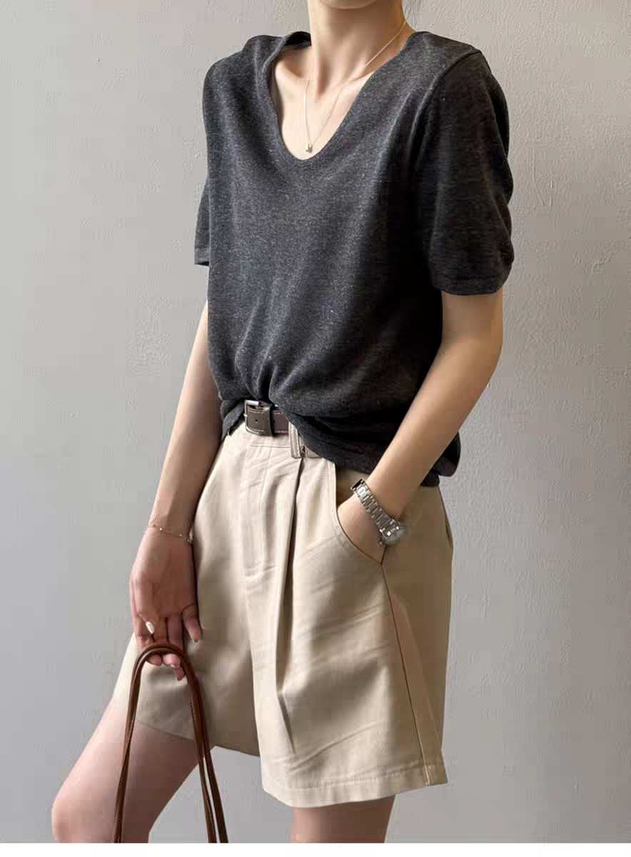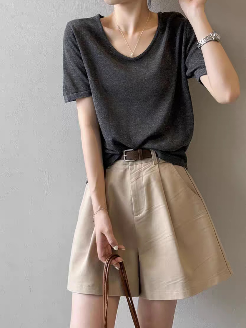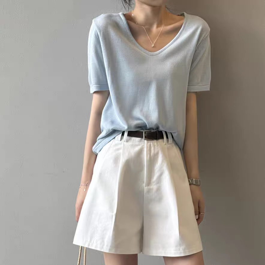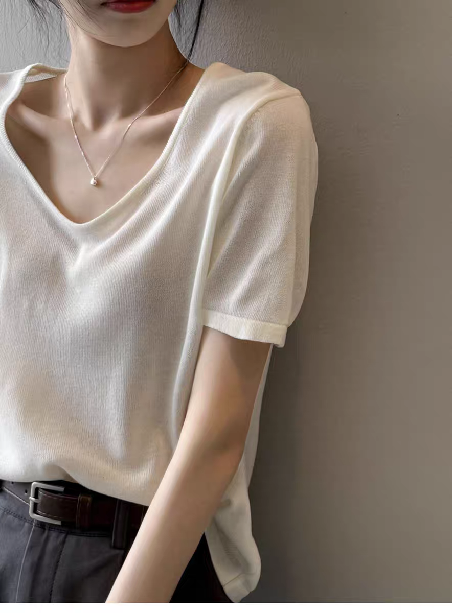 Женская майка в гонконгском стиле/футболка из тенселя с коротким рукавом, однотонная, свободная, тонкая, с V-образным вырезом, стройнящая, элегантная базовая одежда
