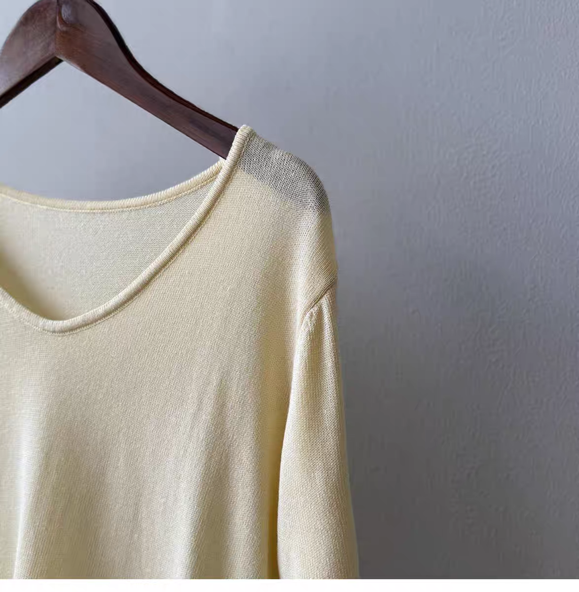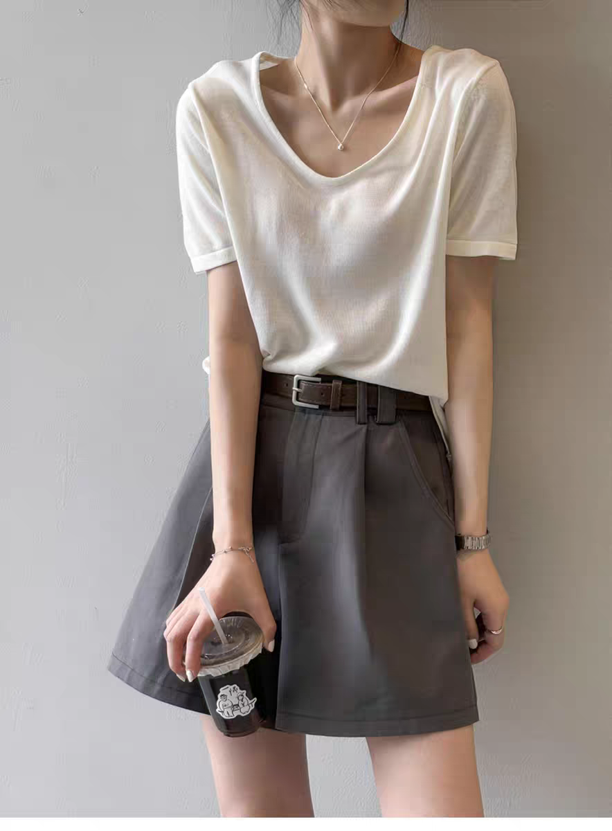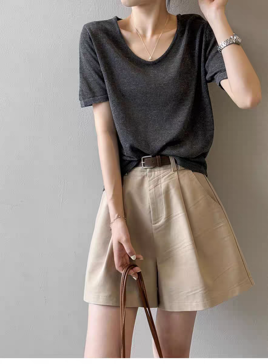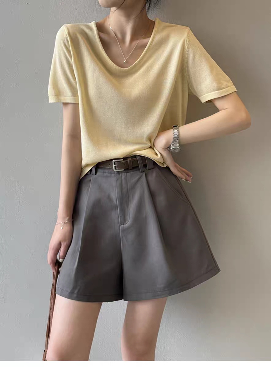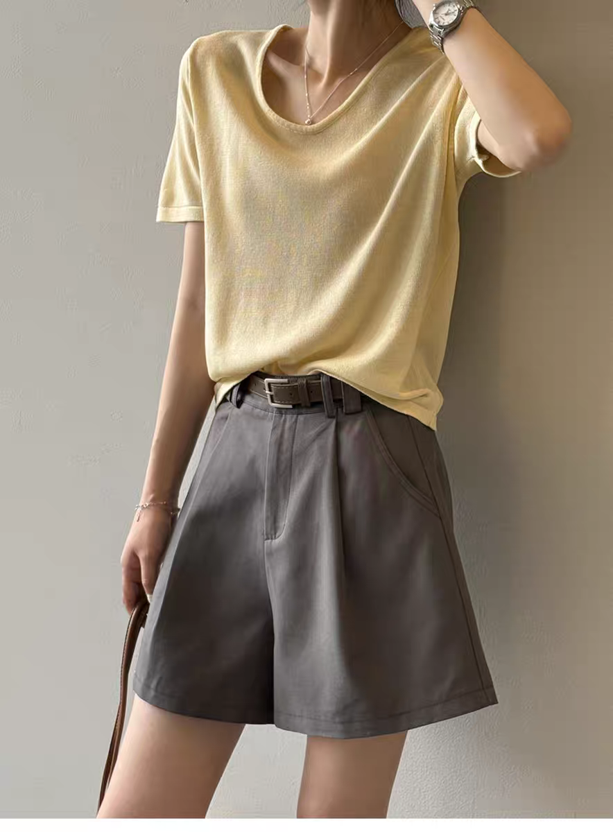 Женская майка в гонконгском стиле/футболка из тенселя с коротким рукавом, однотонная, свободная, тонкая, с V-образным вырезом, стройнящая, элегантная базовая одежда
