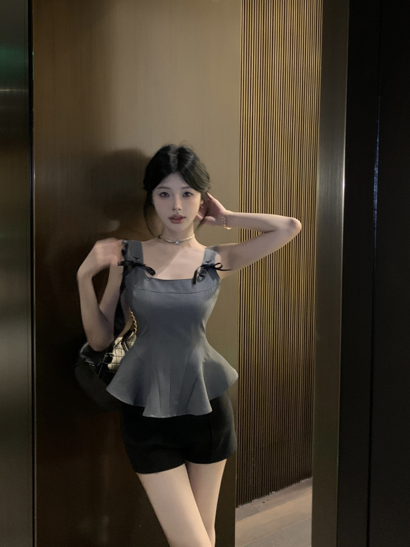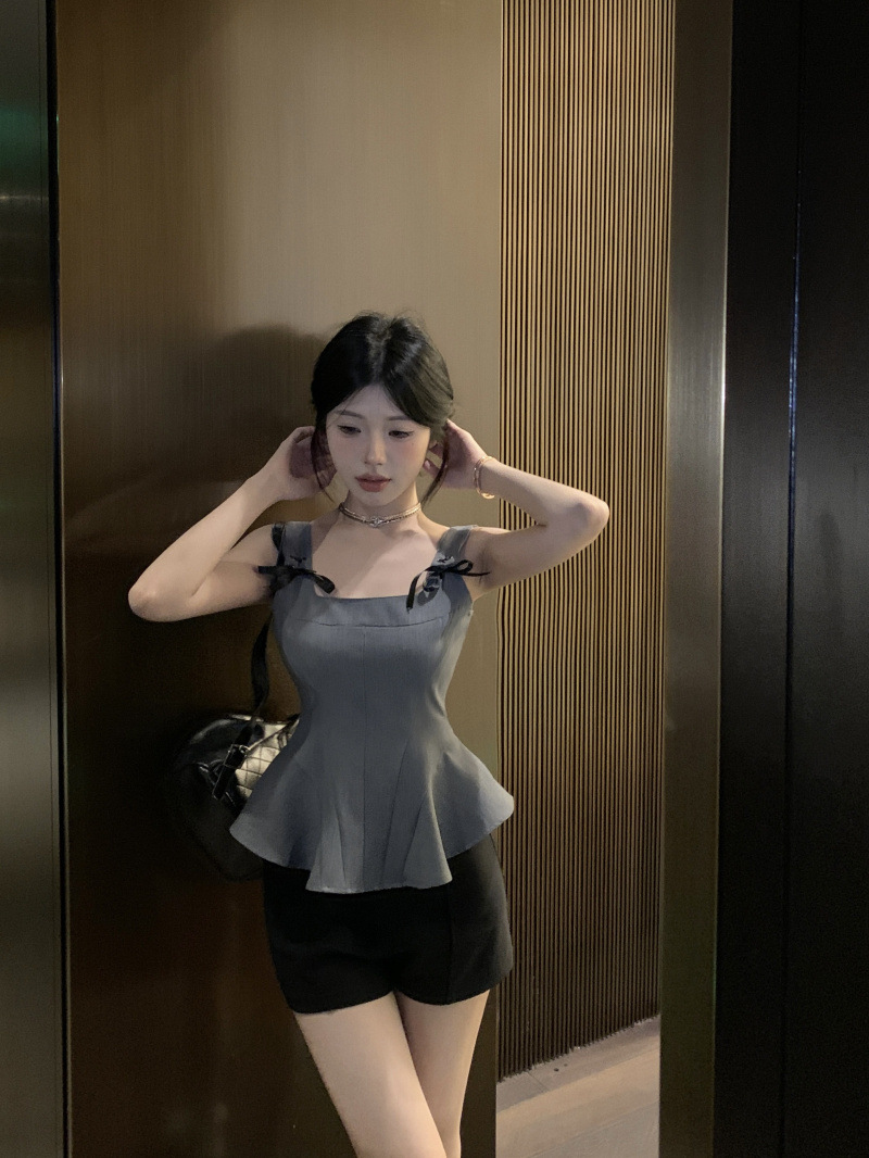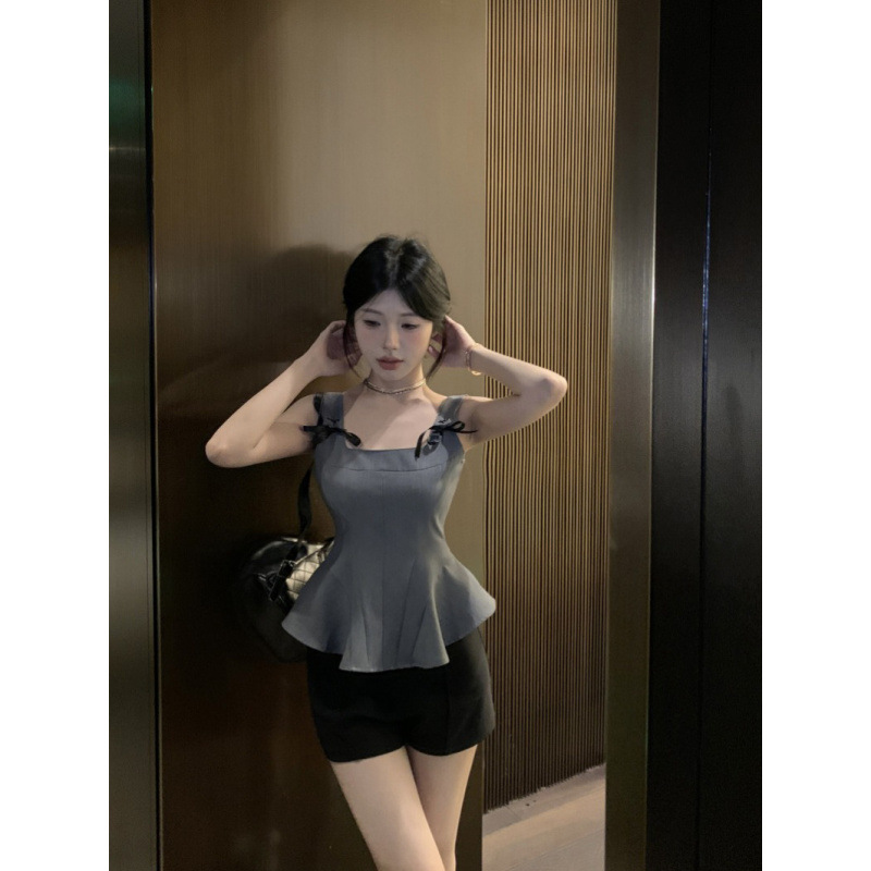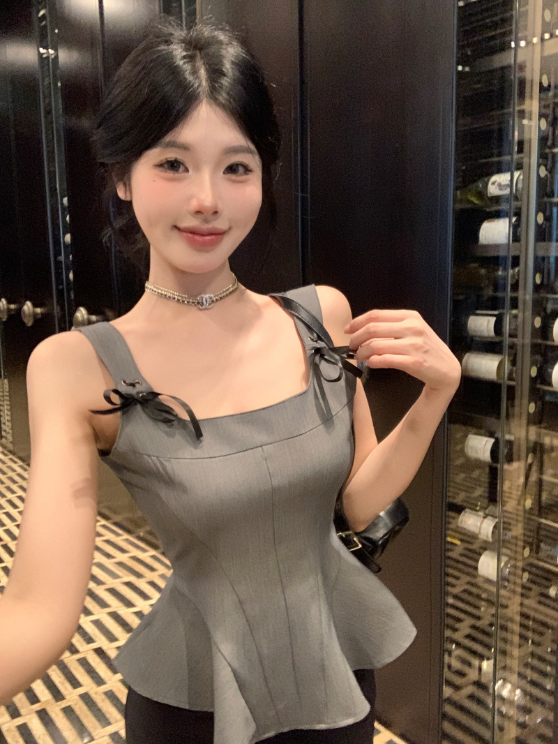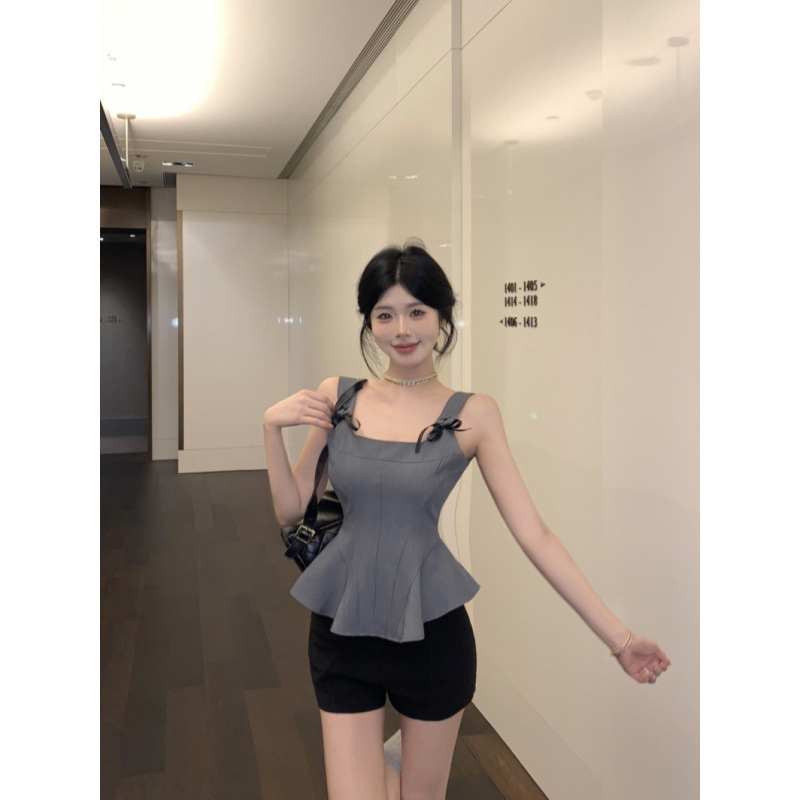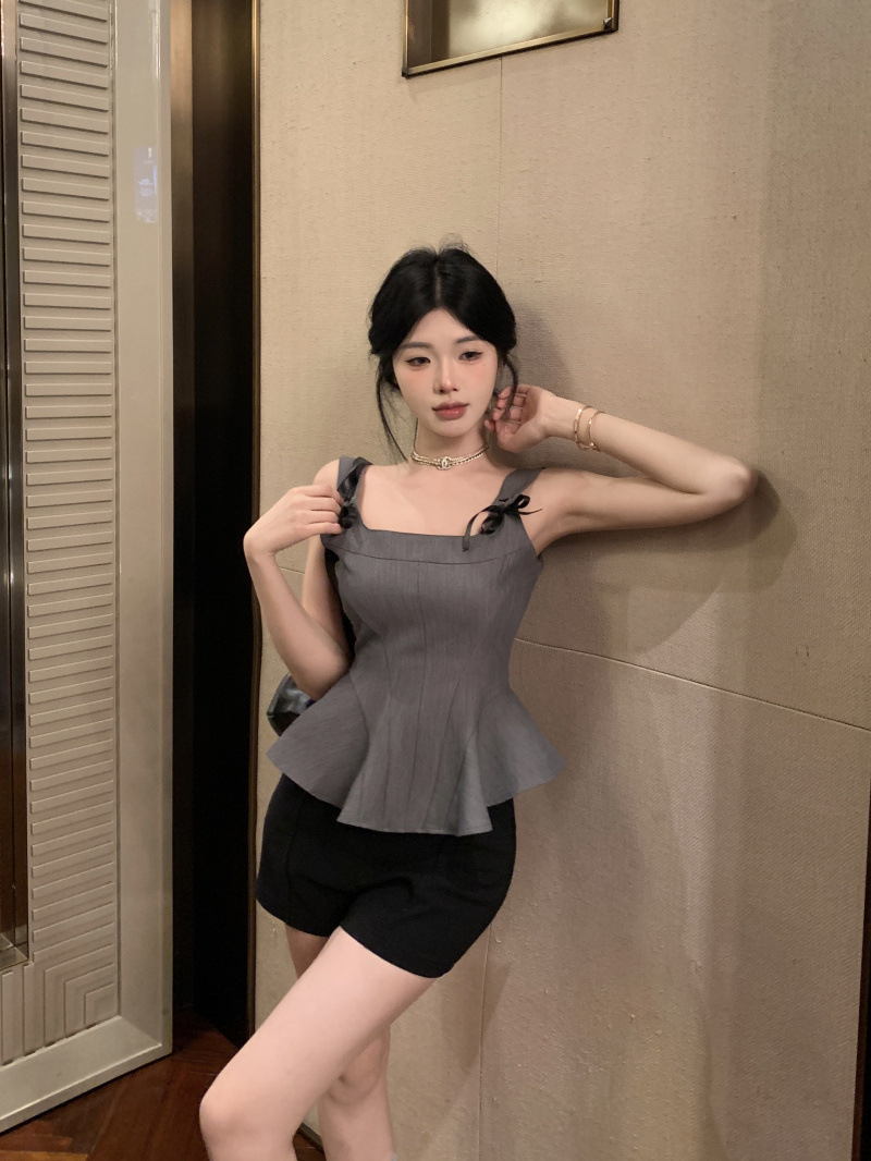 Ретро серая рубашка с рюшами и бантом на шнуровке, женская летняя популярная тонкая рубашка без рукавов с квадратным вырезом для девочек