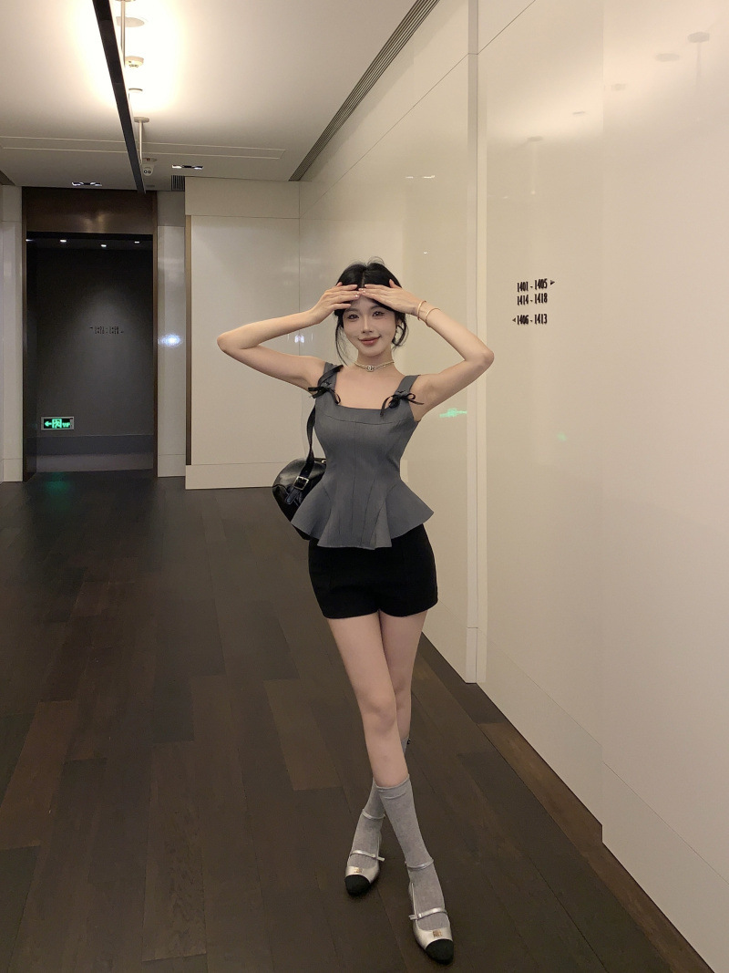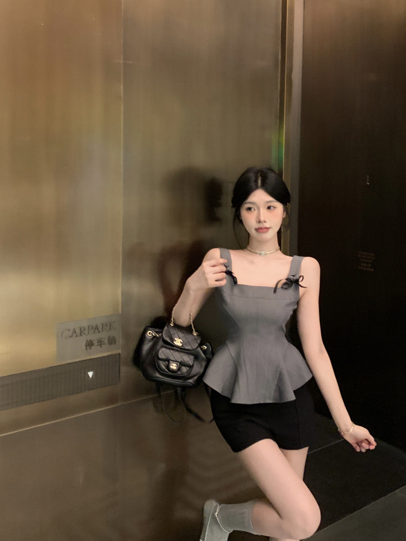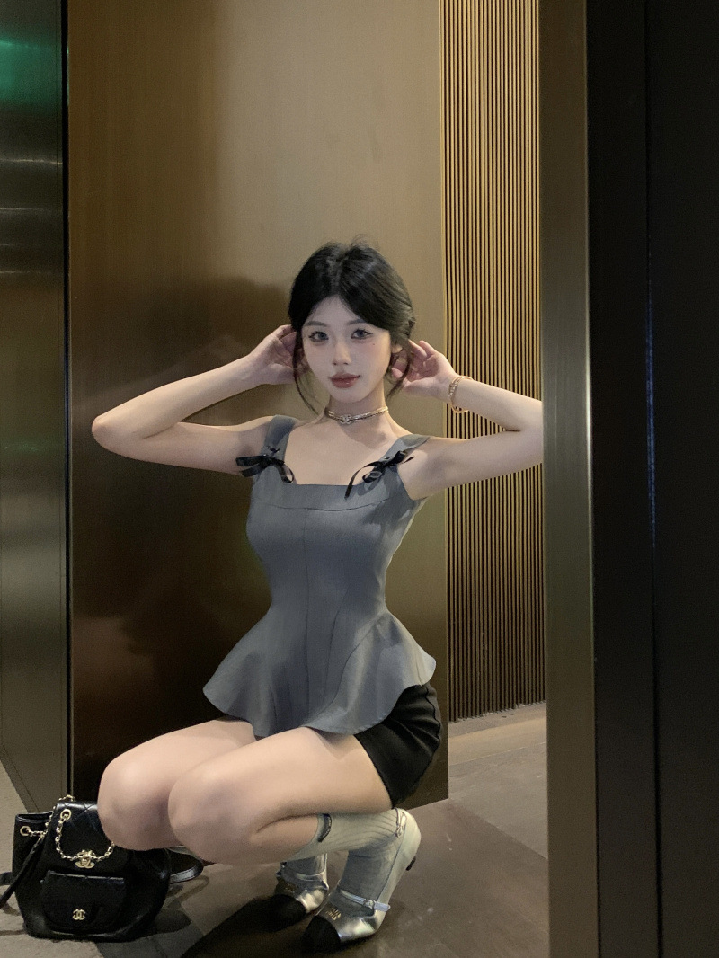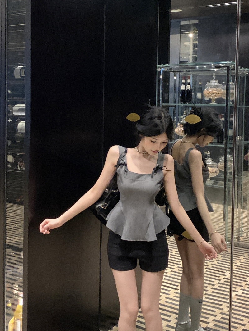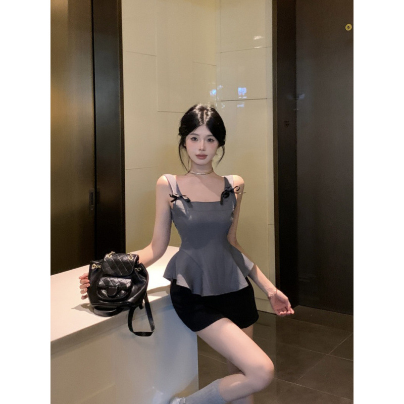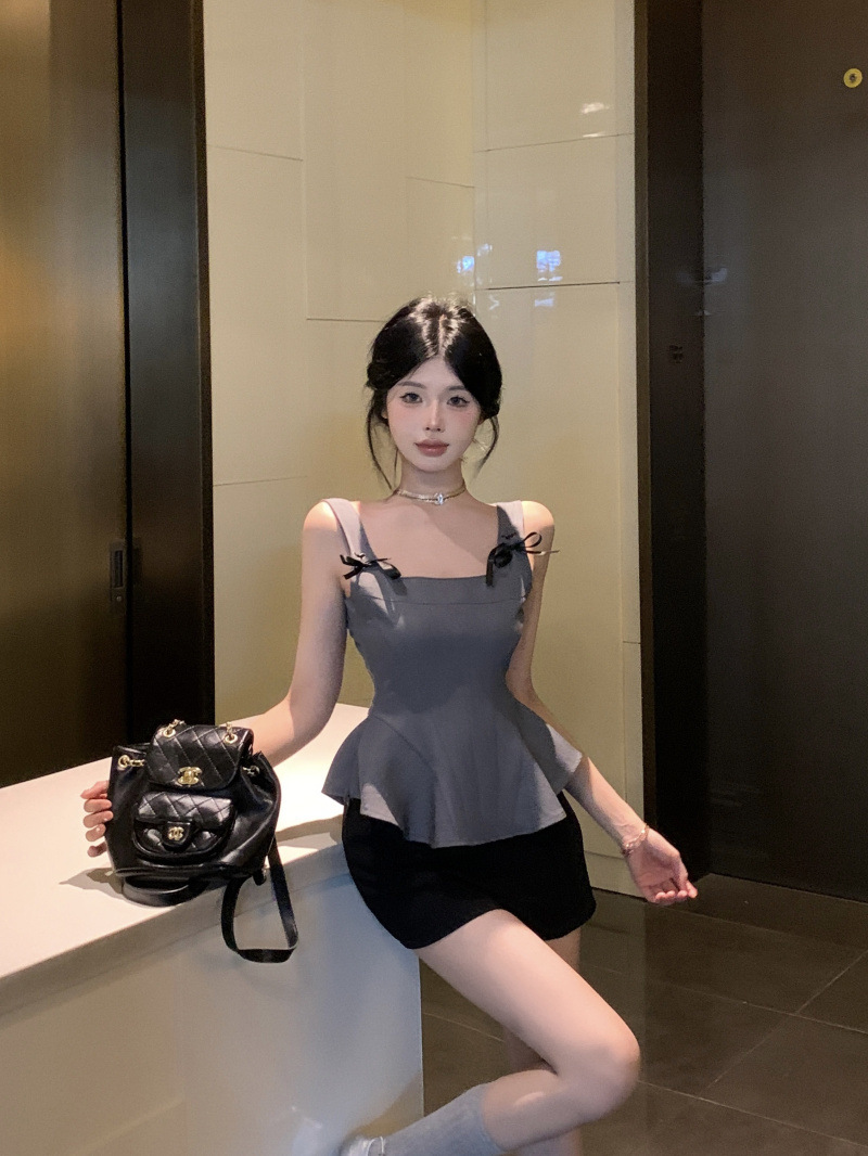 Ретро серая рубашка с рюшами и бантом на шнуровке, женская летняя популярная тонкая рубашка без рукавов с квадратным вырезом для девочек