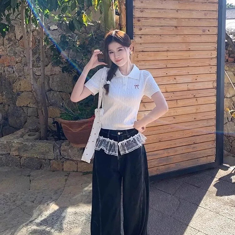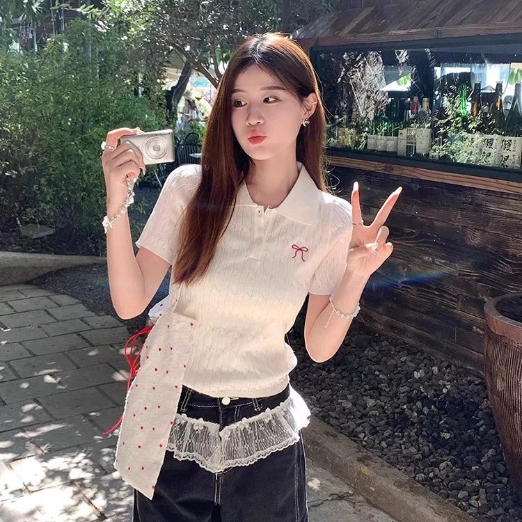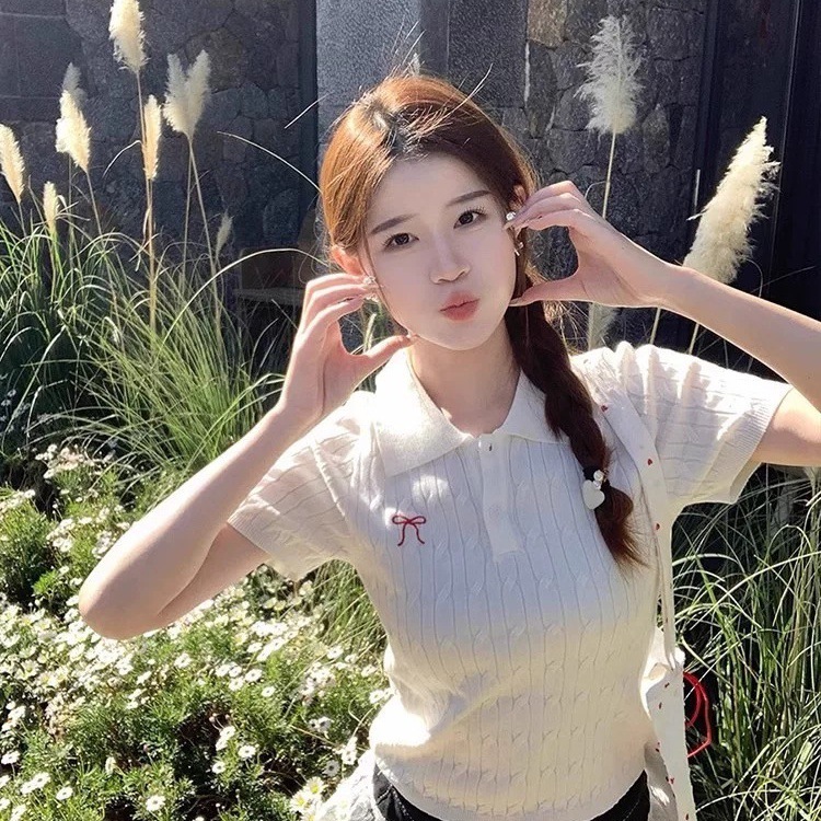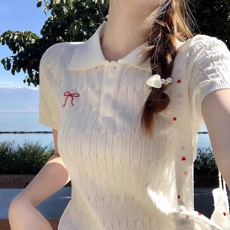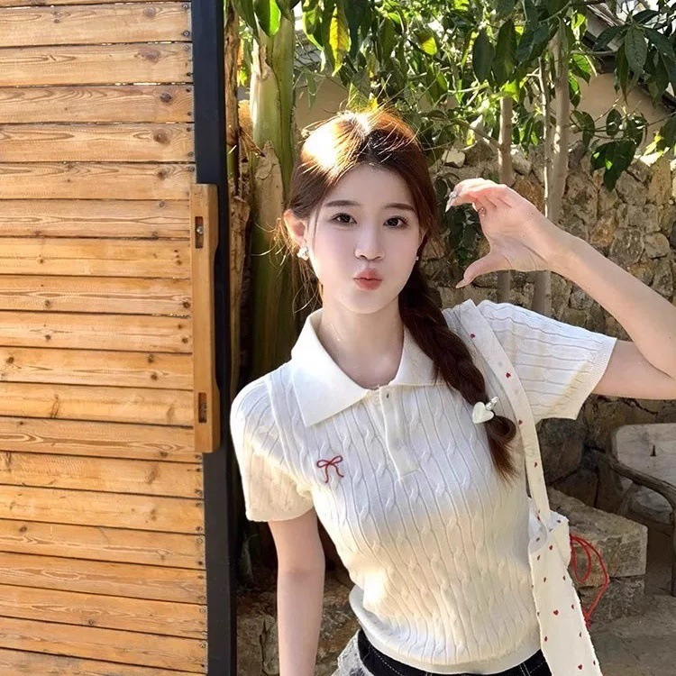 Корейская футболка с короткими рукавами и воротником-поло с милым бантом для женщин, весенний новый стиль с сексуальным тонким топом