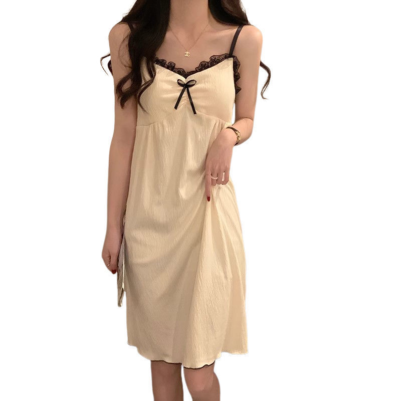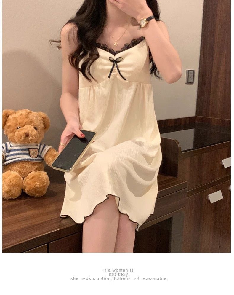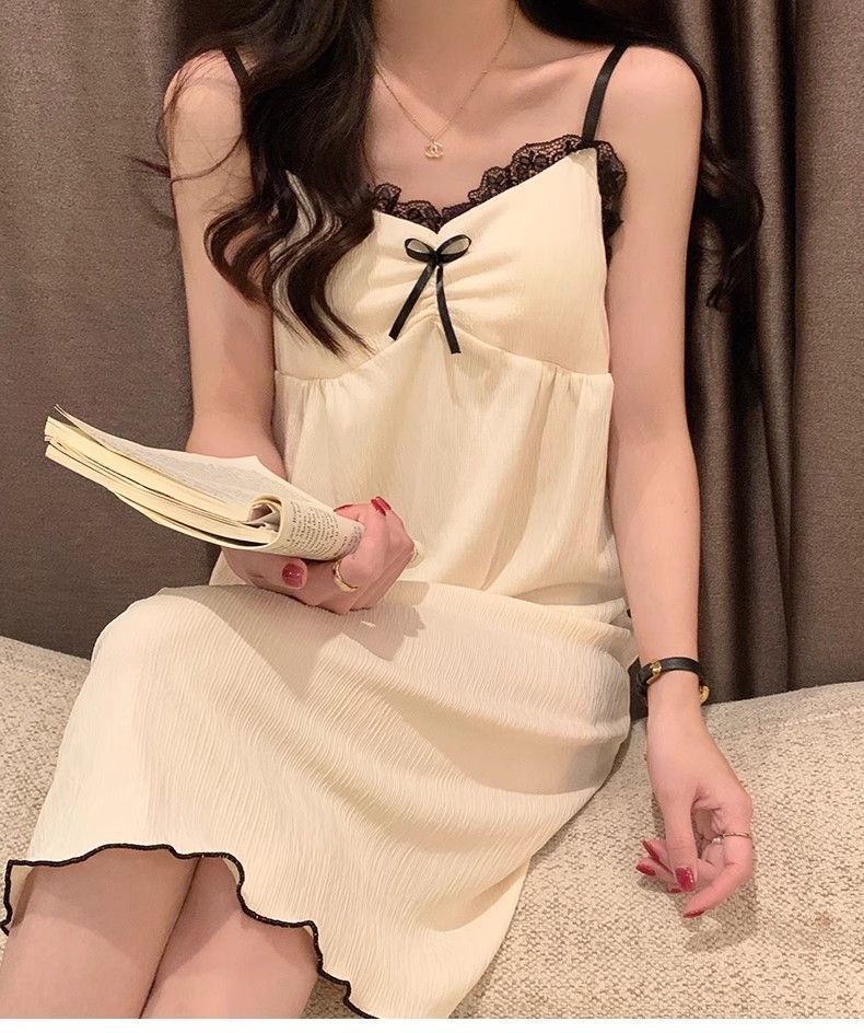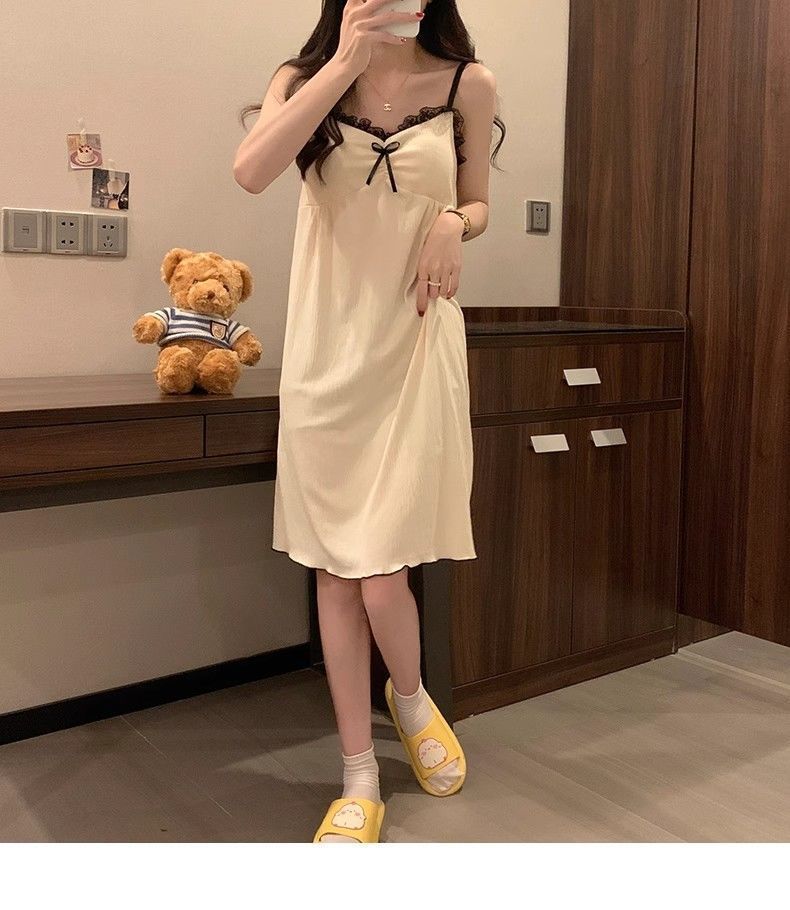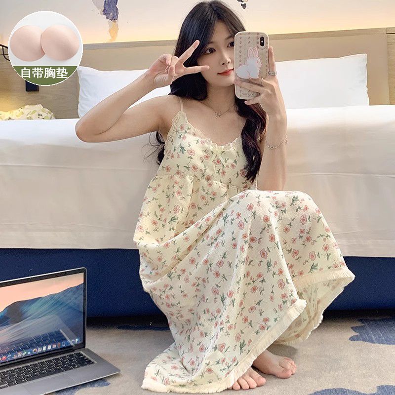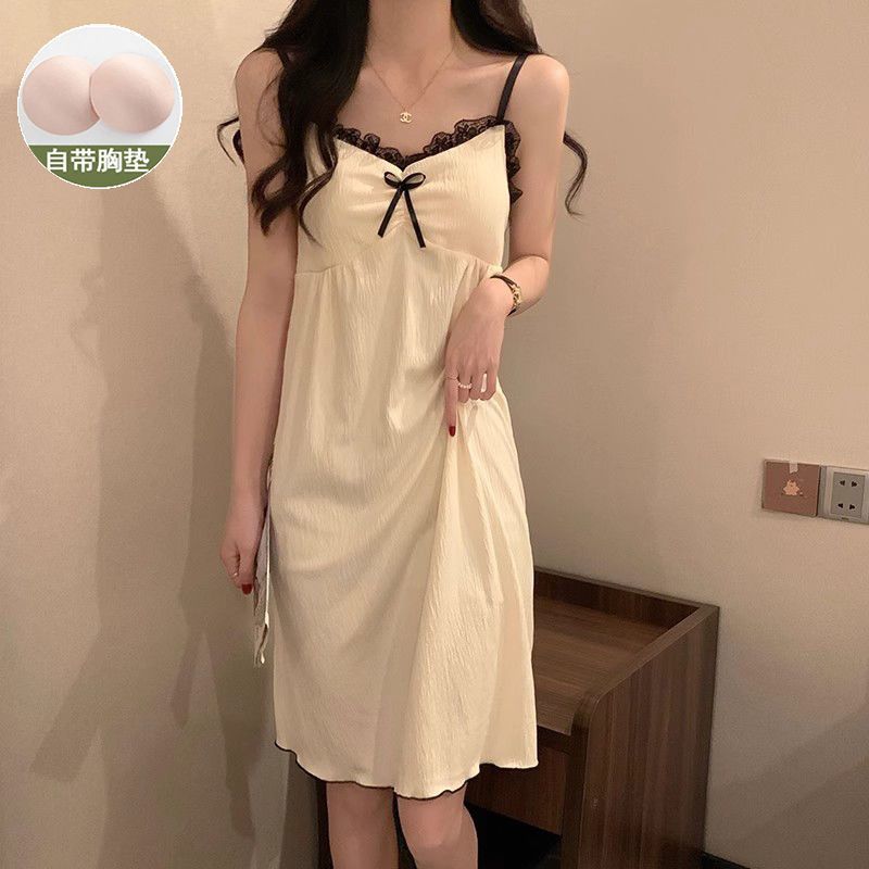 Летняя ночная рубашка-бретелька для женщин с нагрудными подушечками, модное студенческое кружевное абрикосовое домашнее платье для сна на лето.