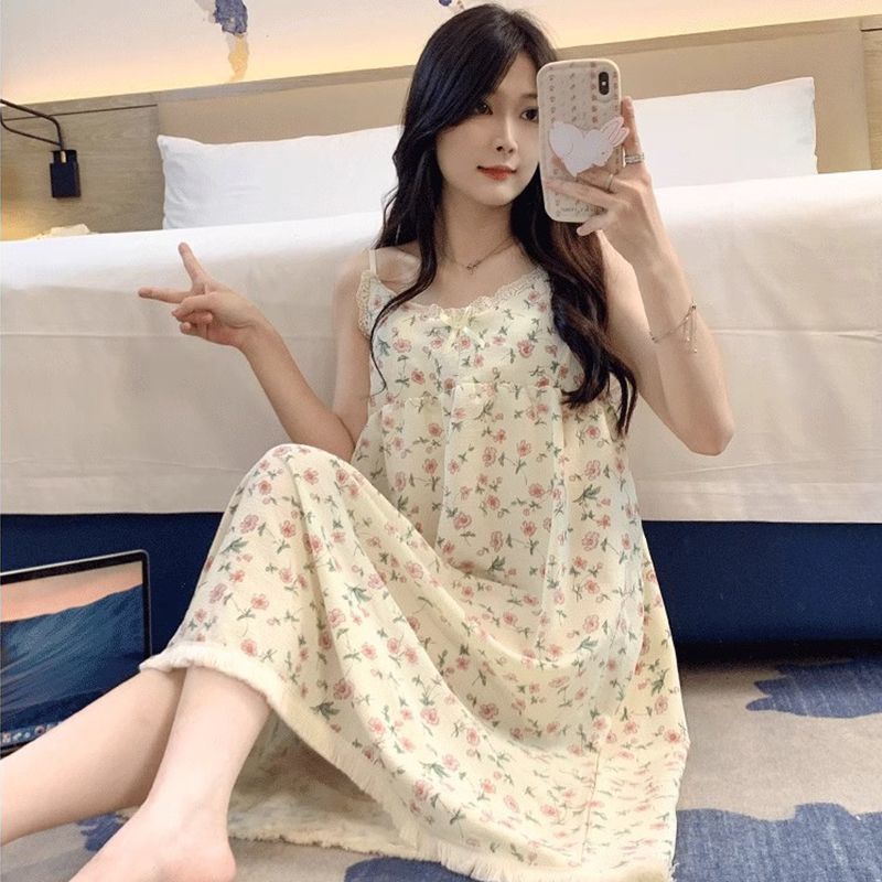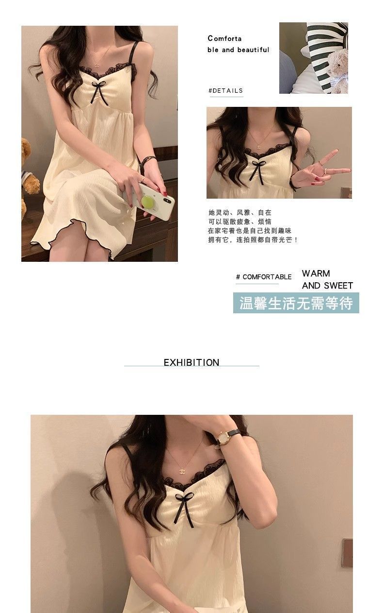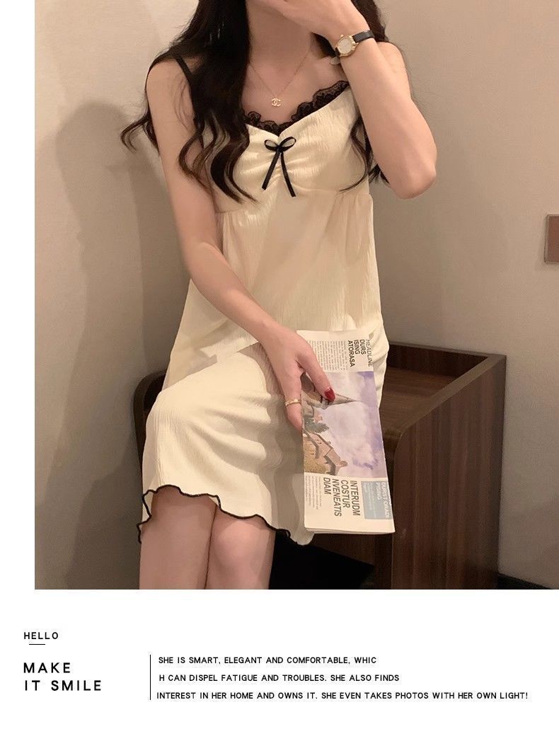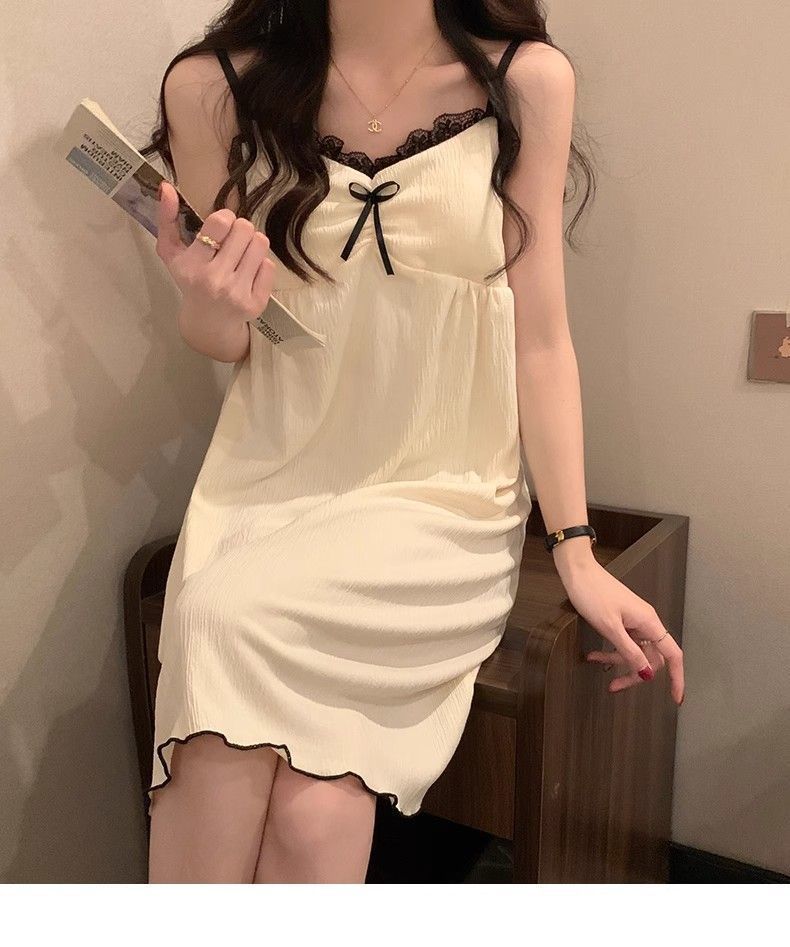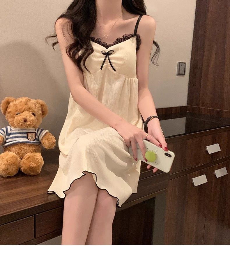 Летняя ночная рубашка-бретелька для женщин с нагрудными подушечками, модное студенческое кружевное абрикосовое домашнее платье для сна на лето.