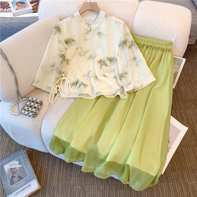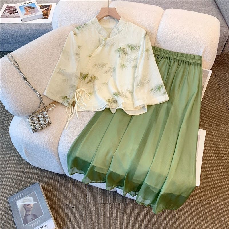 Зеленый новый китайский стиль юбка-костюм для женщин 2025 лето новый китайский стиль утягивающий костюм для скрытия живота