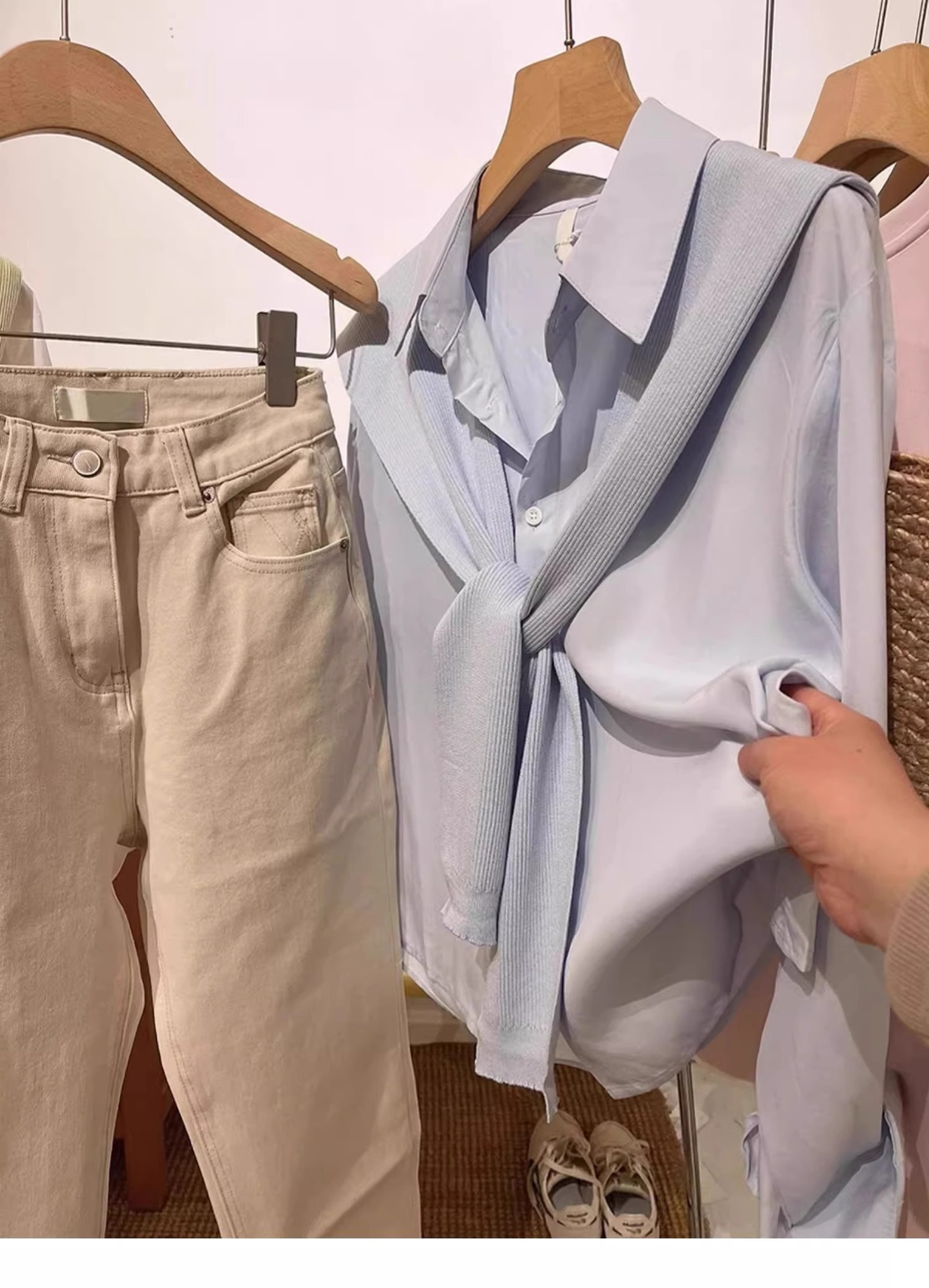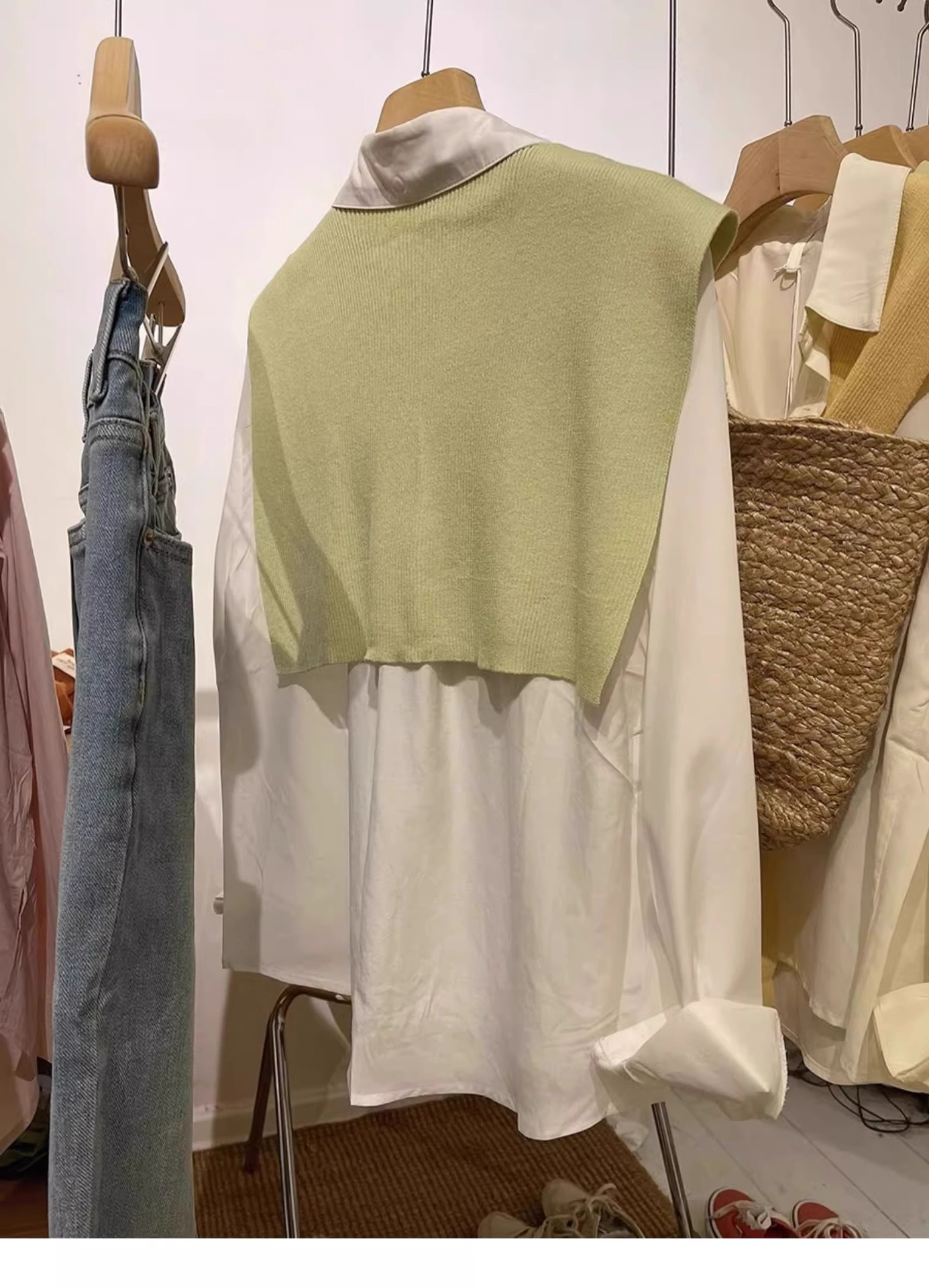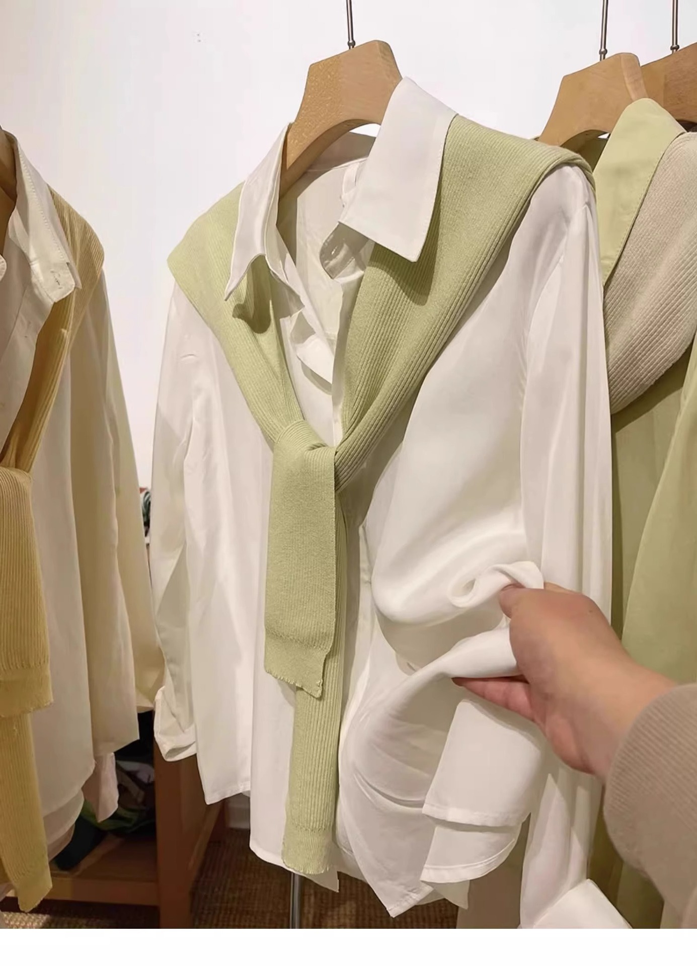Гусиный желтый [отдельная рубашка]; Белый [отдельная рубашка]; Зеленый [отдельная рубашка]; Синий [отдельная рубашка]; Гусиная желтая рубашка + гусиная желтая шаль; Белая рубашка + темно-зеленая шаль.; Зеленая рубашка + белая шаль; Синяя рубашка + синяя шаль