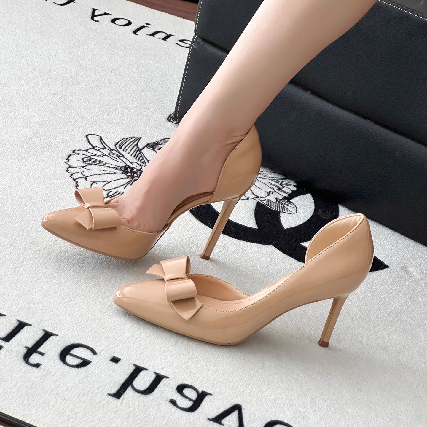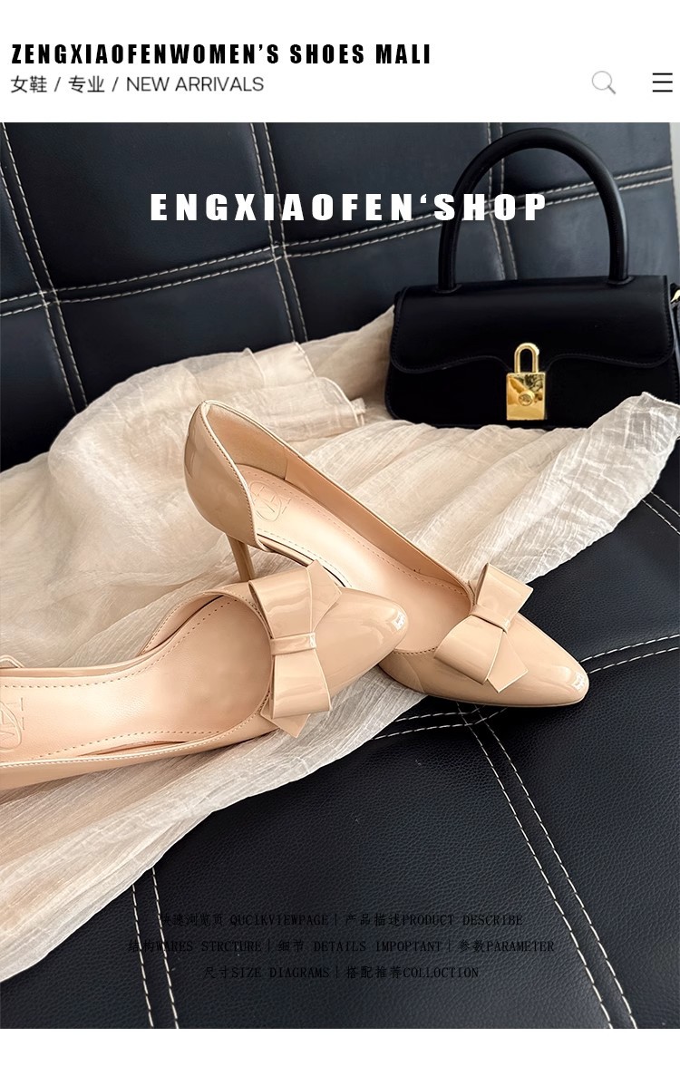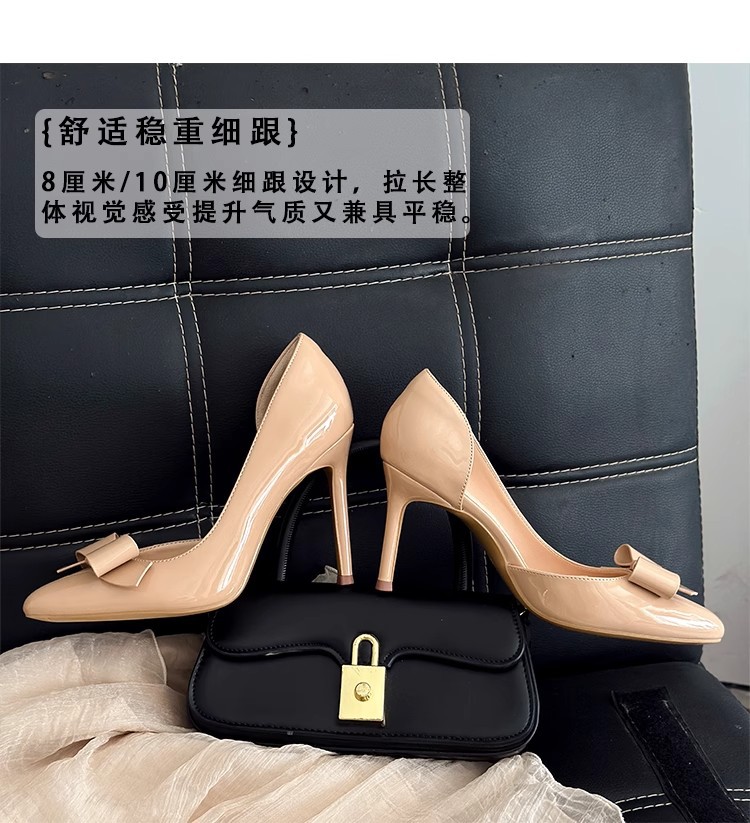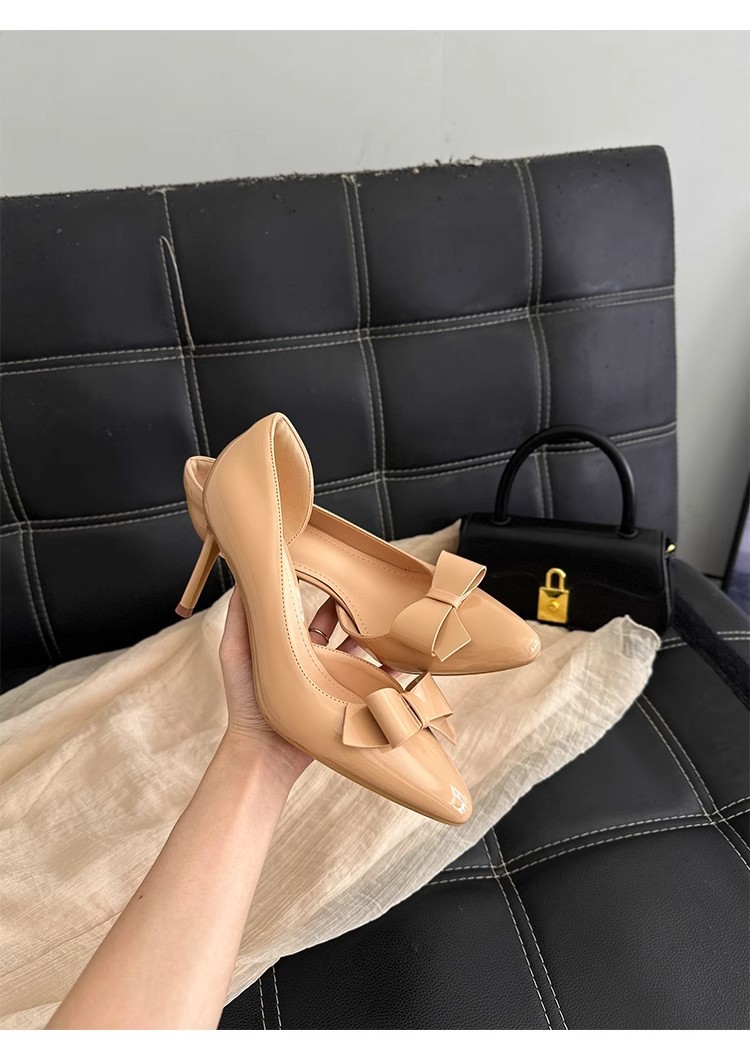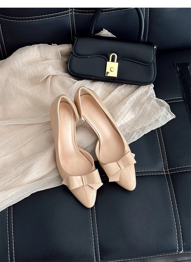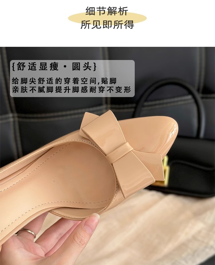 2025 новые весенне-осенние туфли на шпильке из лакированной кожи с круглым носком, боковым бантом и ажурной вставкой, нюдовые, женские, элегантные балетки в ретро стиле