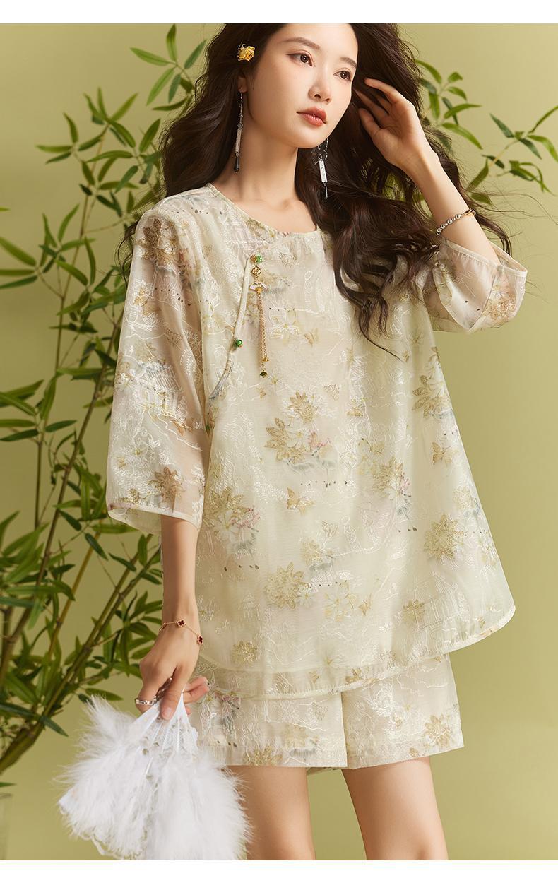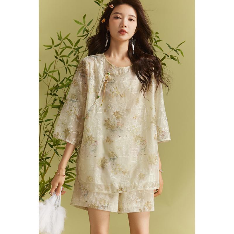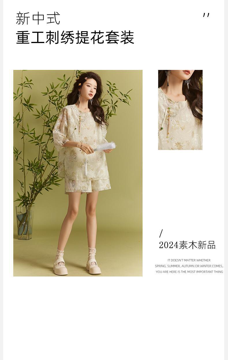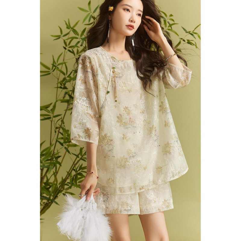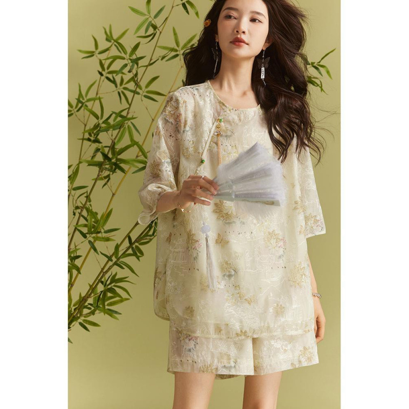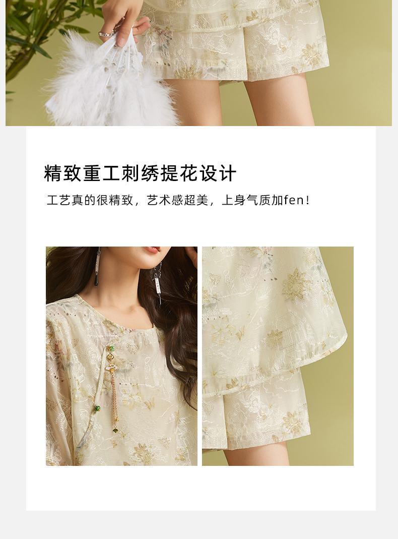 Женский новый китайский жаккардовый костюм с коротким рукавом, лето 2025, новые шорты, свободный вышитый тюлевой кардиган, комплект из двух предметов