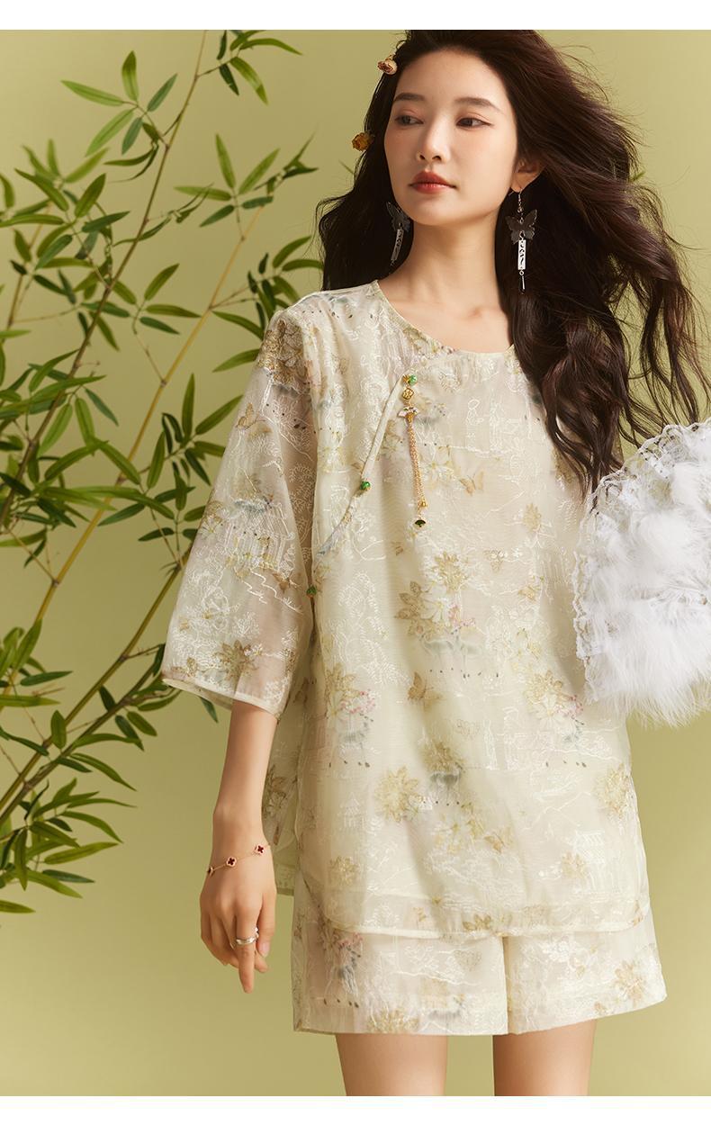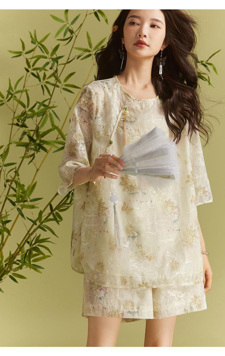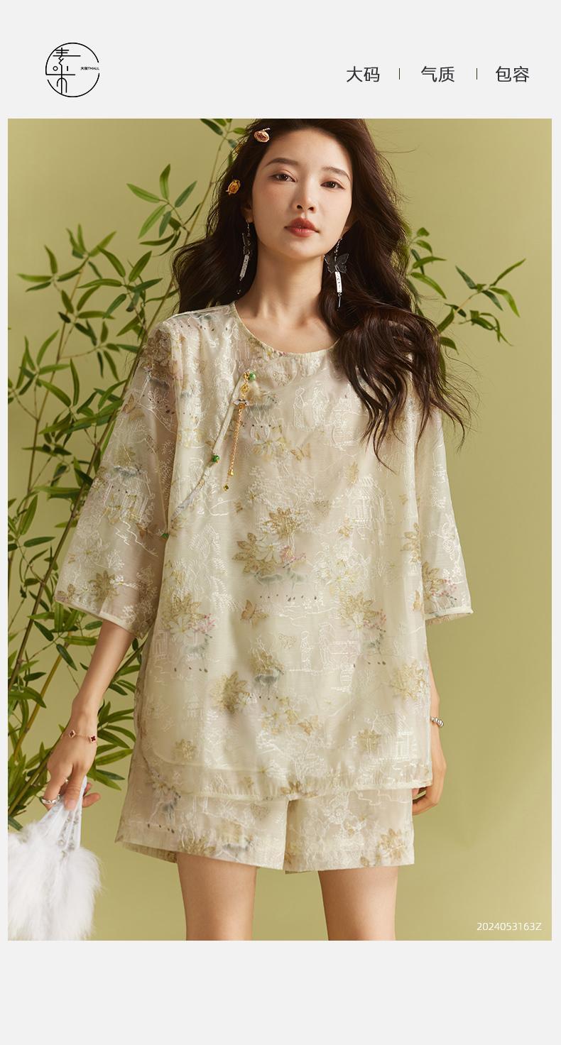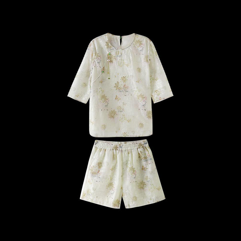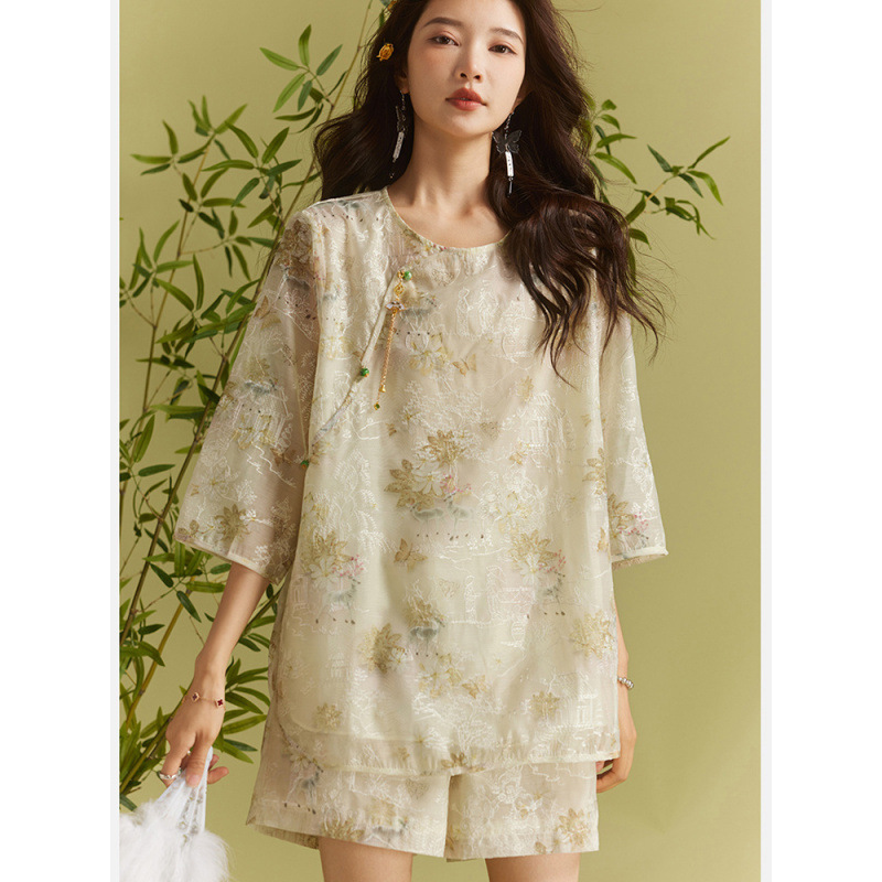 Женский новый китайский жаккардовый костюм с коротким рукавом, лето 2025, новые шорты, свободный вышитый тюлевой кардиган, комплект из двух предметов