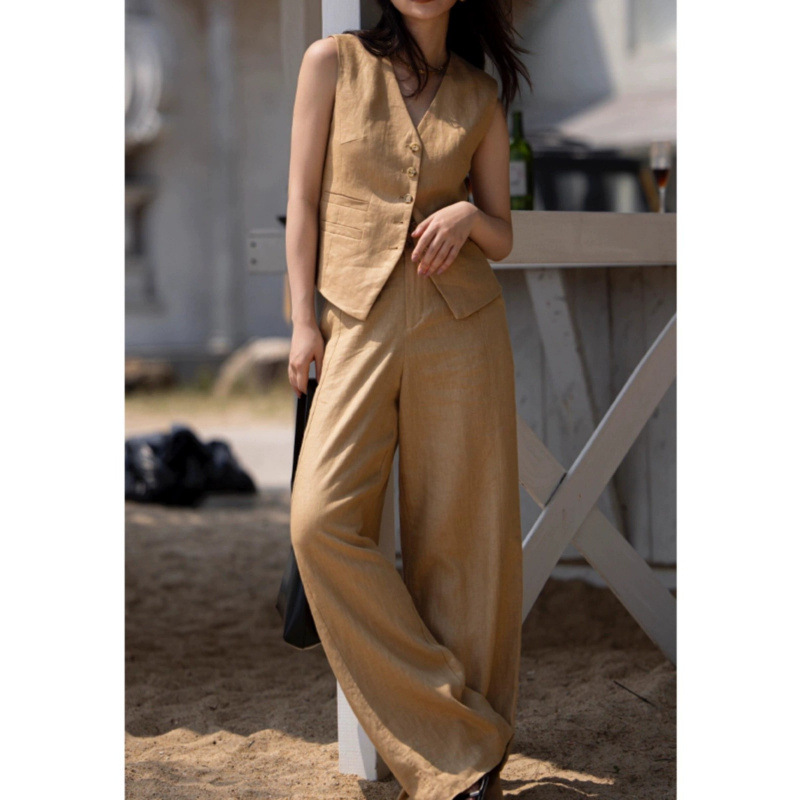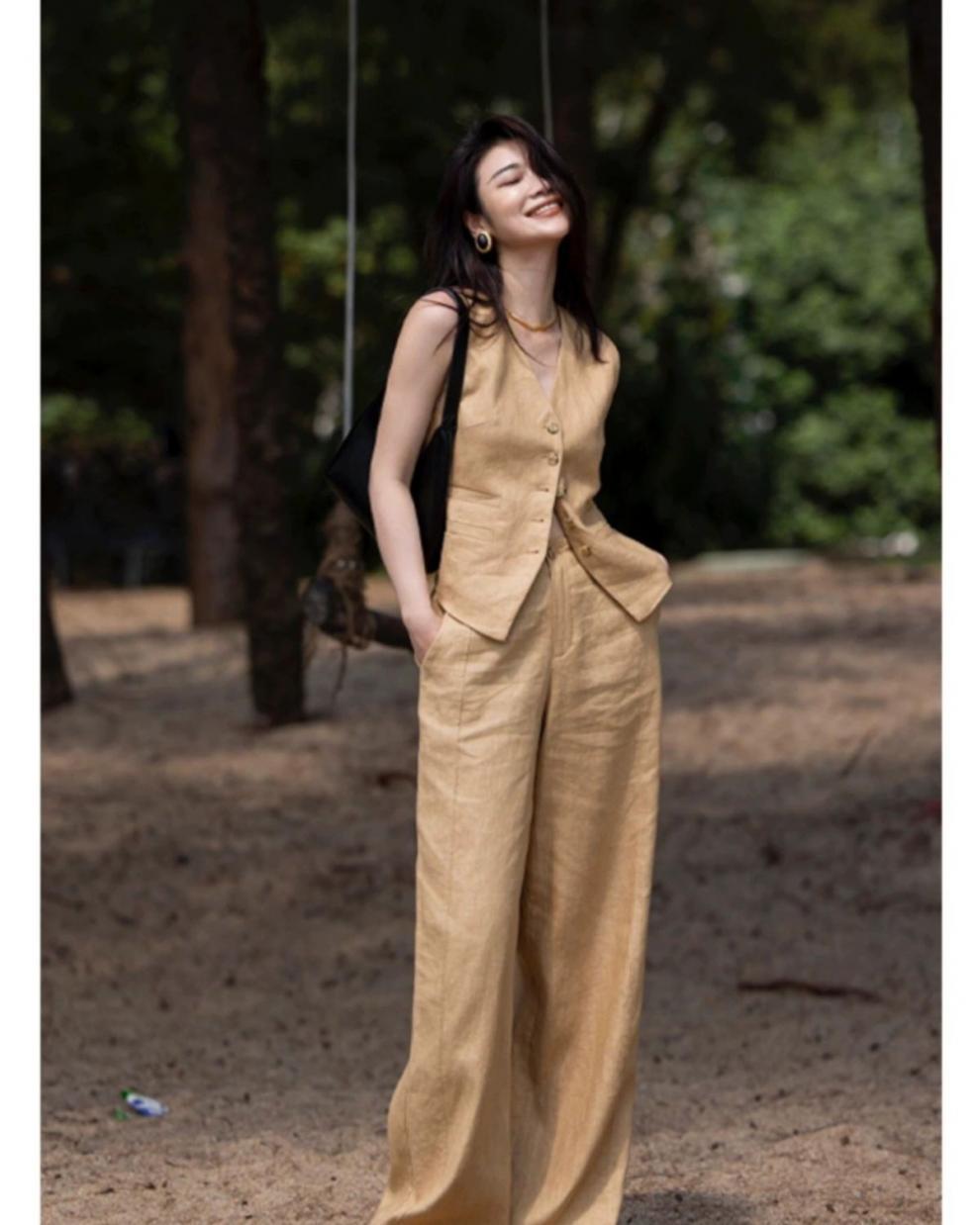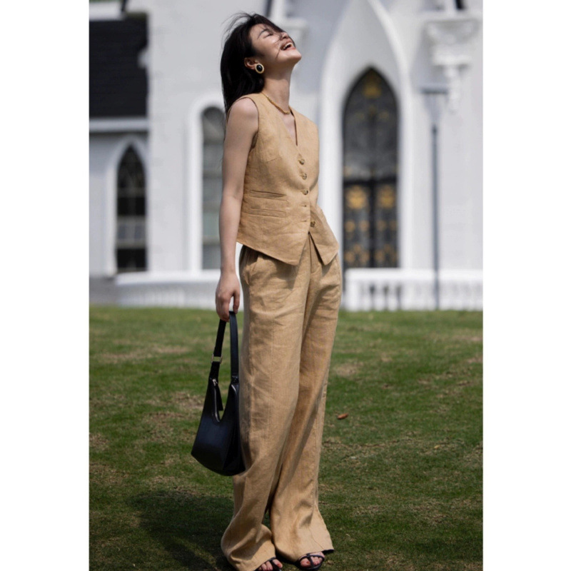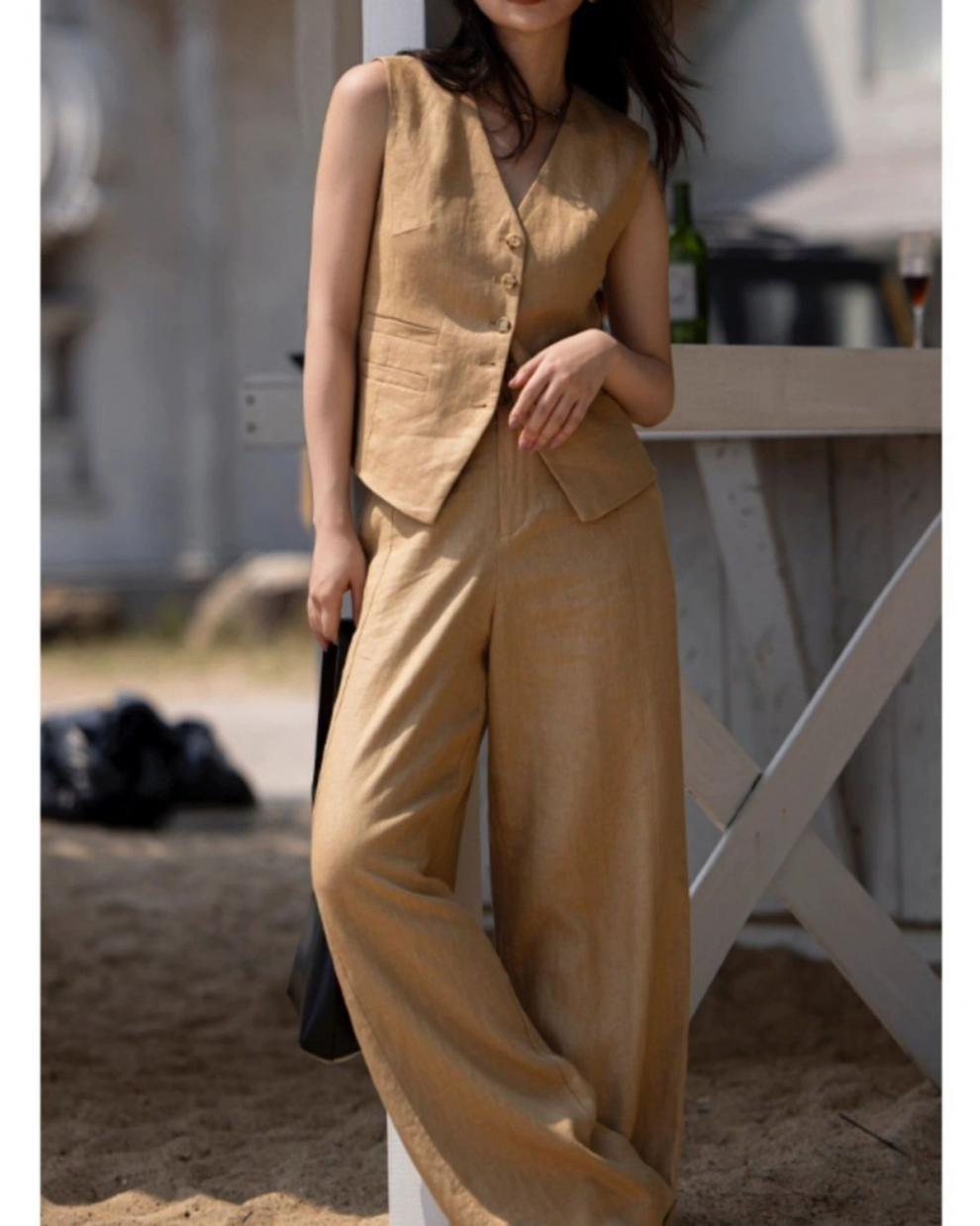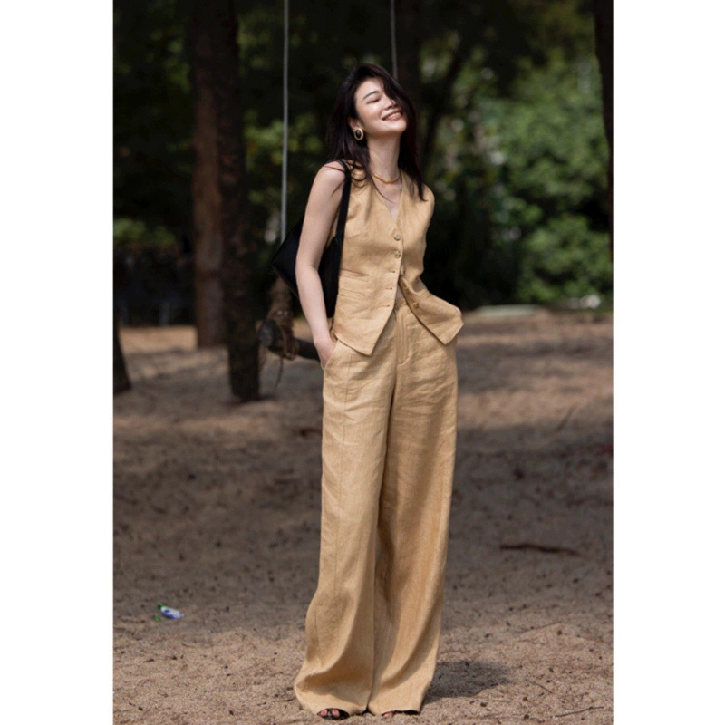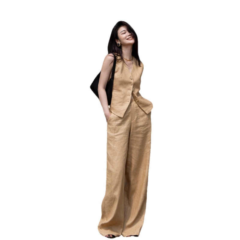 Модный льняной костюм для женщин лето 2025, элегантный высококачественный костюм из хлопка и льна, жилет, топ, широкие брюки, комплект из двух предметов