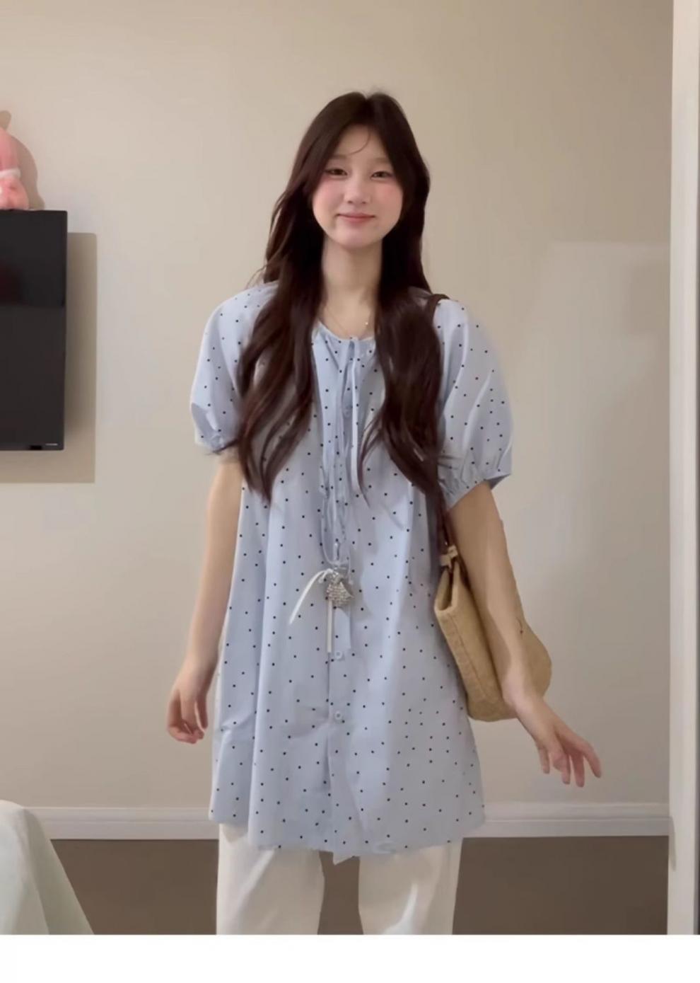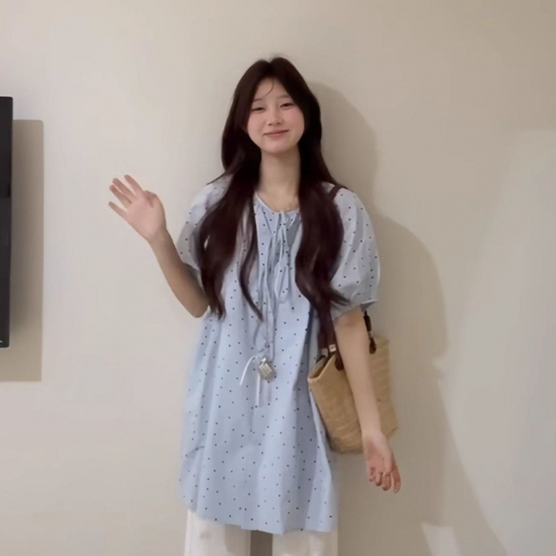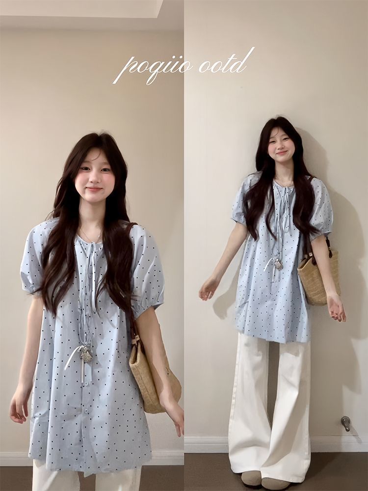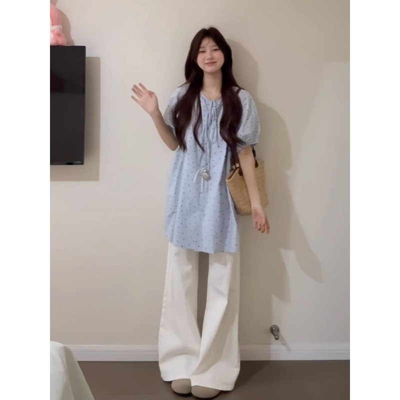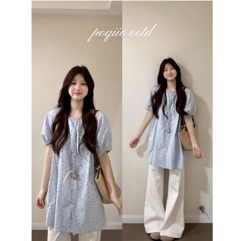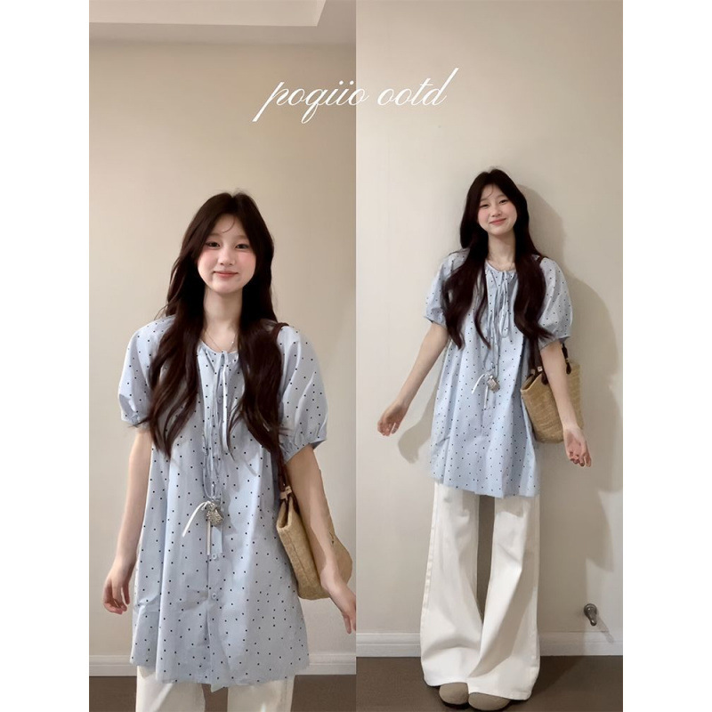 Летний женский повседневный спортивный костюм в корейском стиле, синяя рубашка в горошек, брюки с короткими рукавами, комплект из двух предметов