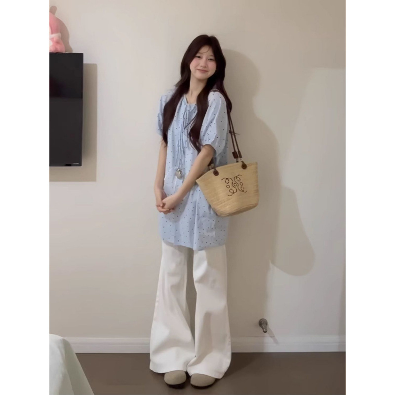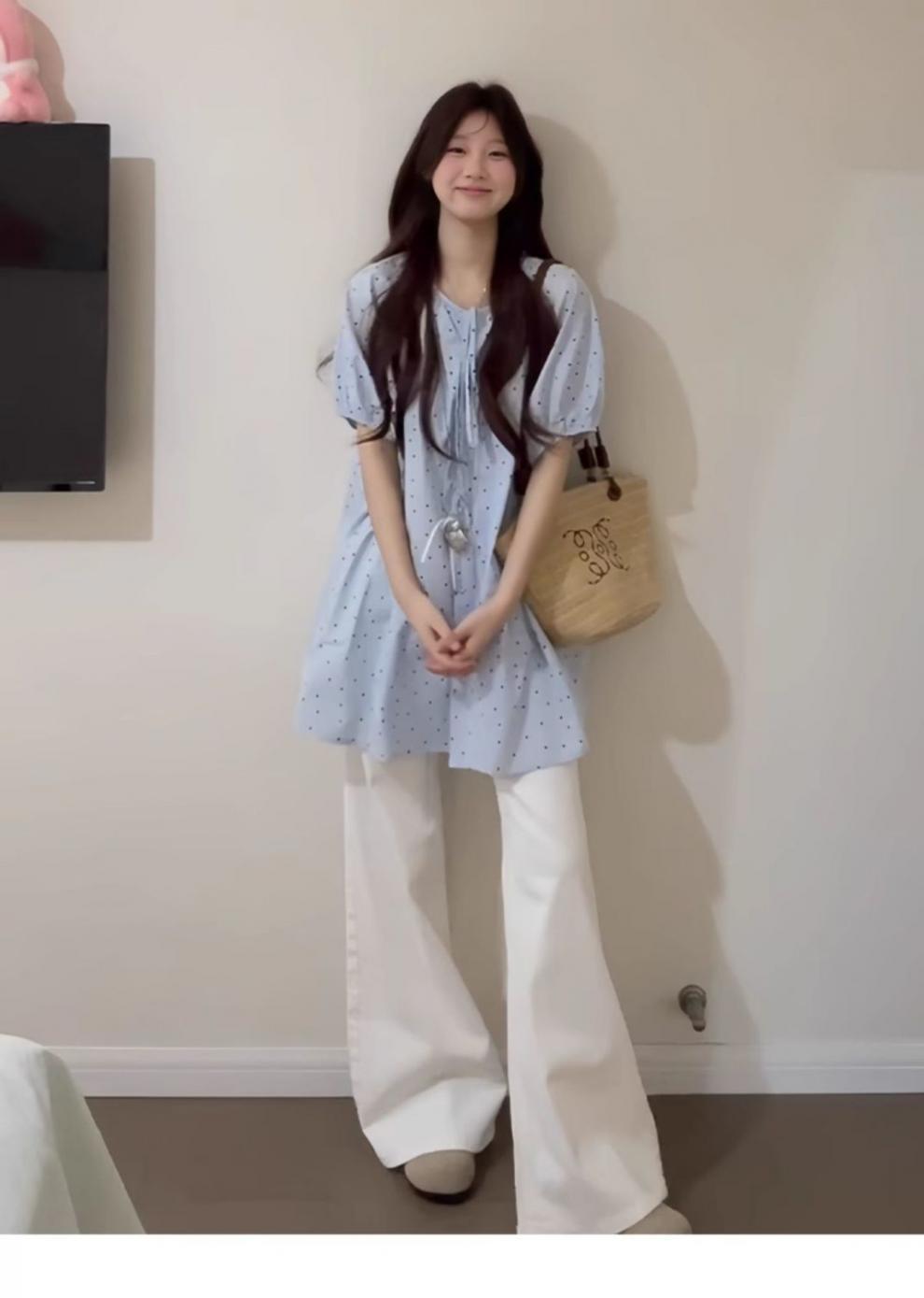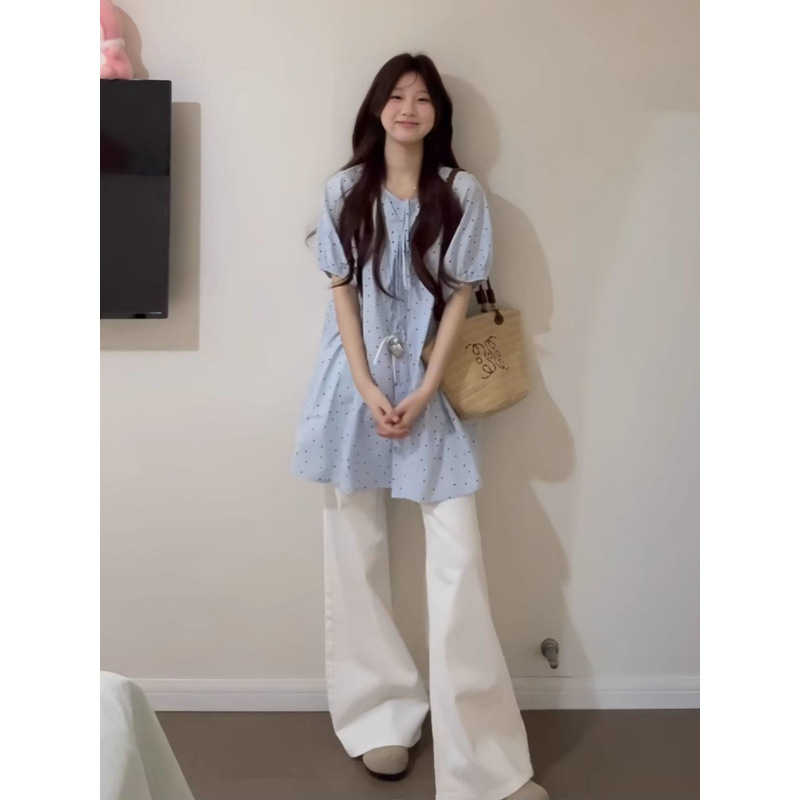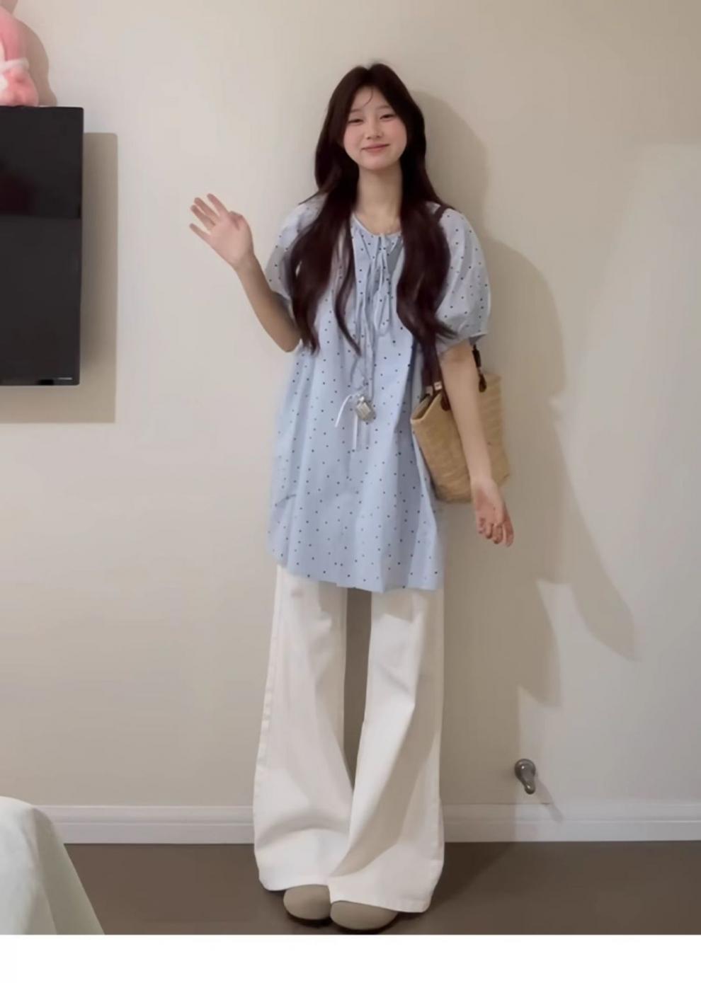 Летний женский повседневный спортивный костюм в корейском стиле, синяя рубашка в горошек, брюки с короткими рукавами, комплект из двух предметов
