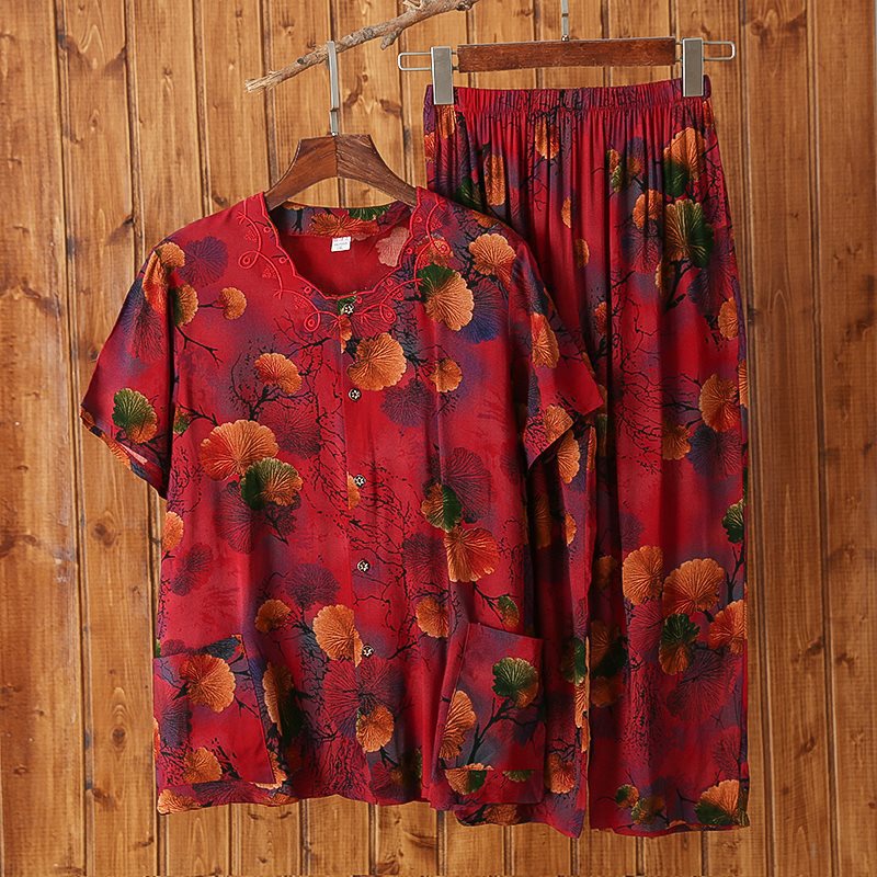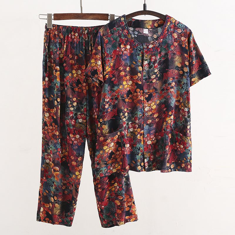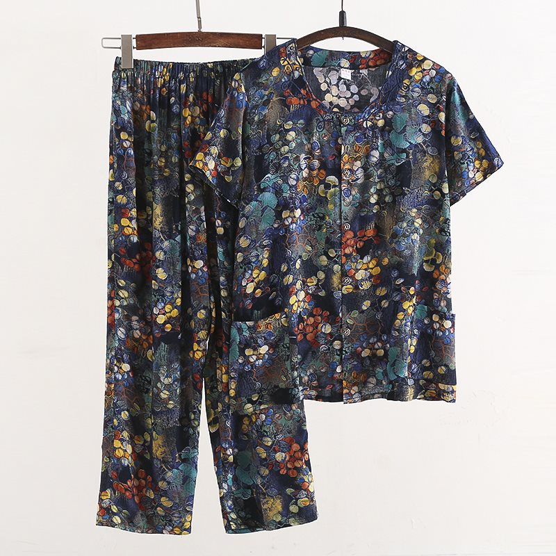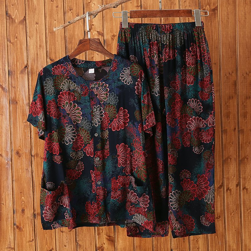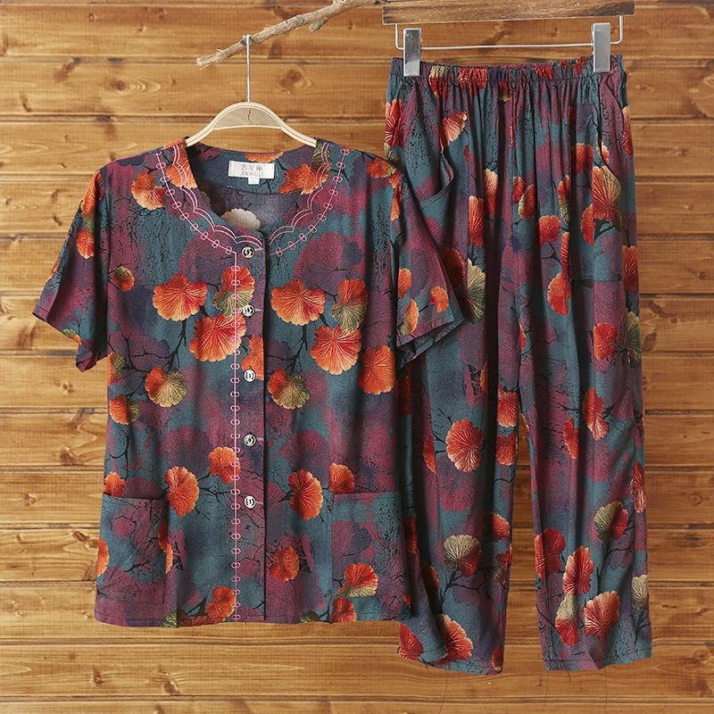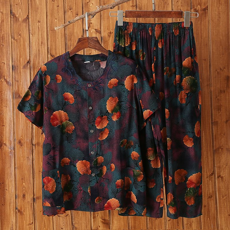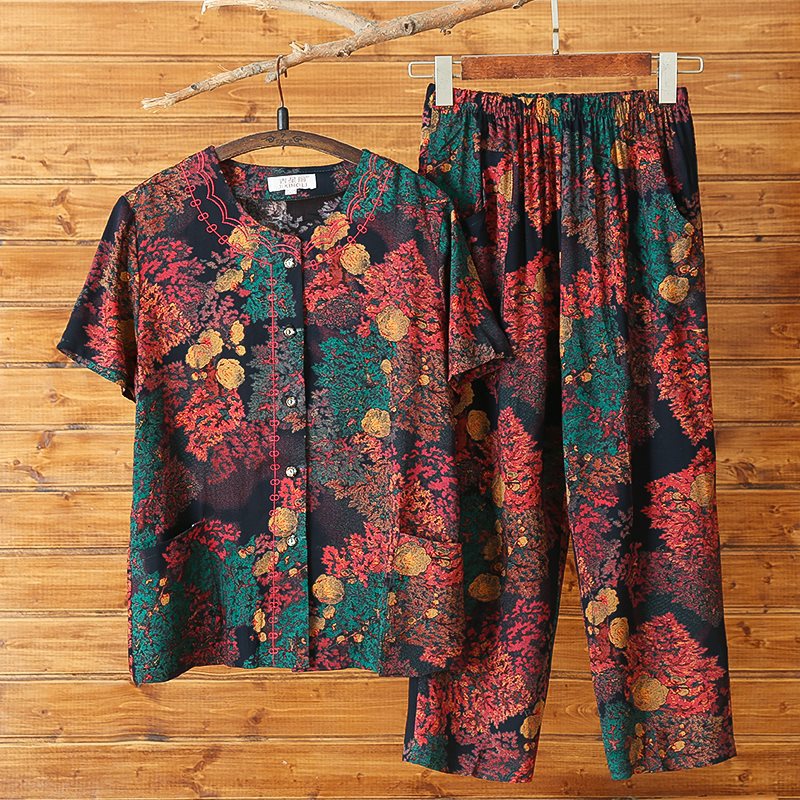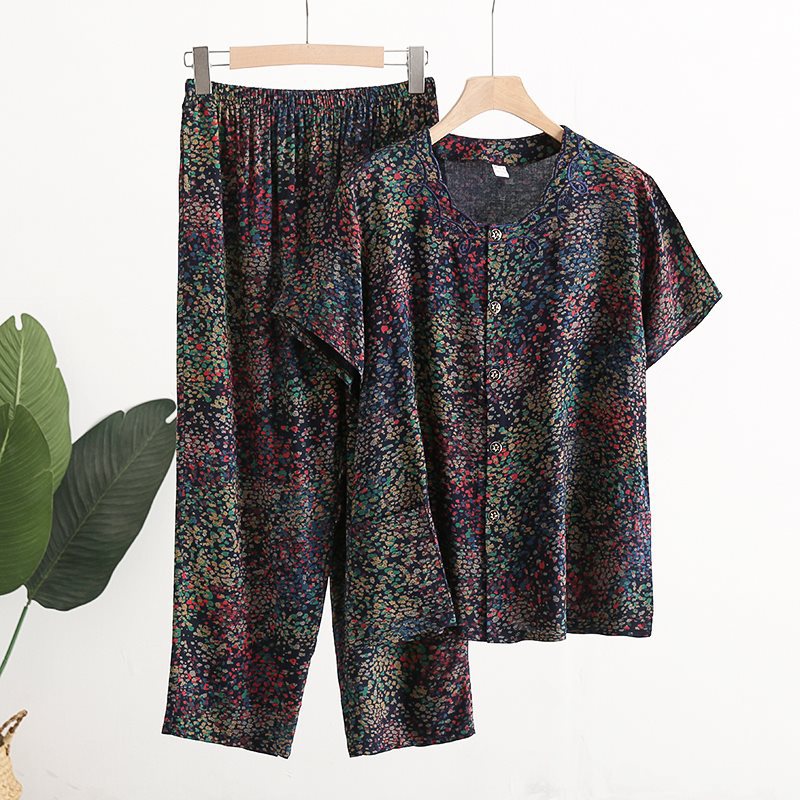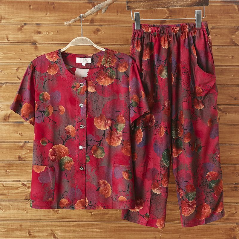 Женский хлопковый кардиган с короткими рукавами среднего и пожилого возраста, одежда для мам больших размеров, комплект из двух предметов из хлопкового шелка для старухи с девятью точками.