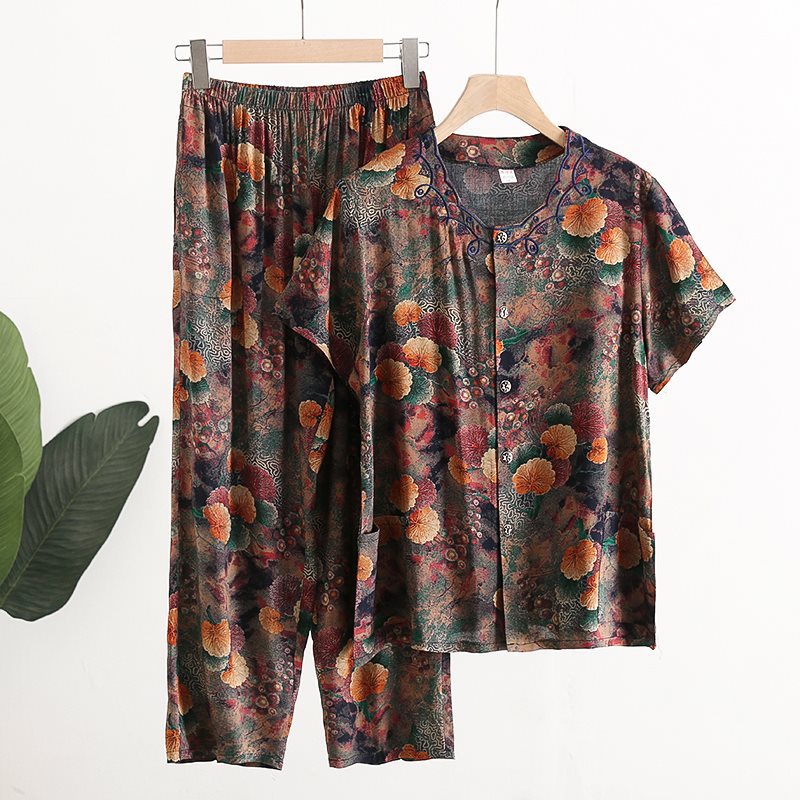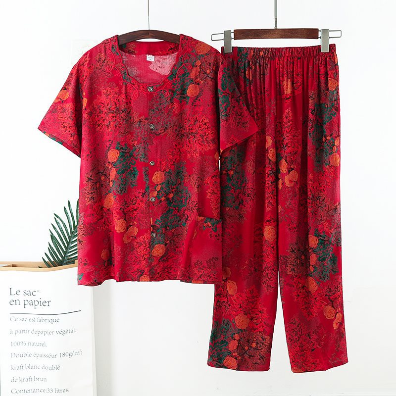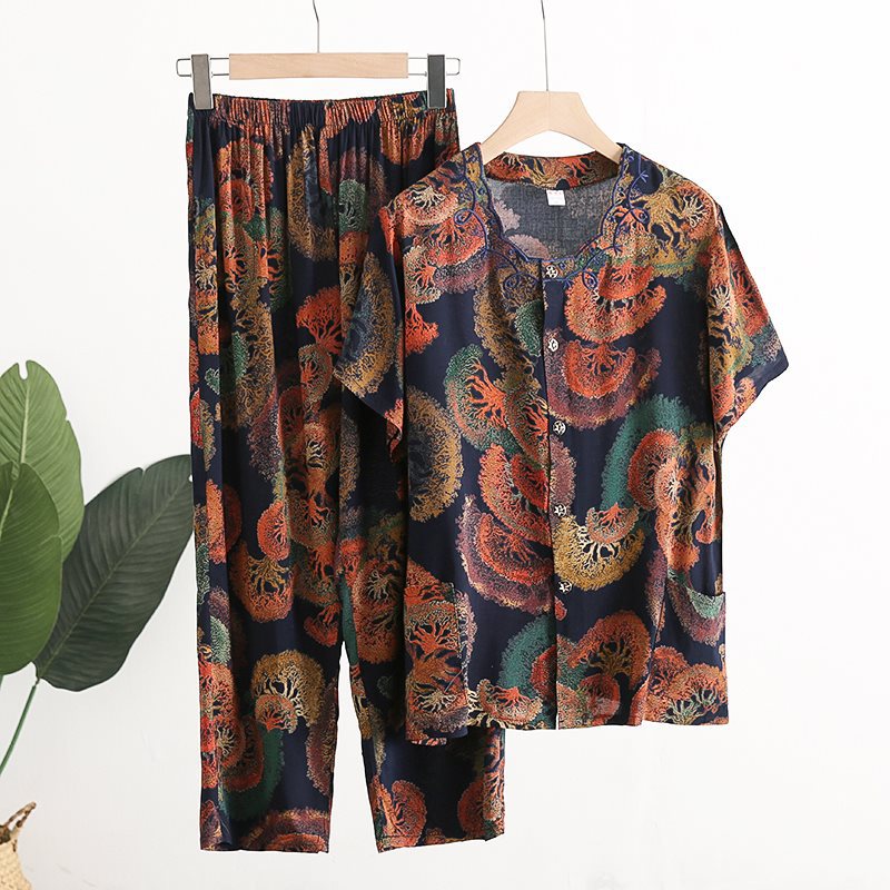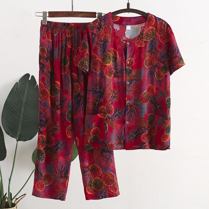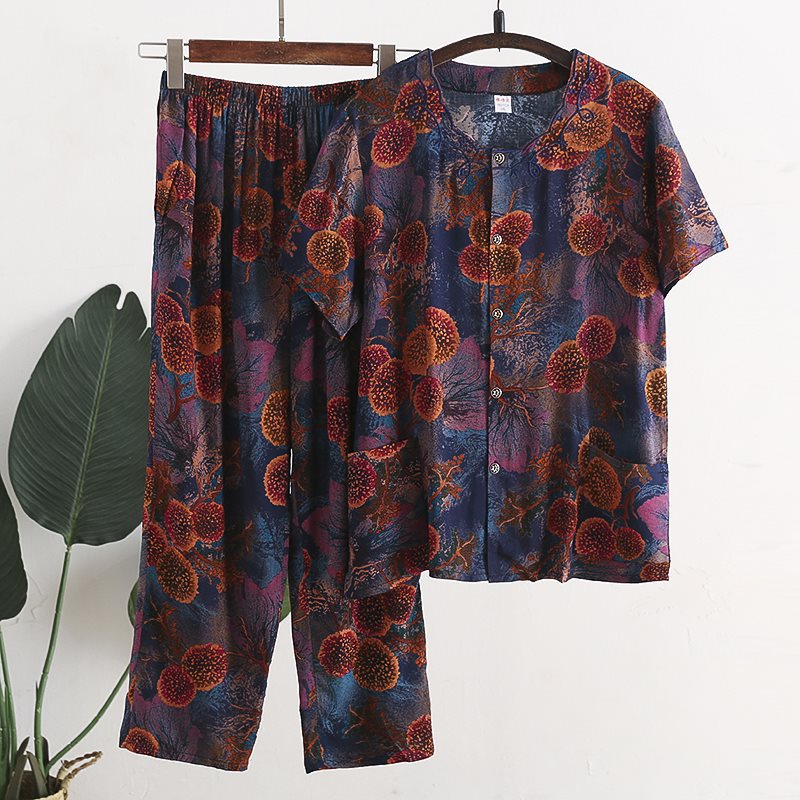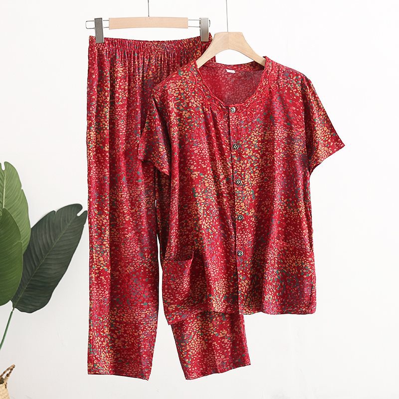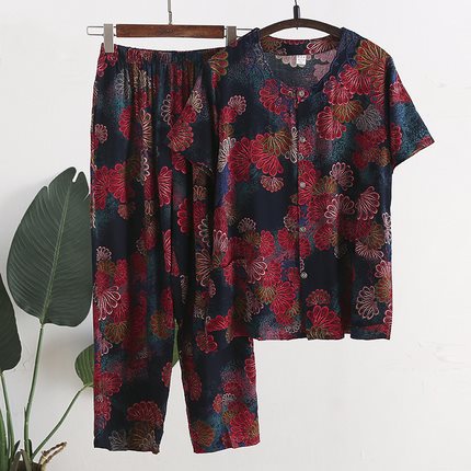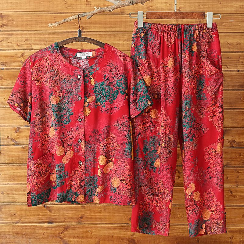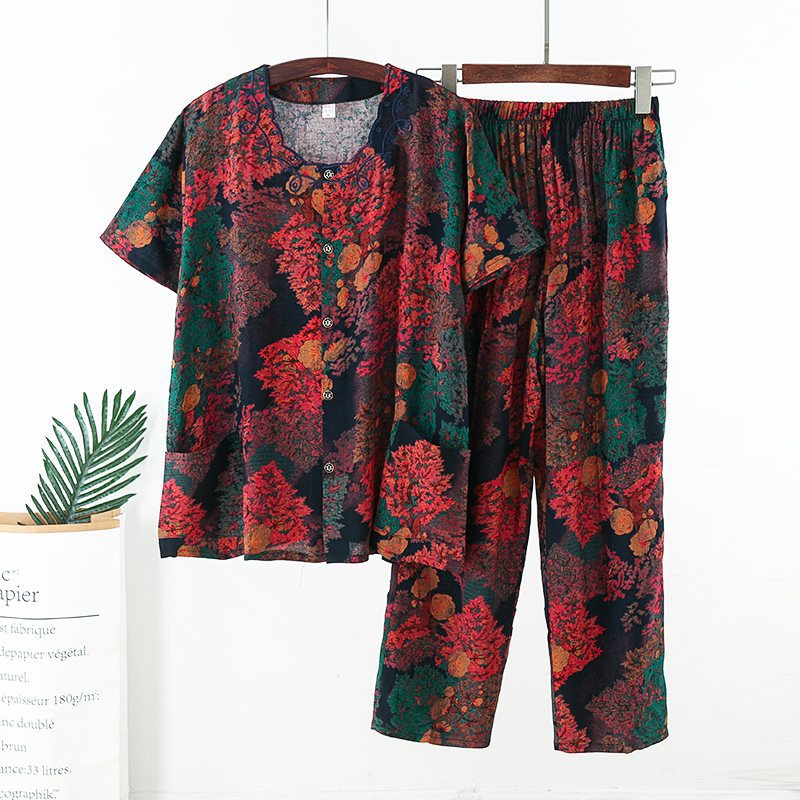 Женский хлопковый кардиган с короткими рукавами среднего и пожилого возраста, одежда для мам больших размеров, комплект из двух предметов из хлопкового шелка для старухи с девятью точками.