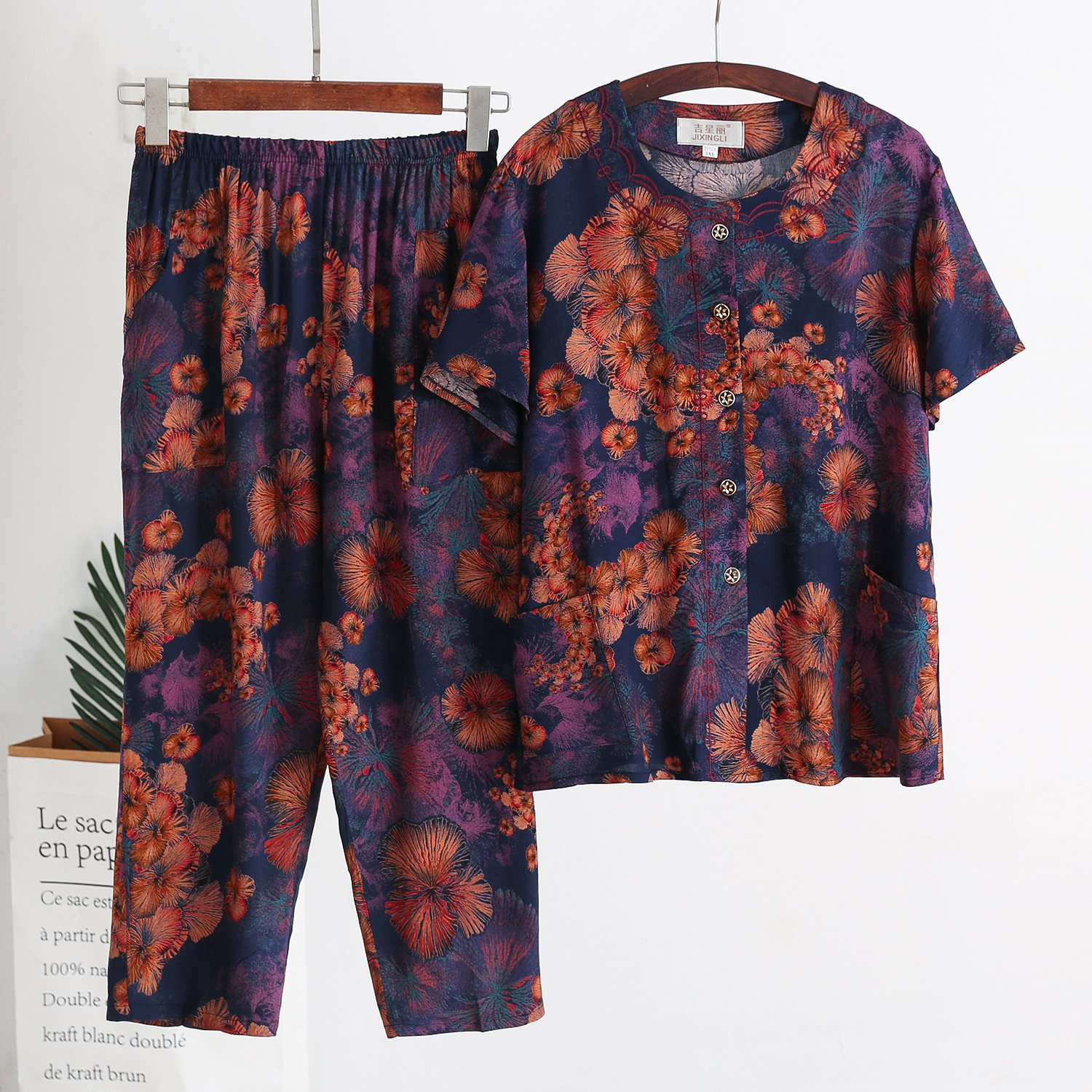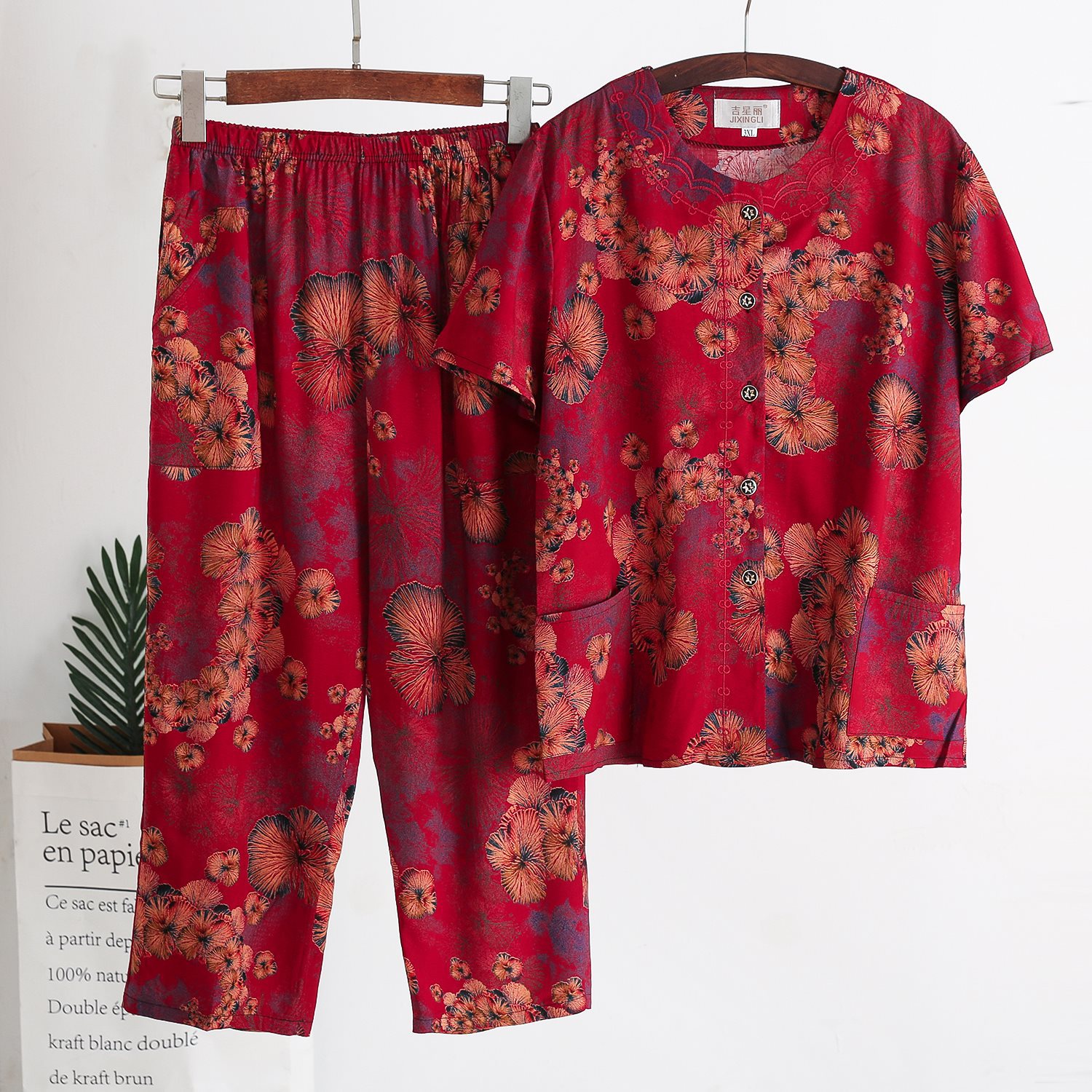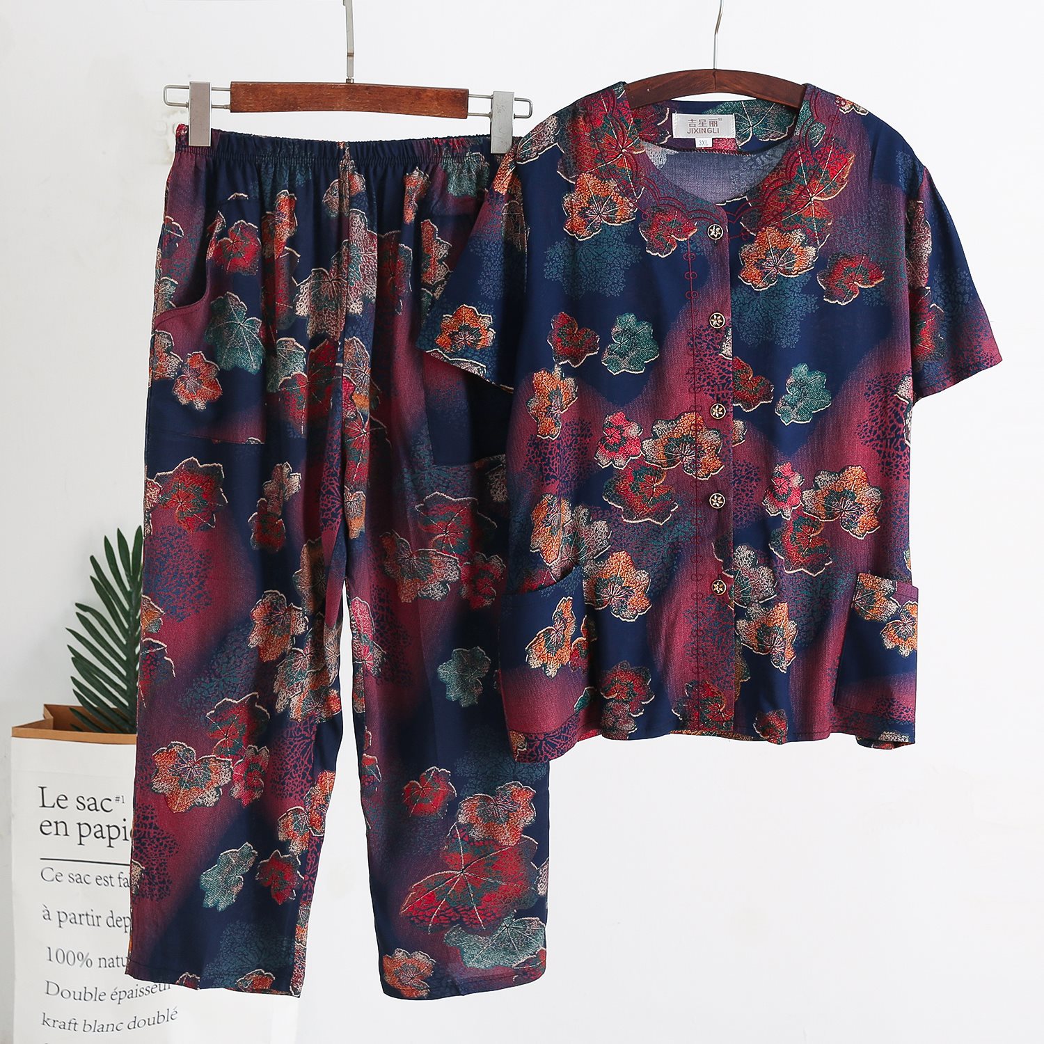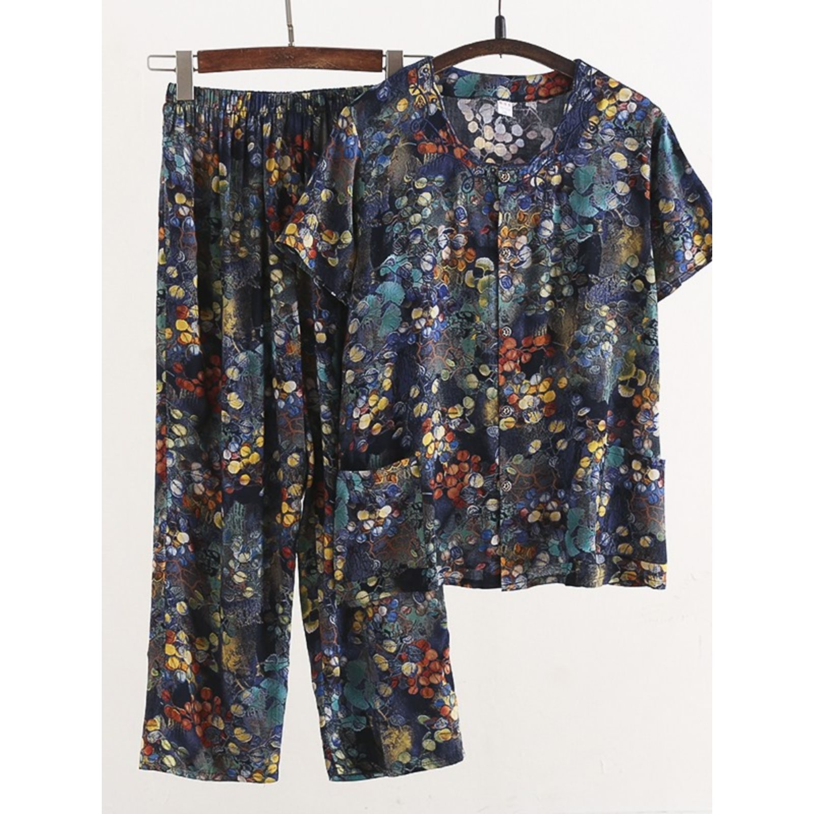 Женский хлопковый кардиган с короткими рукавами среднего и пожилого возраста, одежда для мам больших размеров, комплект из двух предметов из хлопкового шелка для старухи с девятью точками.