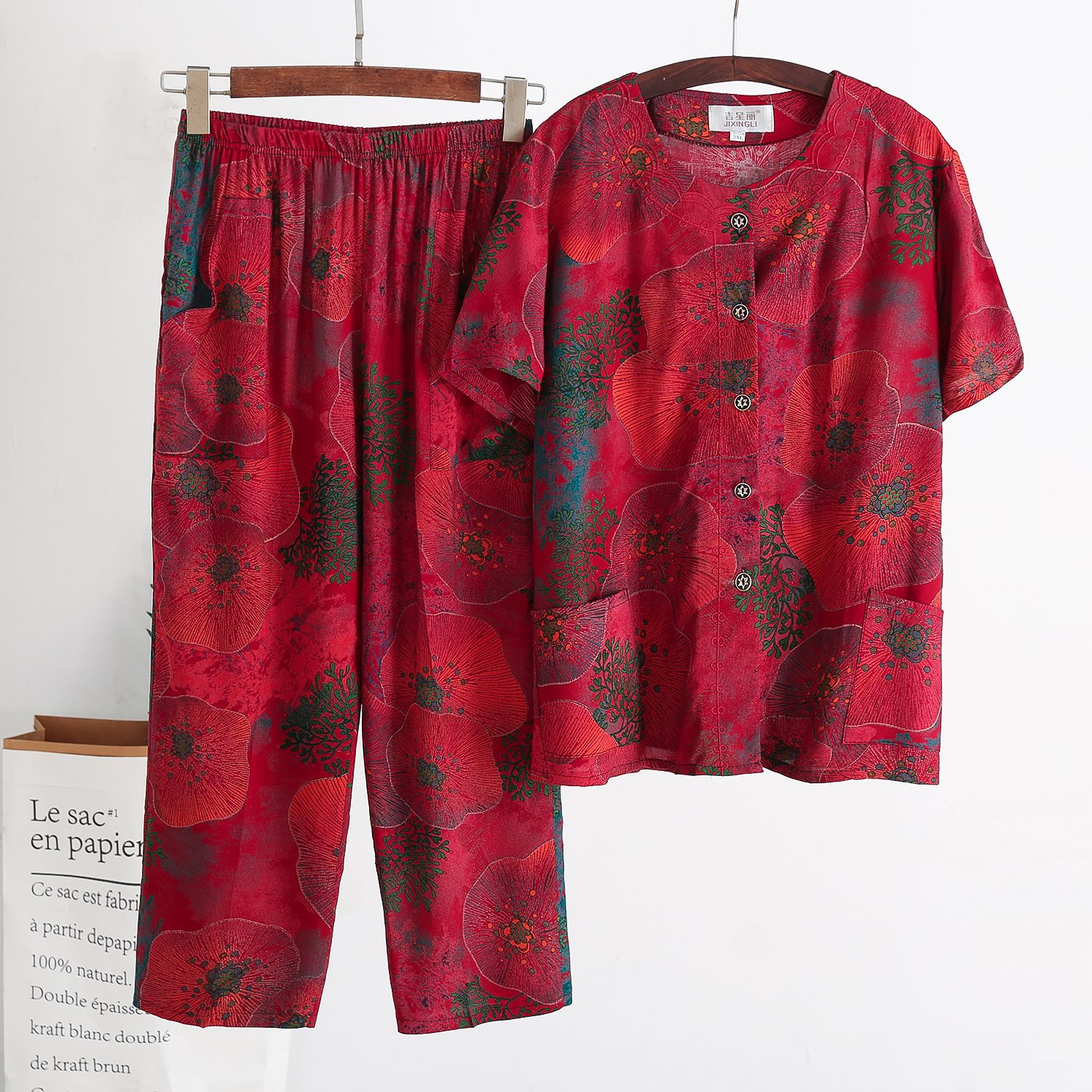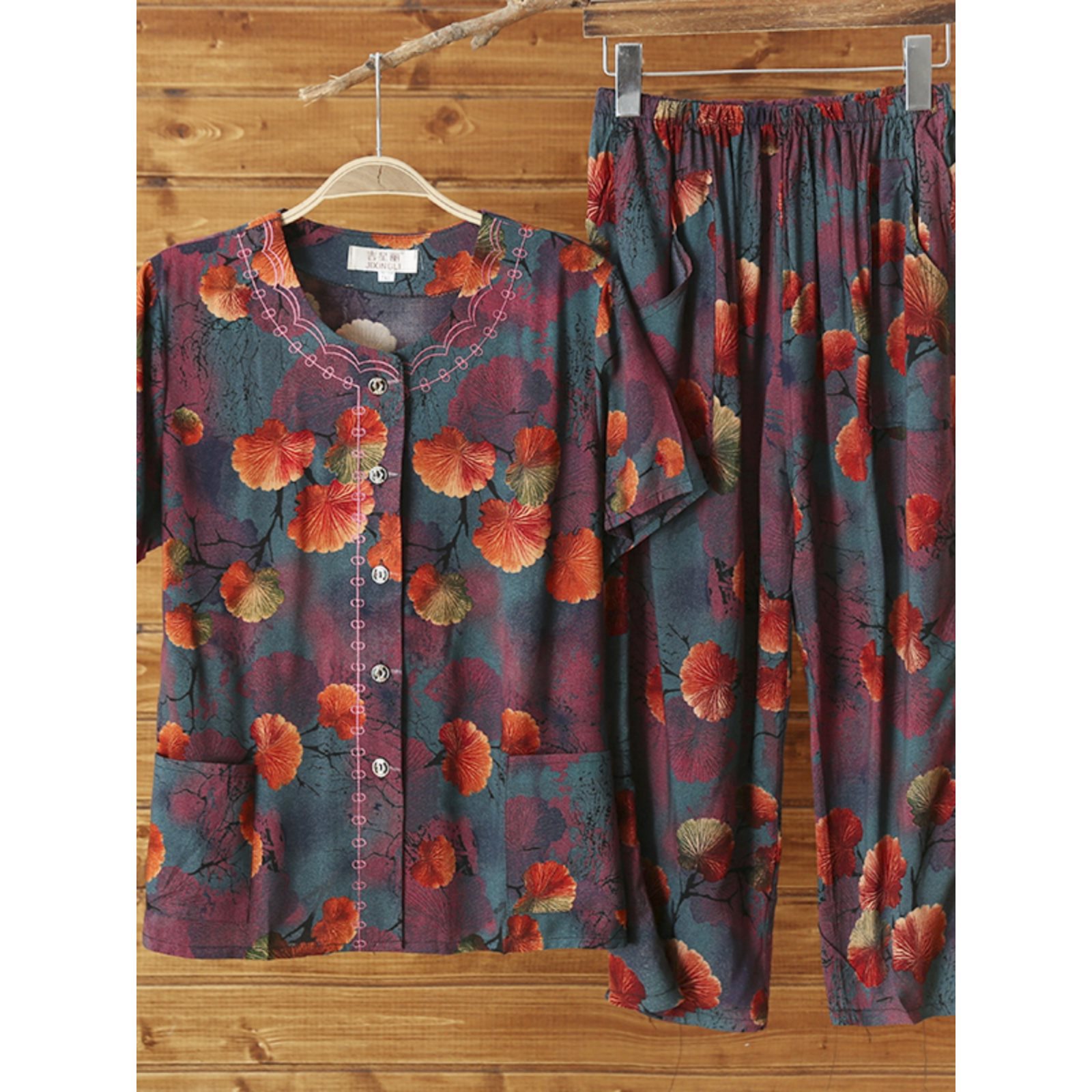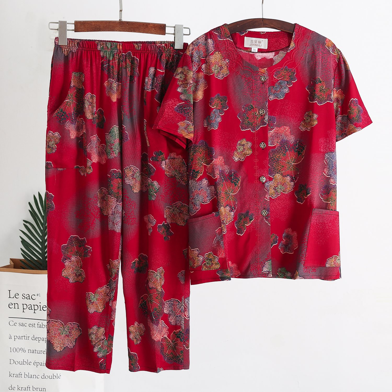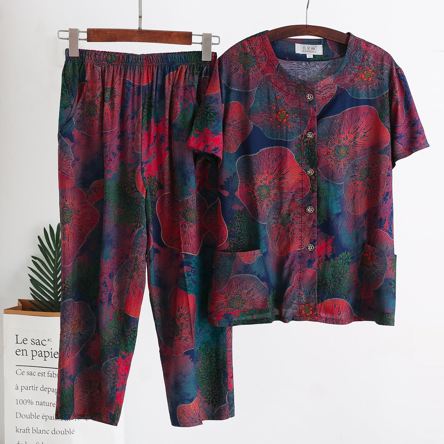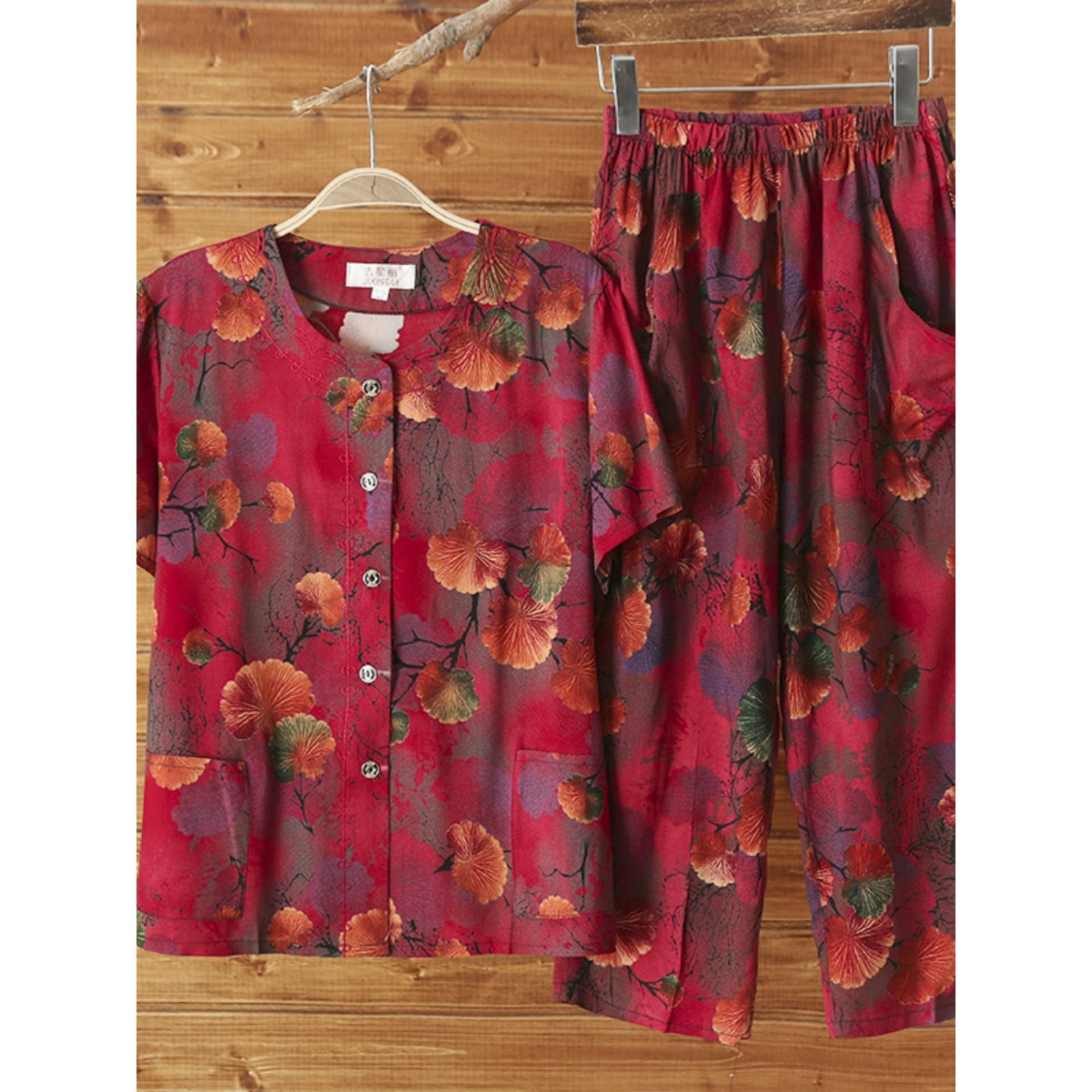 Женский хлопковый кардиган с короткими рукавами среднего и пожилого возраста, одежда для мам больших размеров, комплект из двух предметов из хлопкового шелка для старухи с девятью точками.