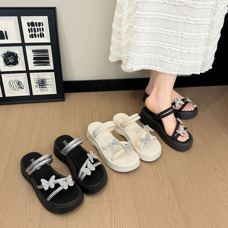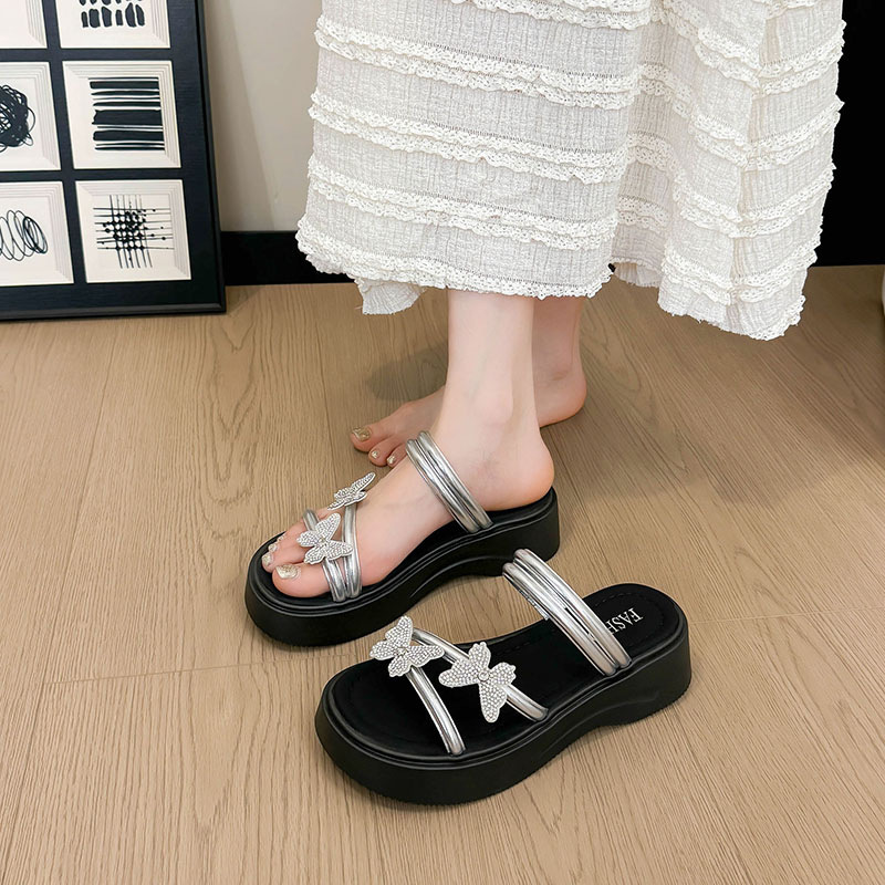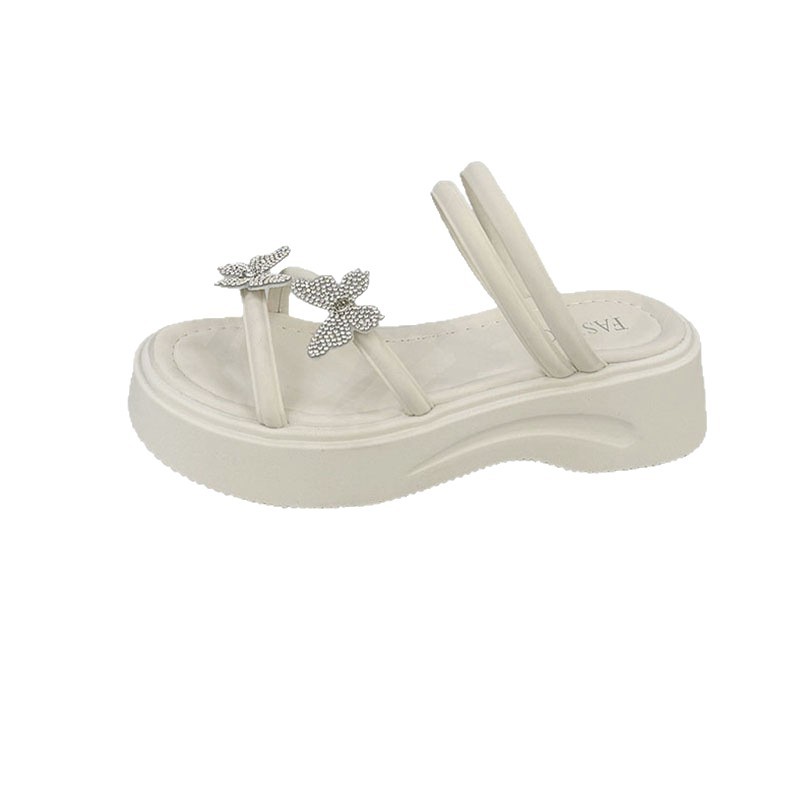Женские летние сандалии с двойным стразовым бантом на толстой подошве, универсальные пляжные шлепанцы для внешнего ношения