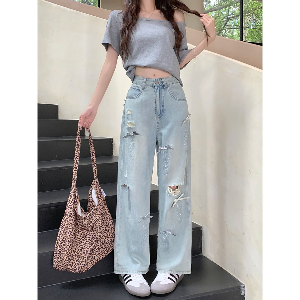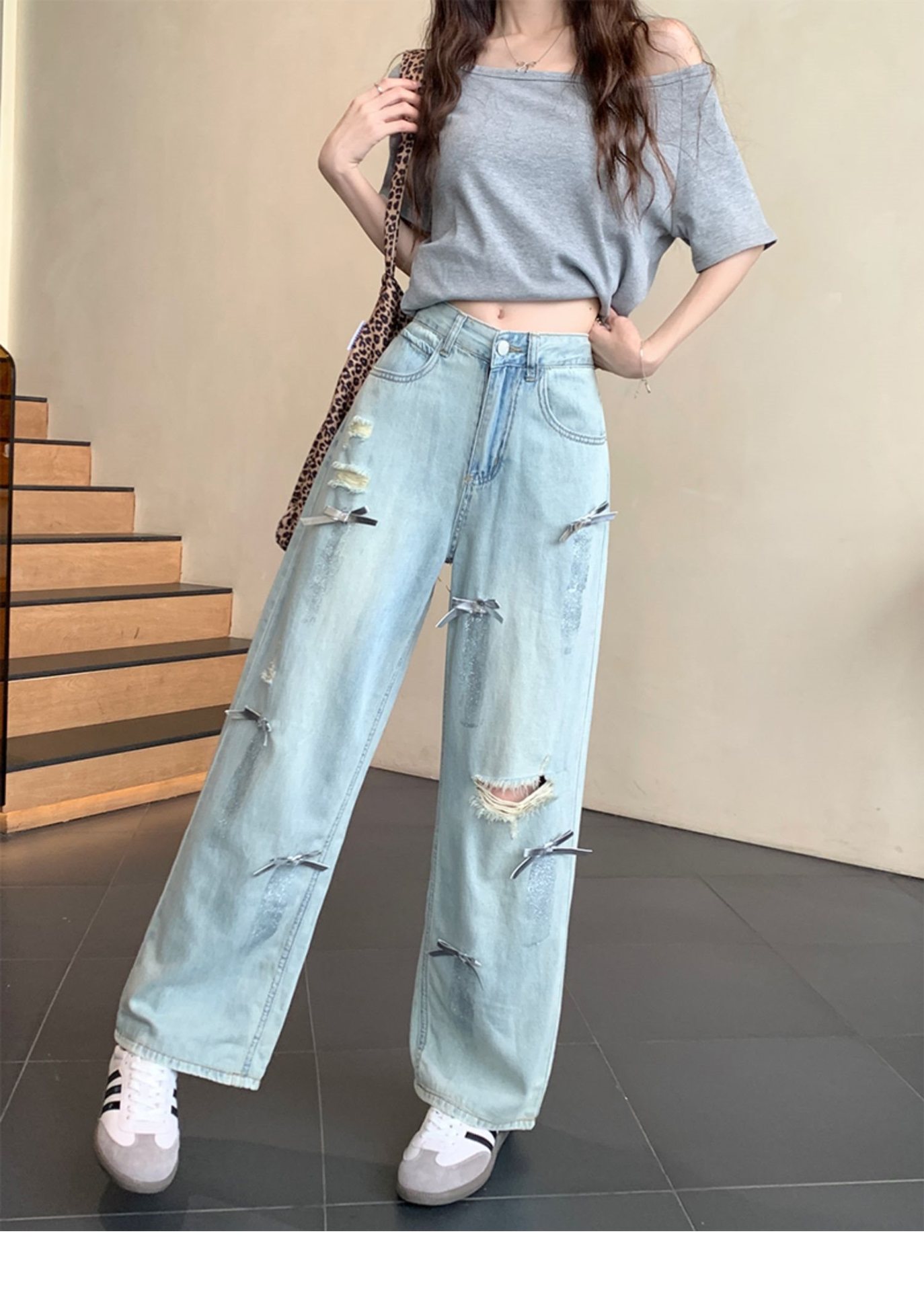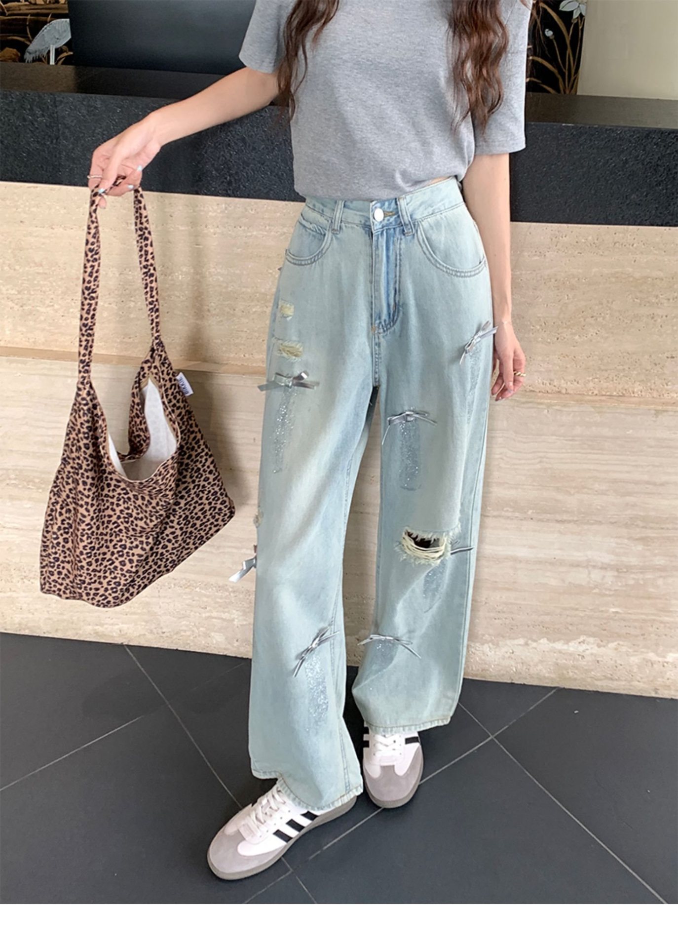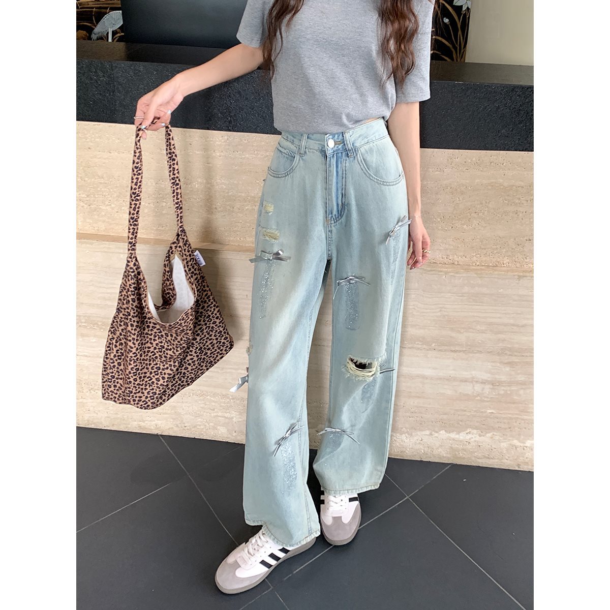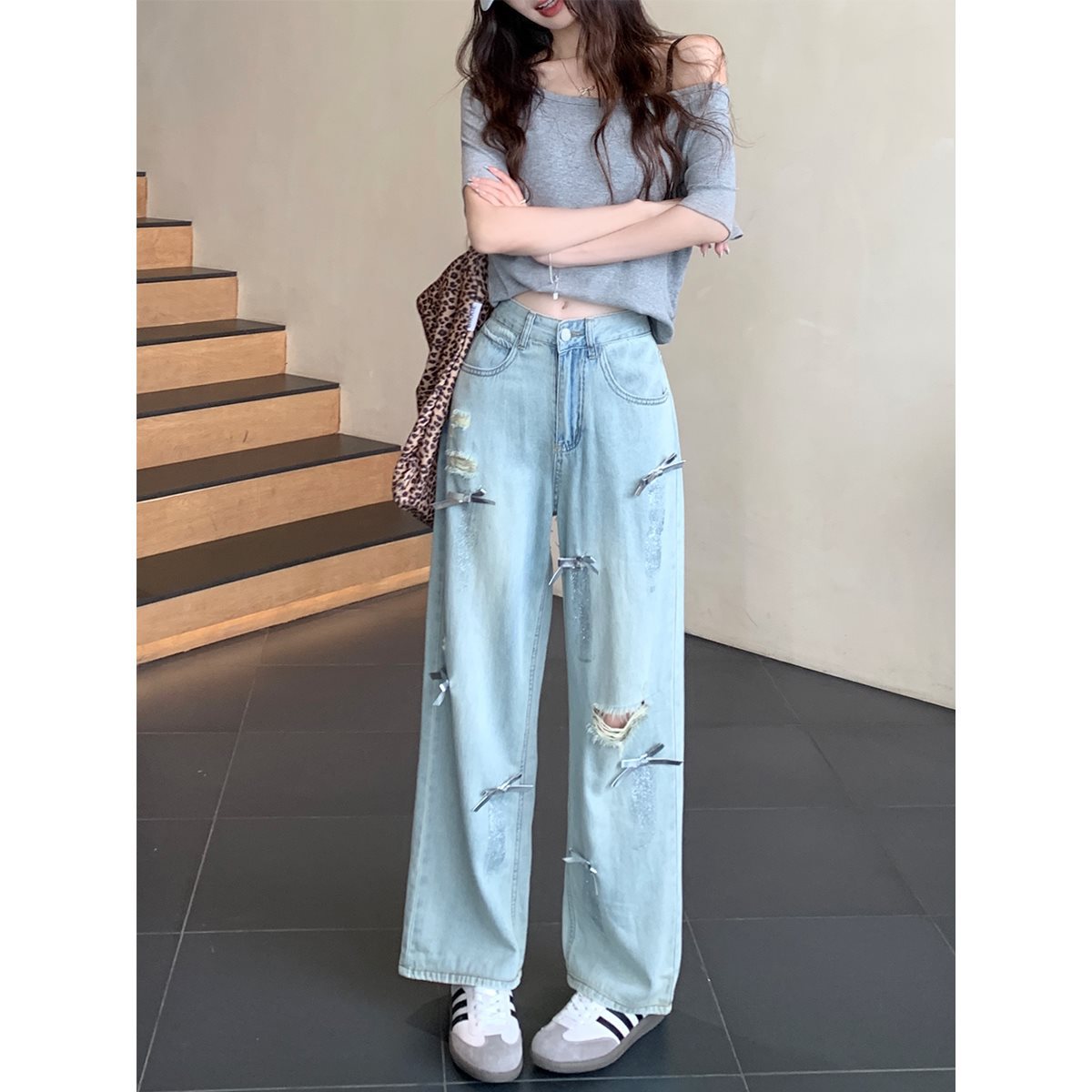 Женские рваные прямые джинсы больших размеров летом, свободные утягивающие широкие брюки с высокой талией в пол для фигуры груши.