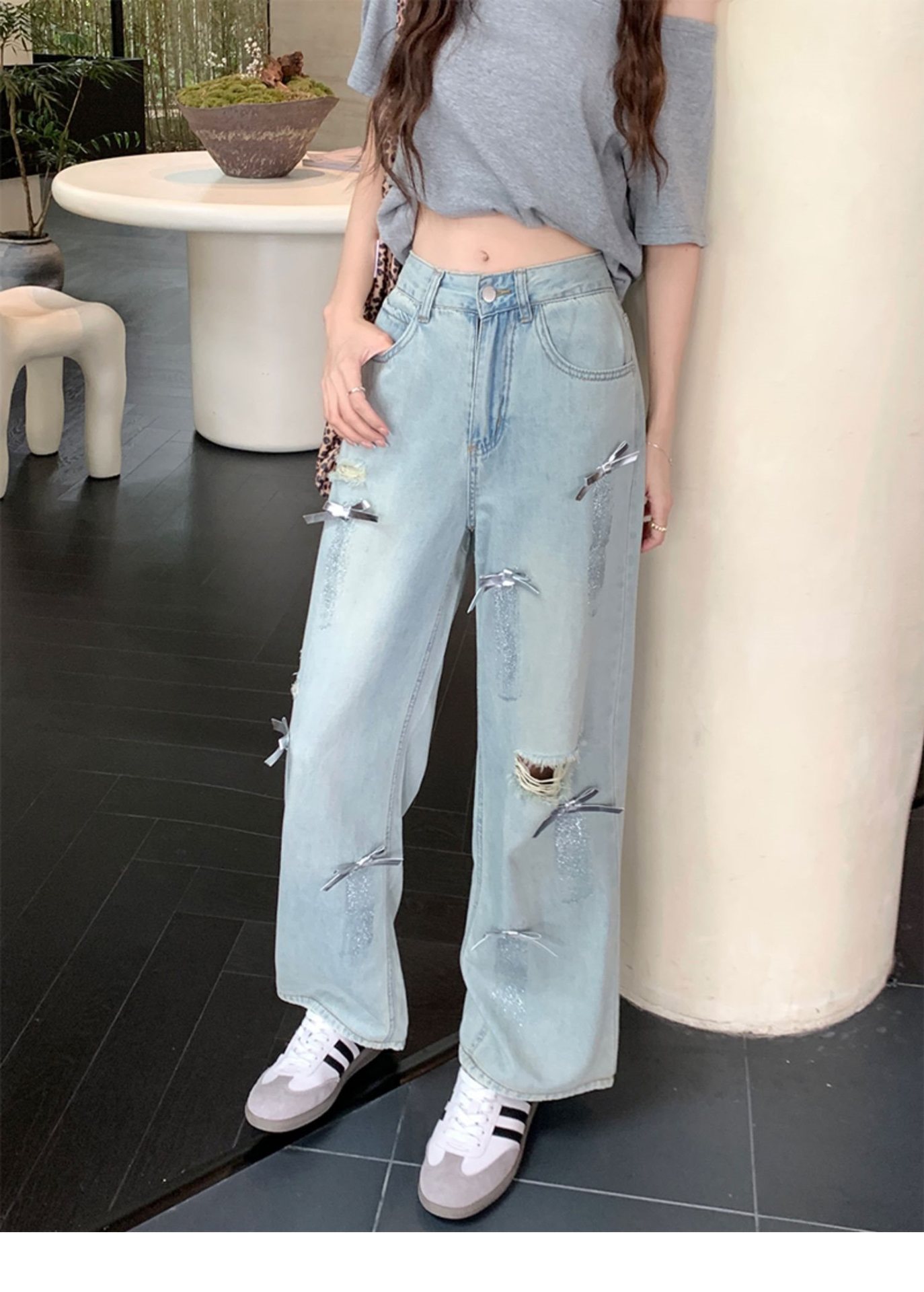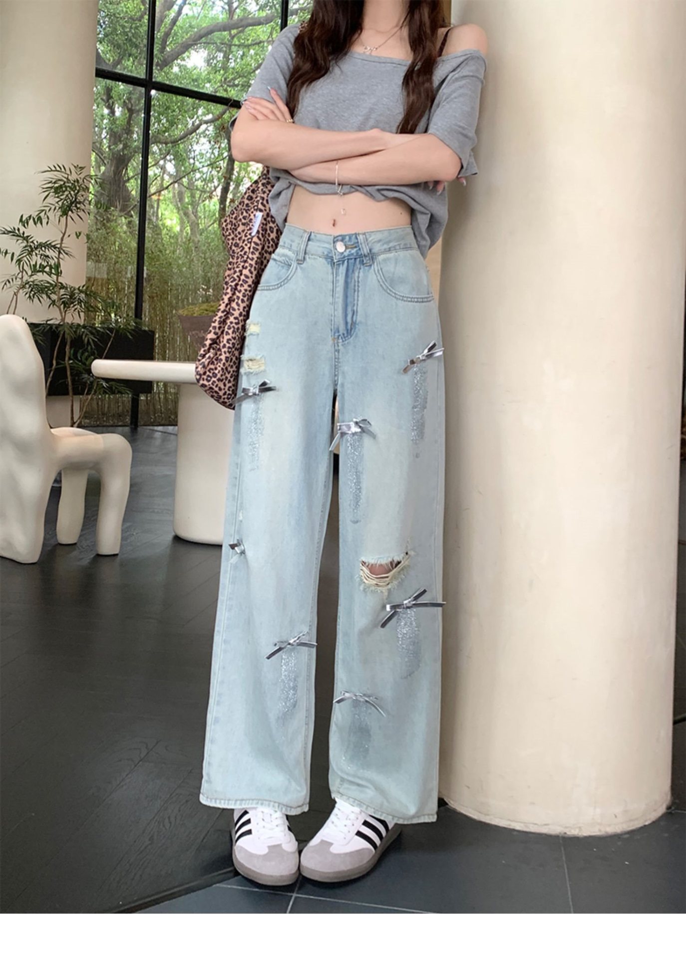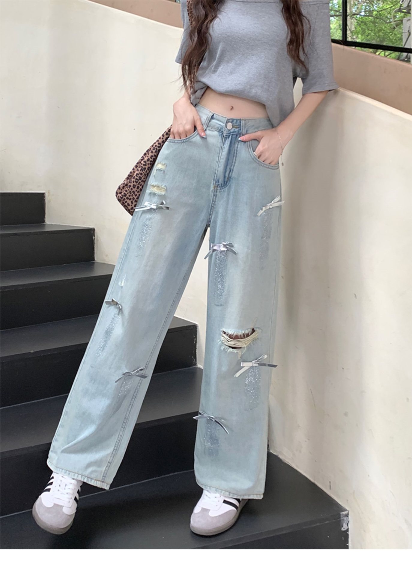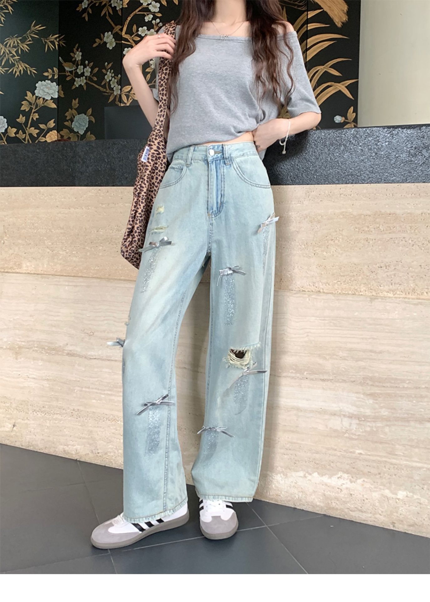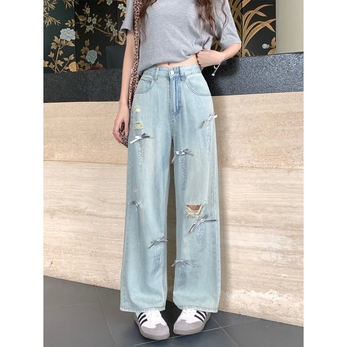 Женские рваные прямые джинсы больших размеров летом, свободные утягивающие широкие брюки с высокой талией в пол для фигуры груши.