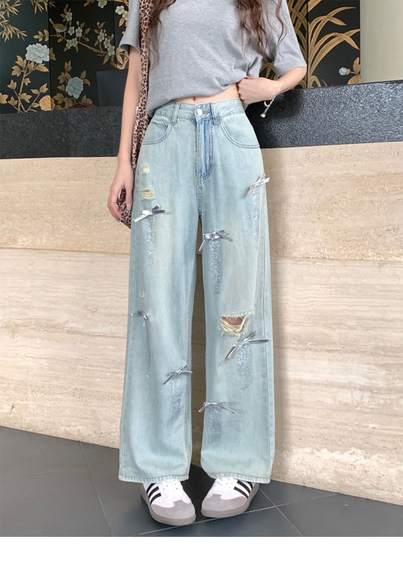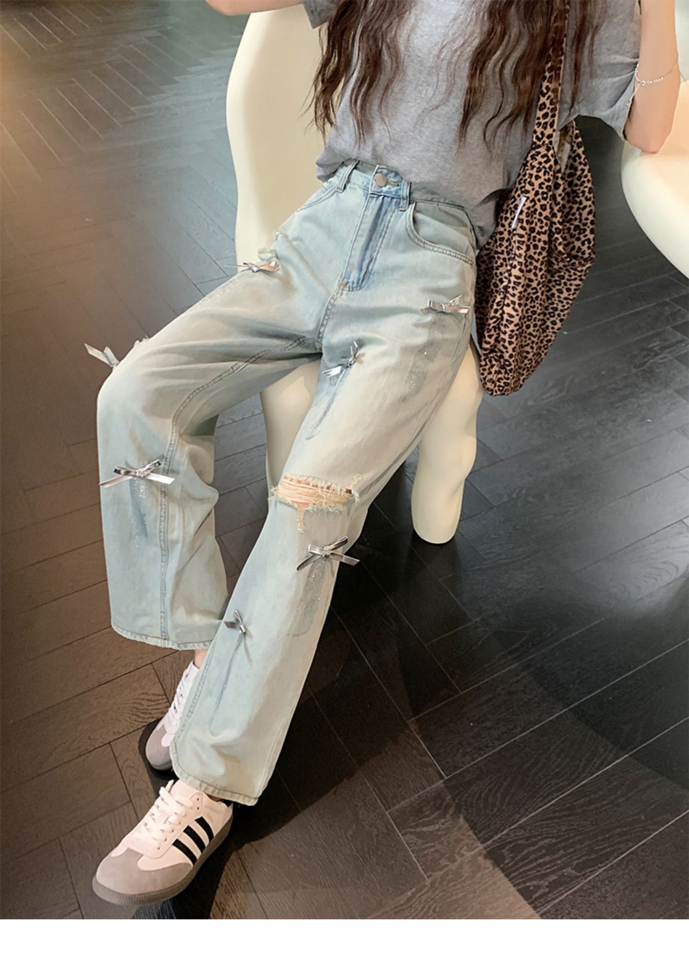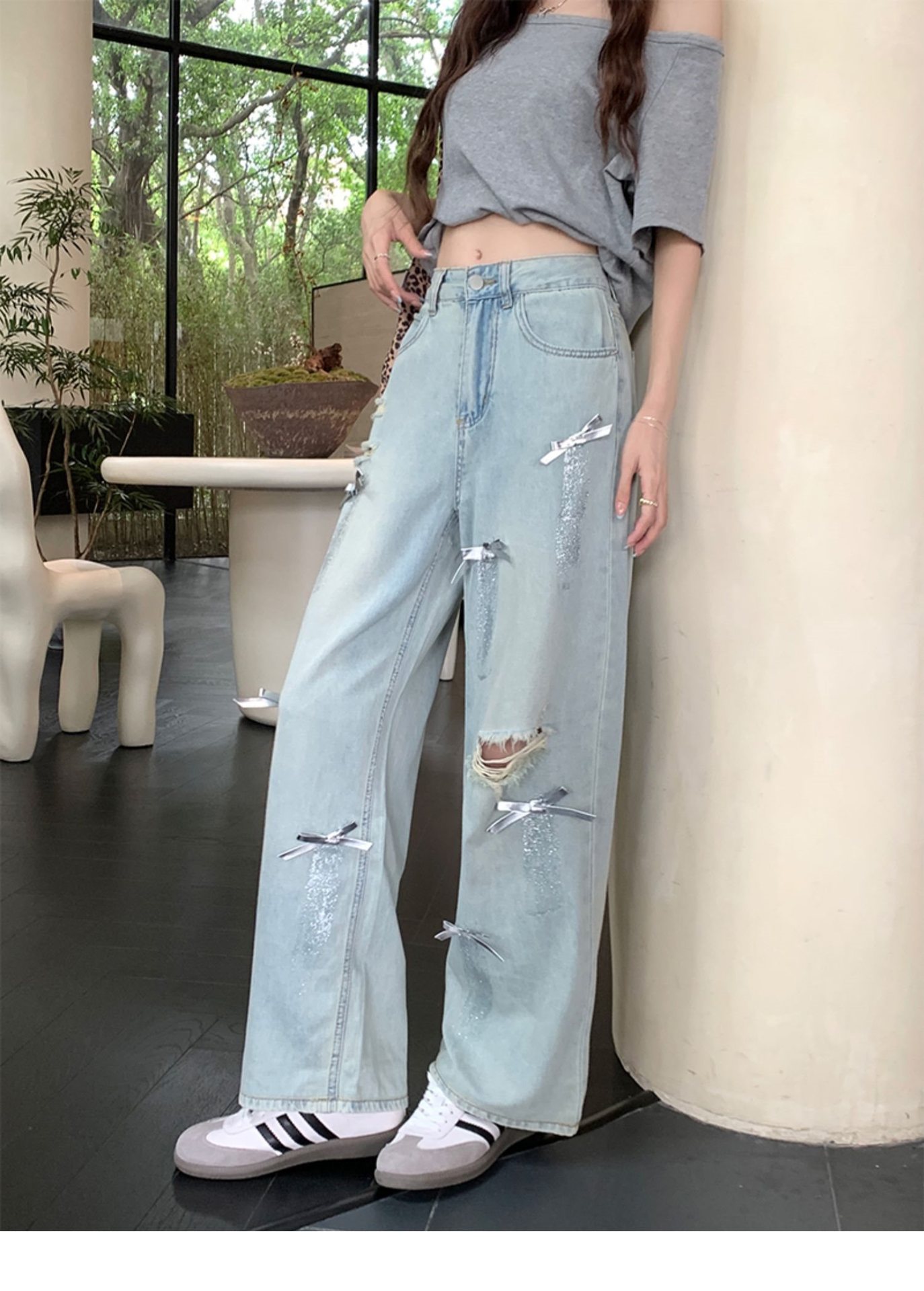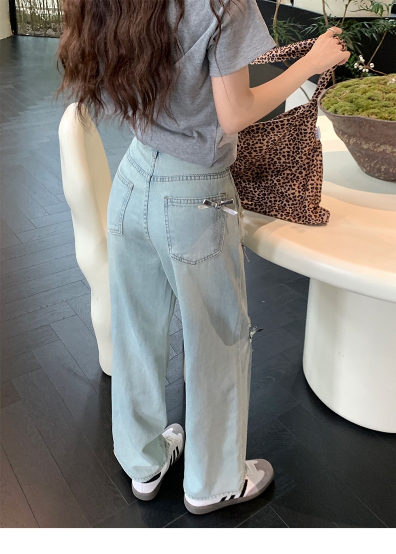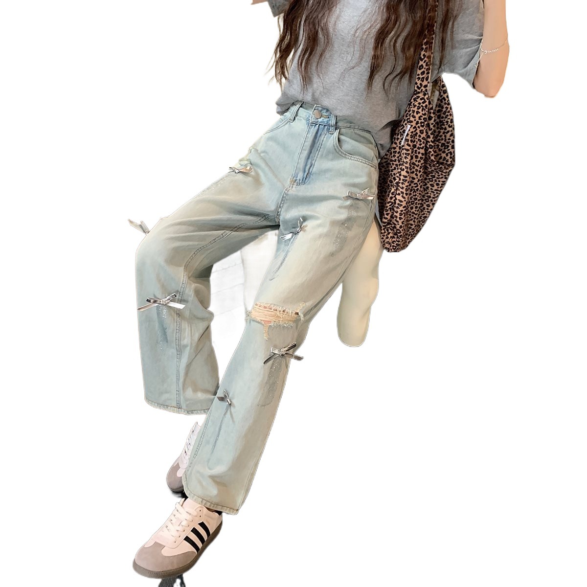 Женские рваные прямые джинсы больших размеров летом, свободные утягивающие широкие брюки с высокой талией в пол для фигуры груши.
