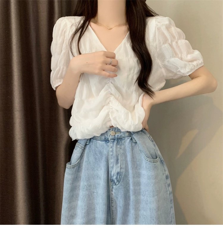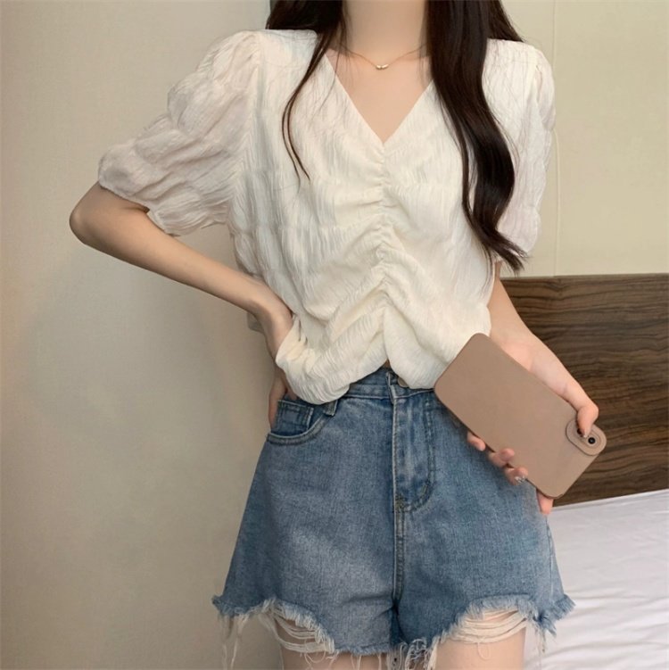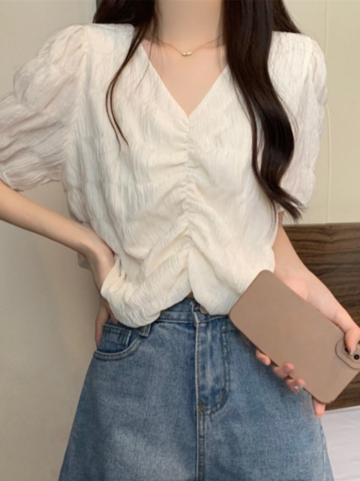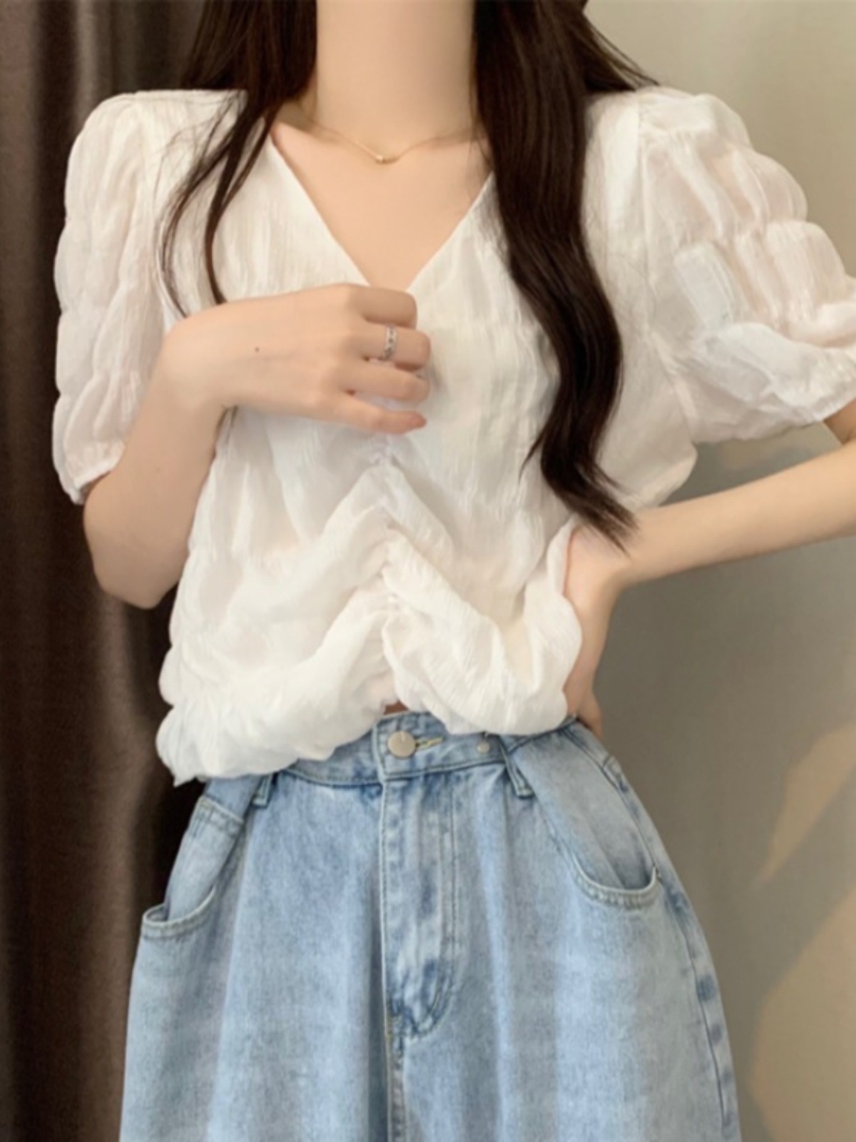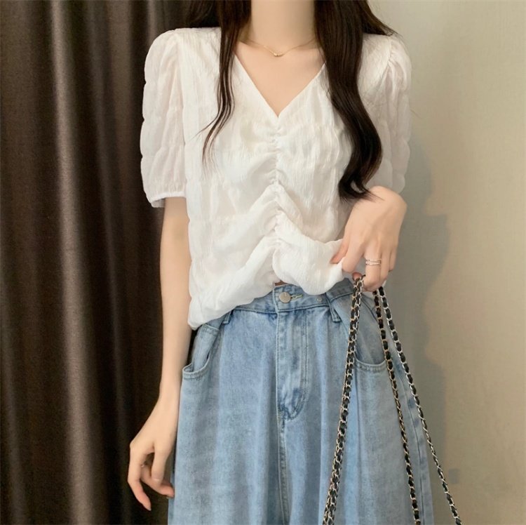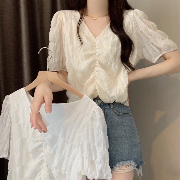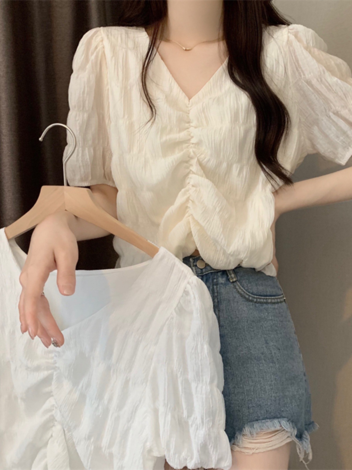 Шифоновая рубашка с v-образным вырезом и короткими рукавами, женская летняя новая стильная шикарная рубашка с тонкими пышными рукавами, дизайнерский нишевый топ