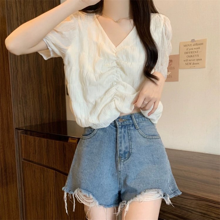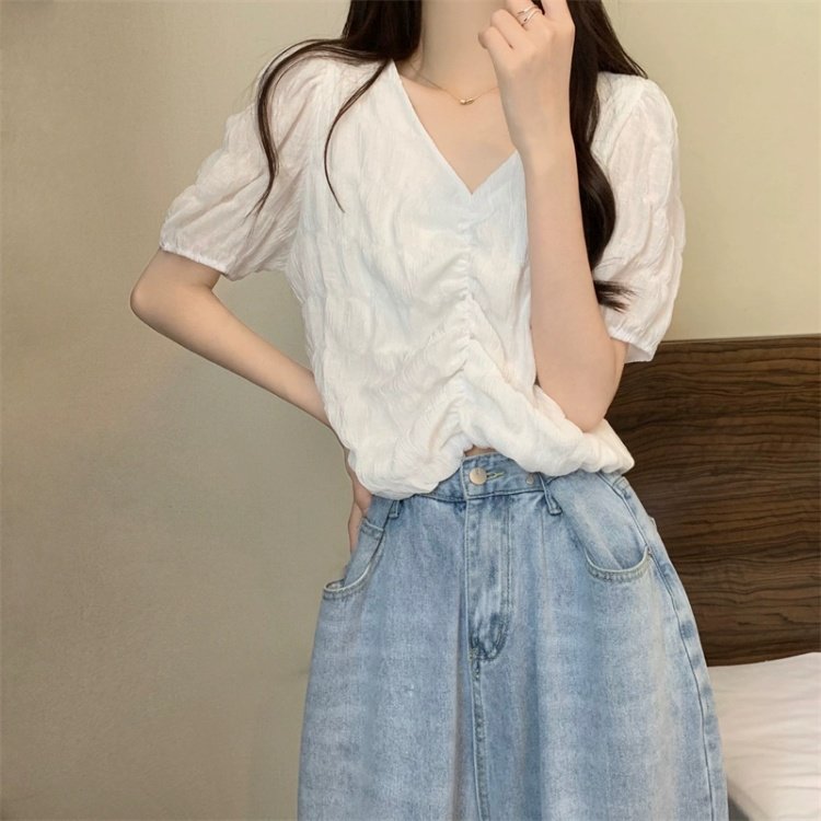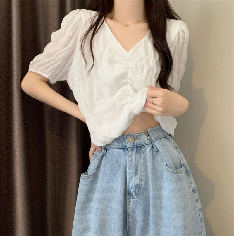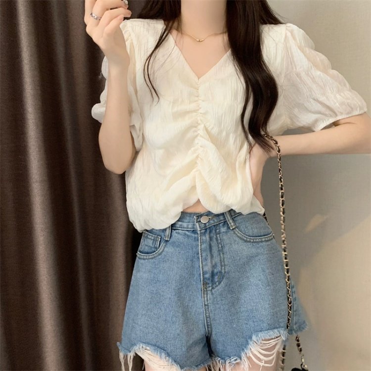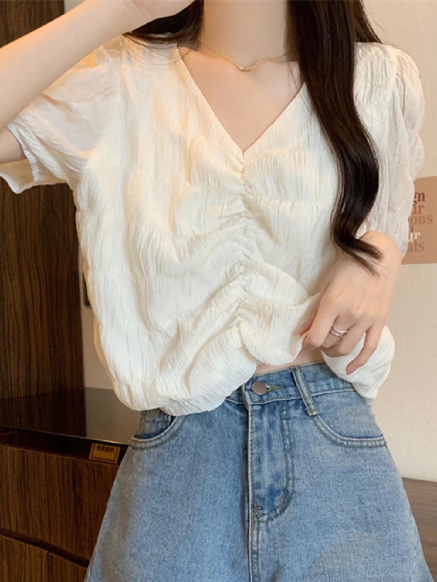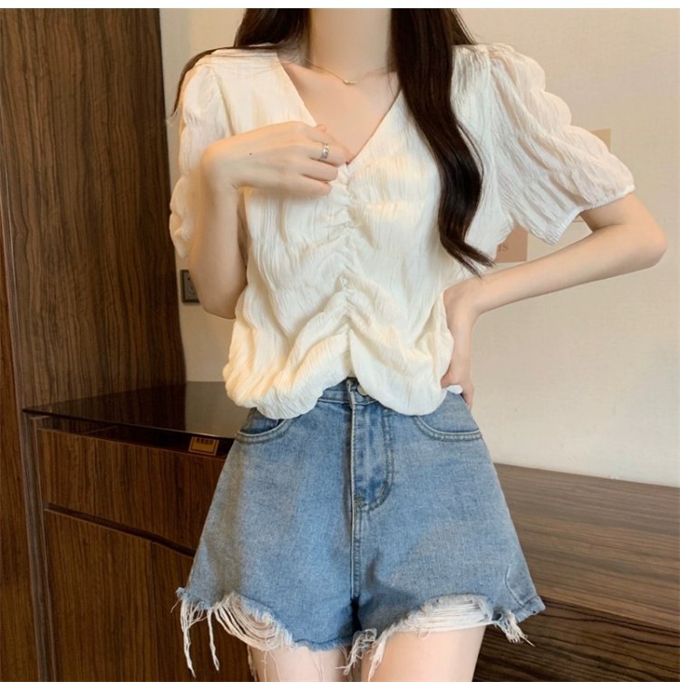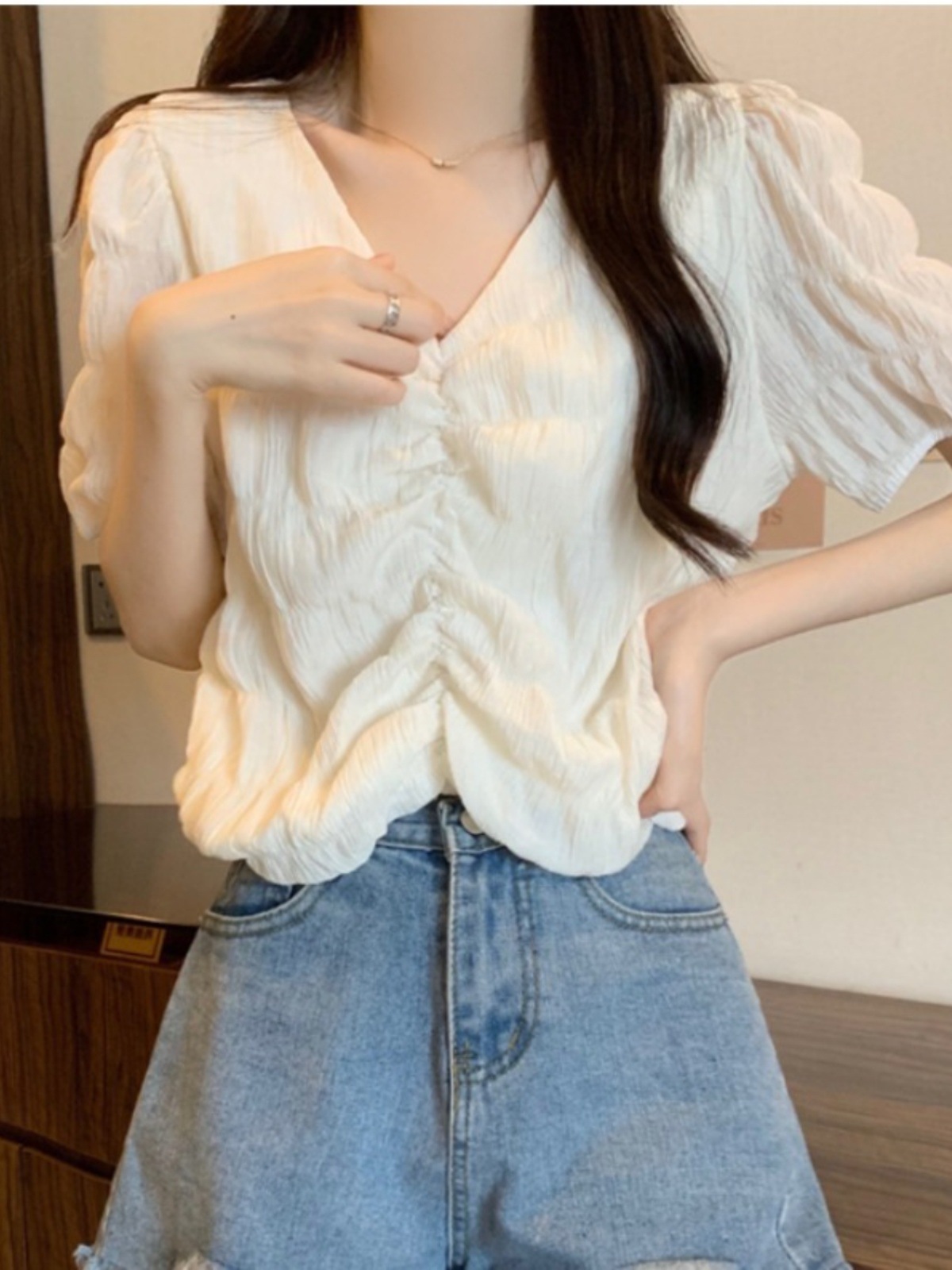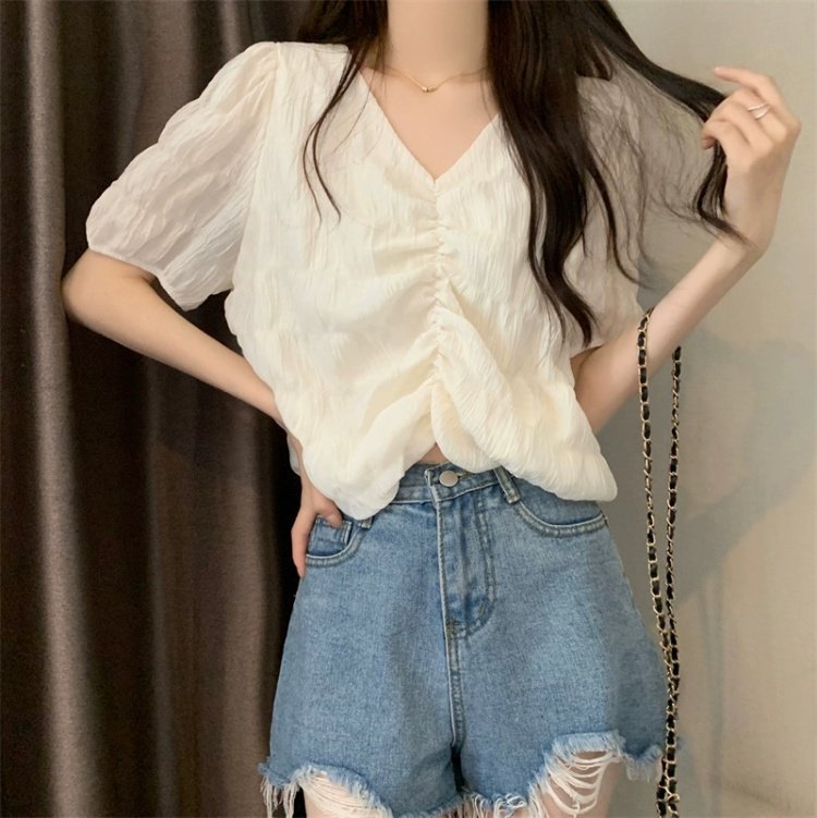Шифоновая рубашка с v-образным вырезом и короткими рукавами, женская летняя новая стильная шикарная рубашка с тонкими пышными рукавами, дизайнерский нишевый топ