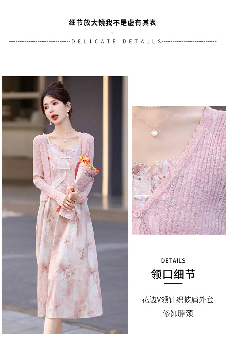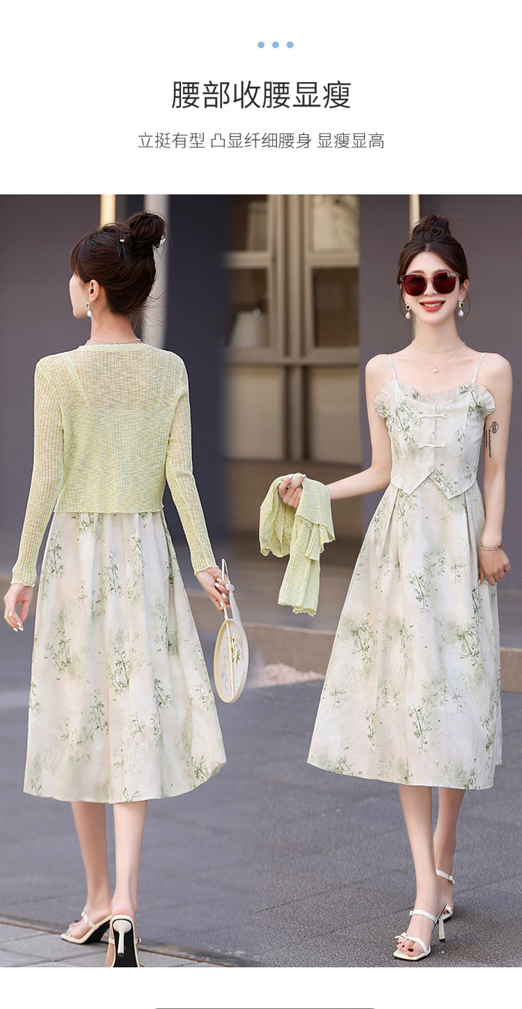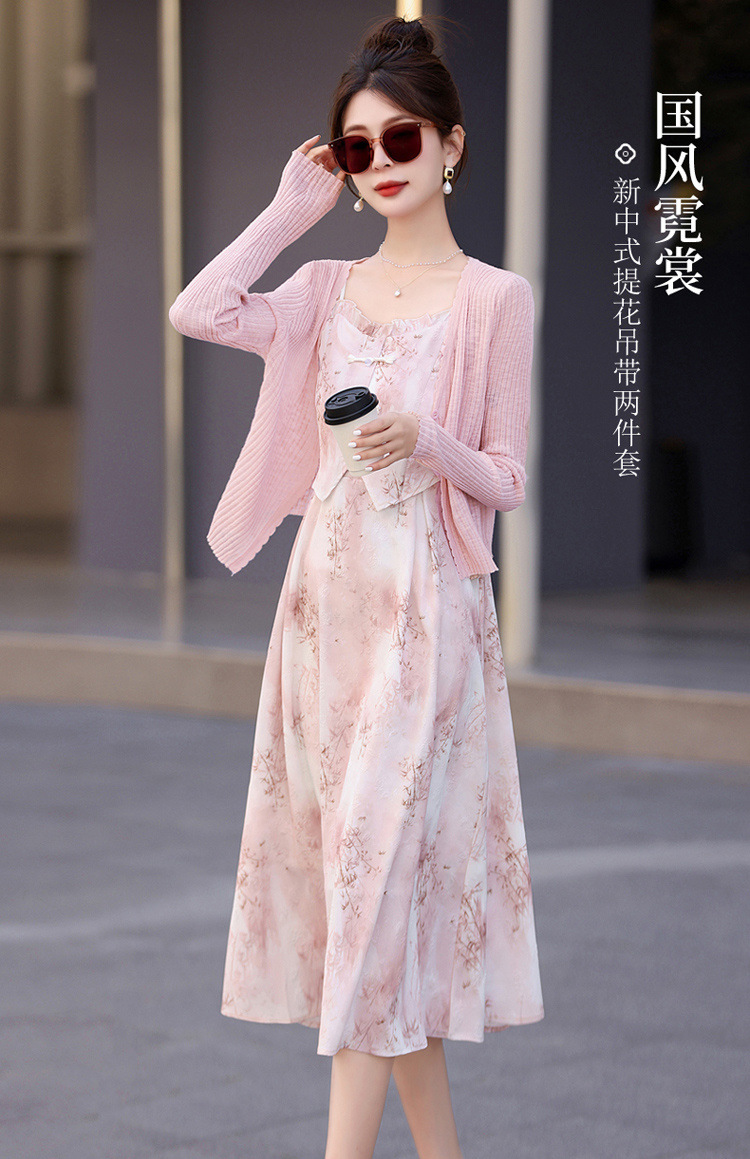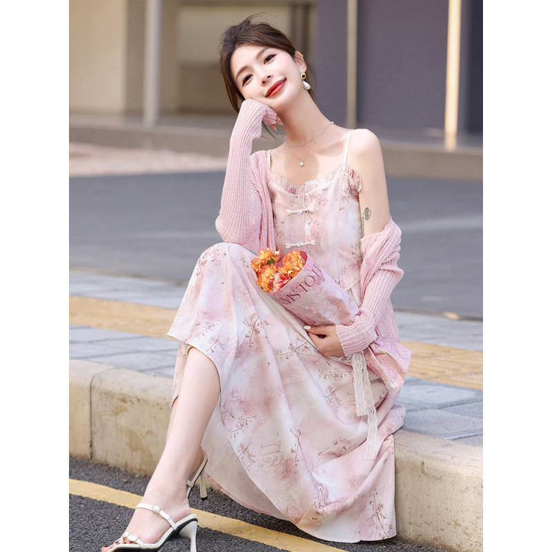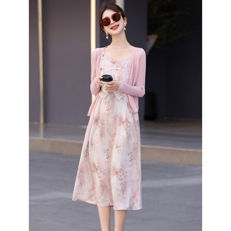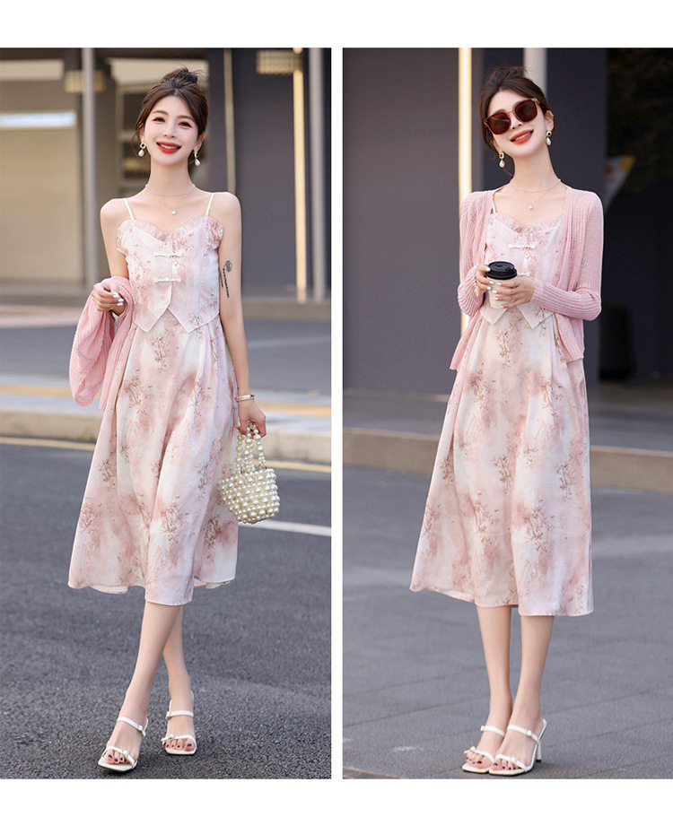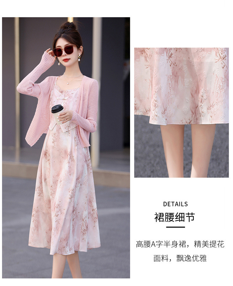 Платье на подтяжках с французским цветочным принтом, комплект из двух предметов для женщин, летний новый стиль, утягивающий талию, супер сказочный темпераментный кардиган, костюм, юбка