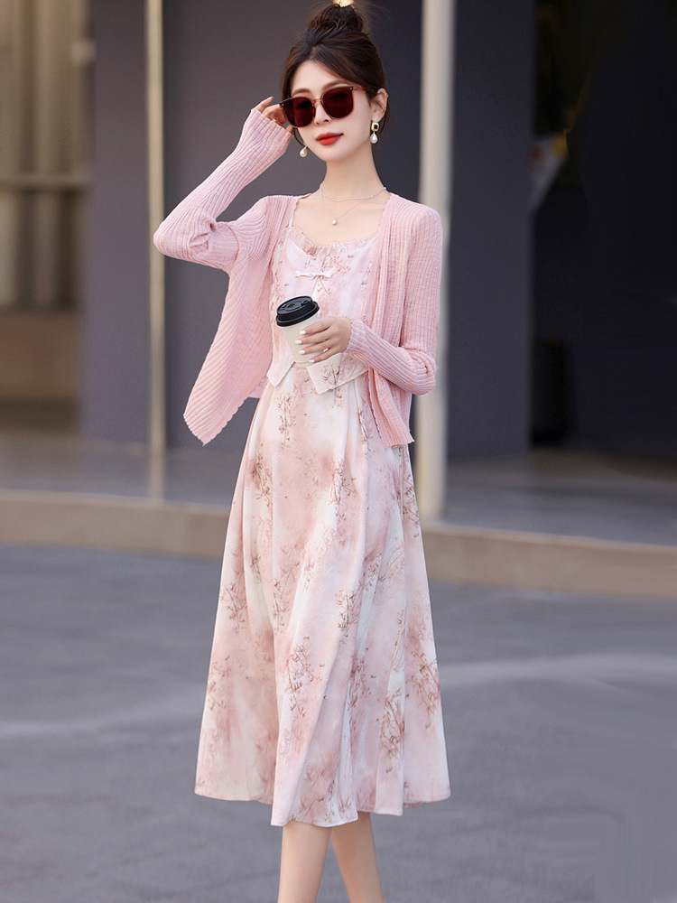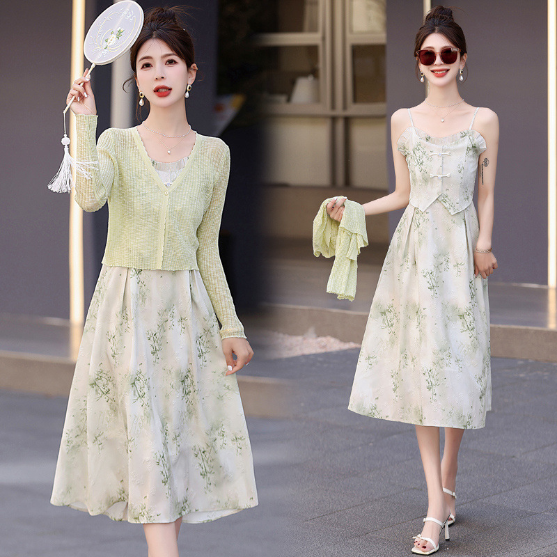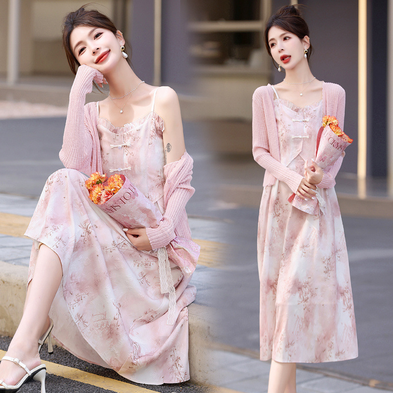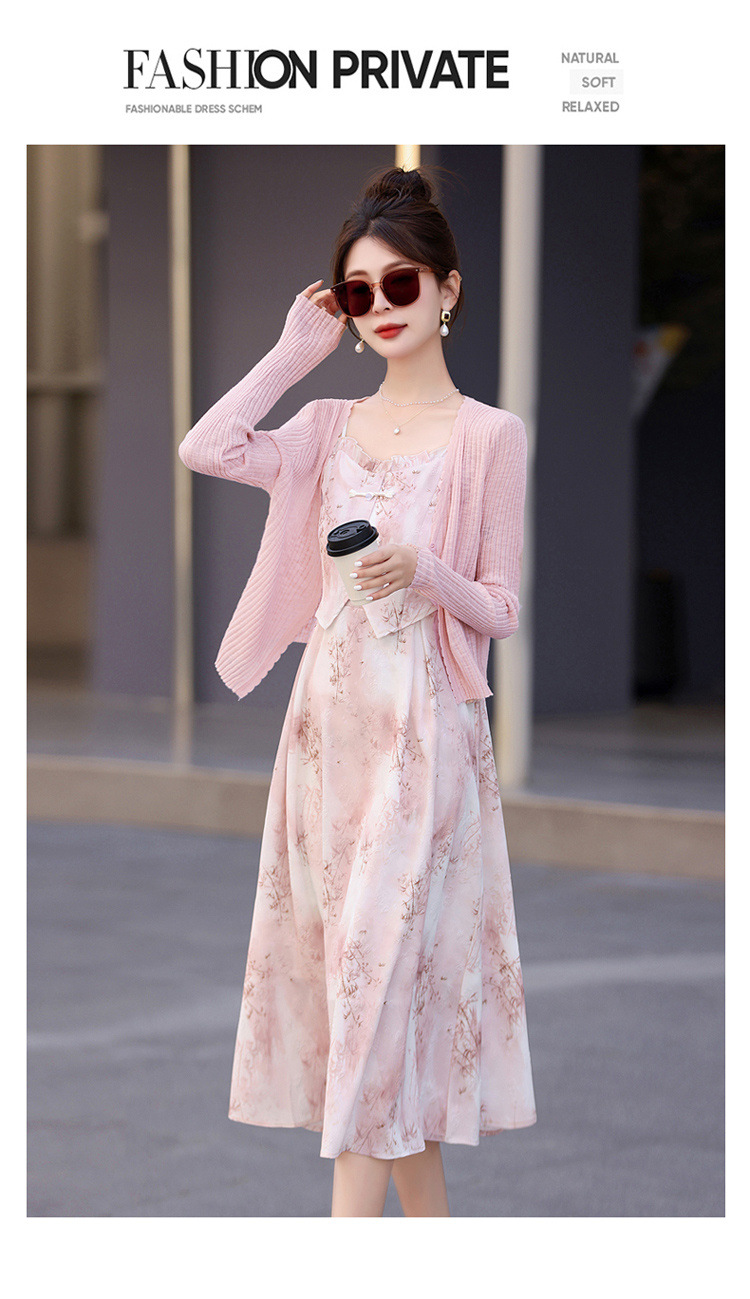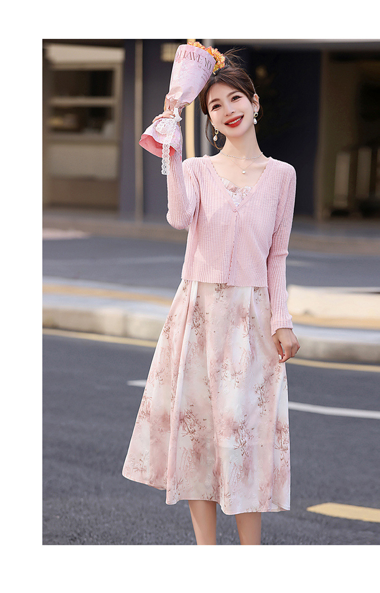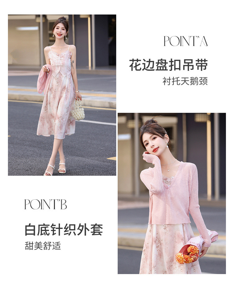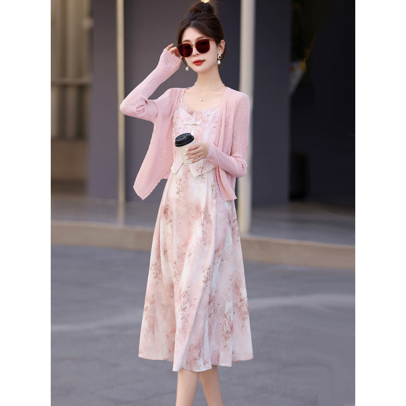 Платье на подтяжках с французским цветочным принтом, комплект из двух предметов для женщин, летний новый стиль, утягивающий талию, супер сказочный темпераментный кардиган, костюм, юбка
