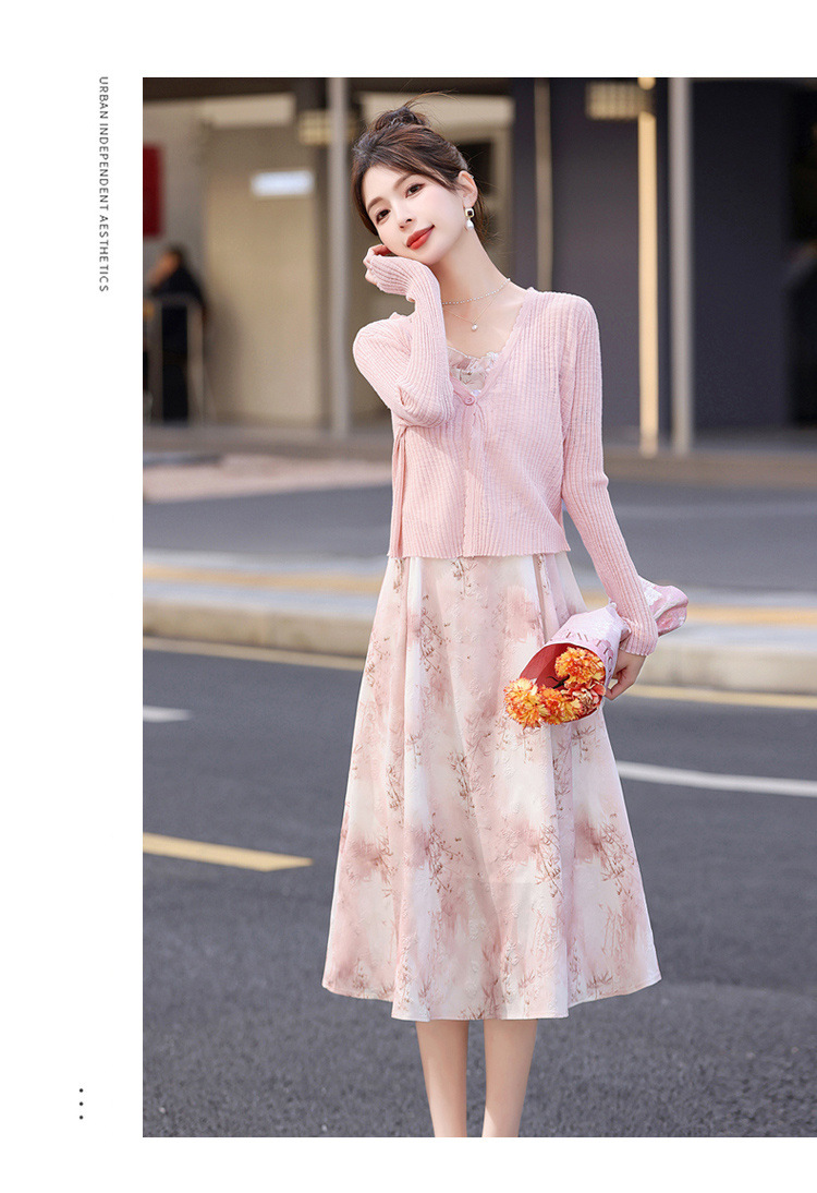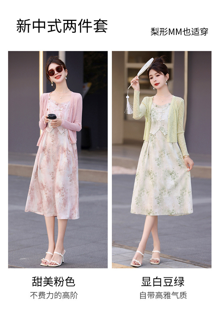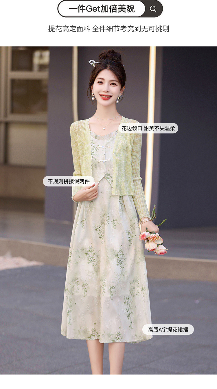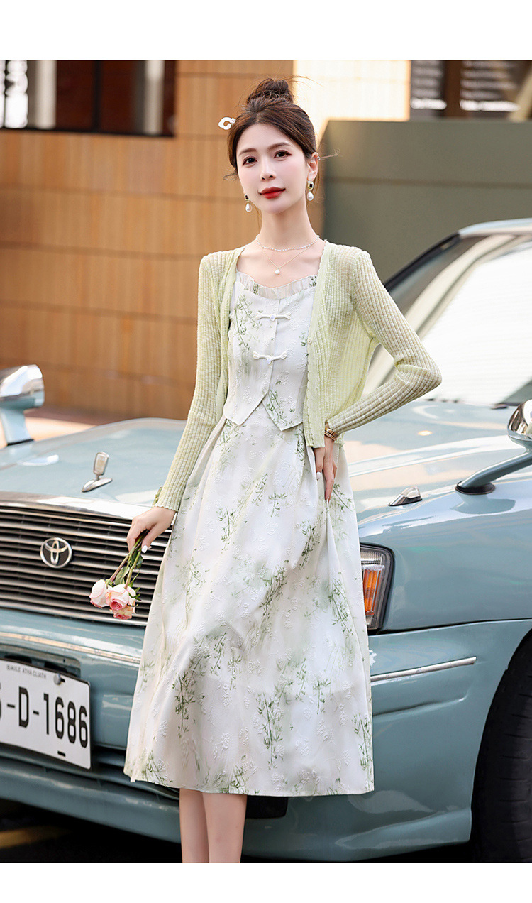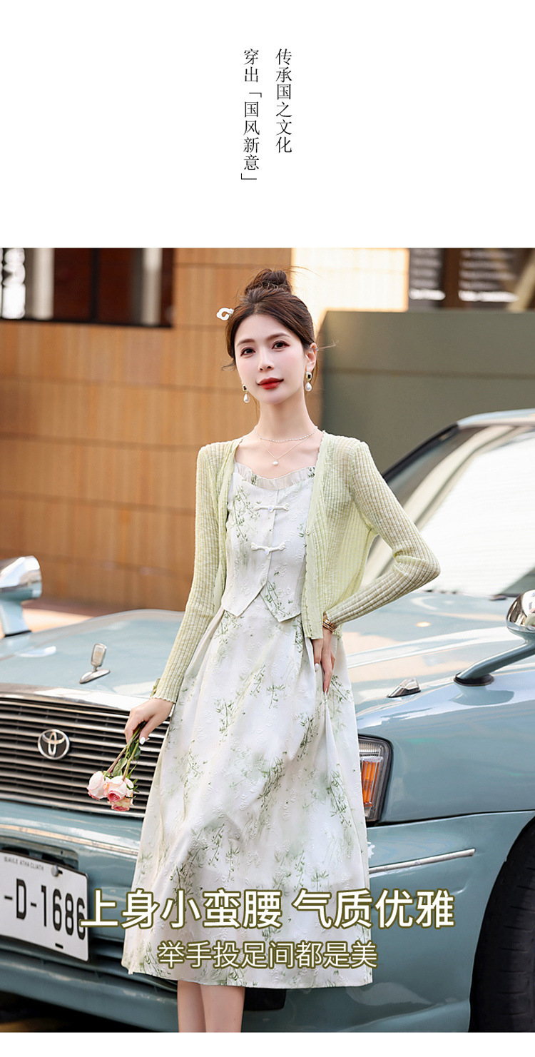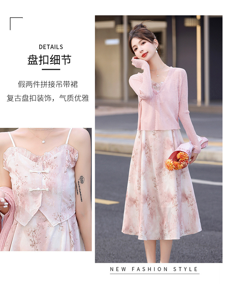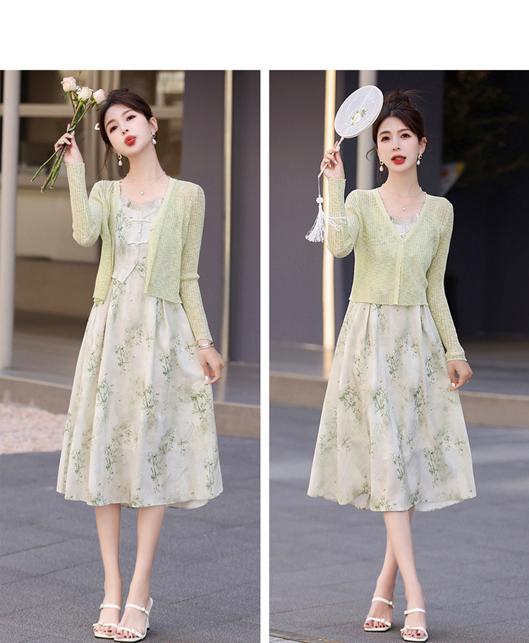 Платье на подтяжках с французским цветочным принтом, комплект из двух предметов для женщин, летний новый стиль, утягивающий талию, супер сказочный темпераментный кардиган, костюм, юбка