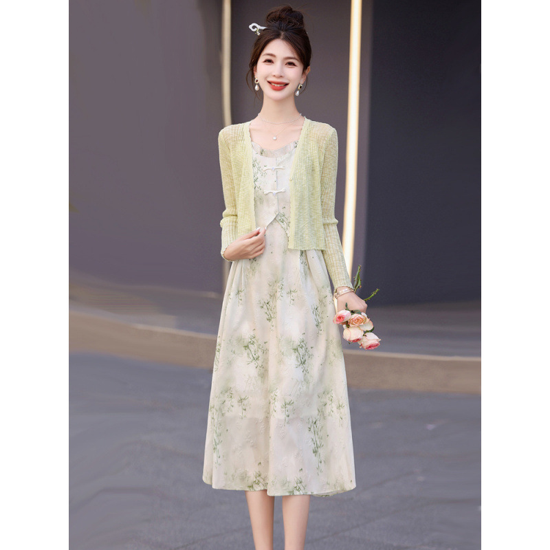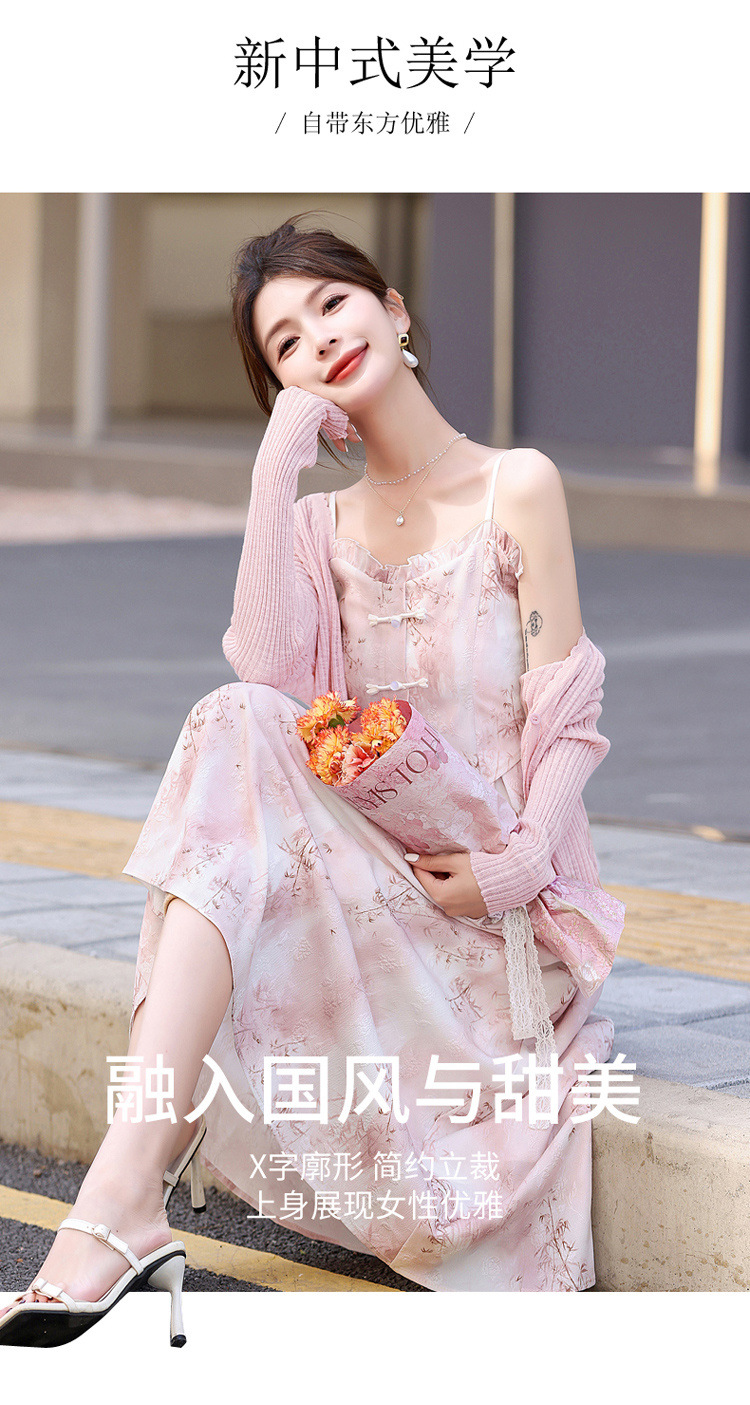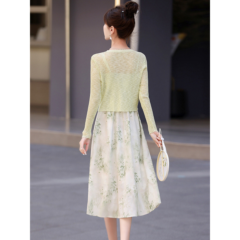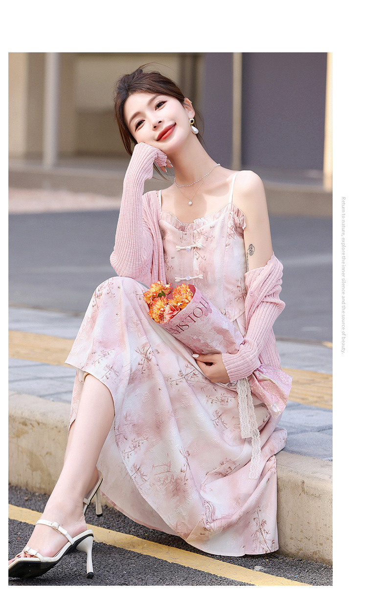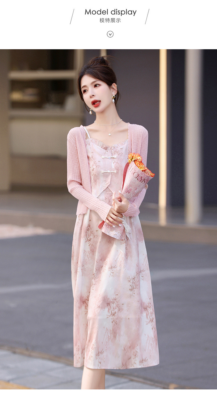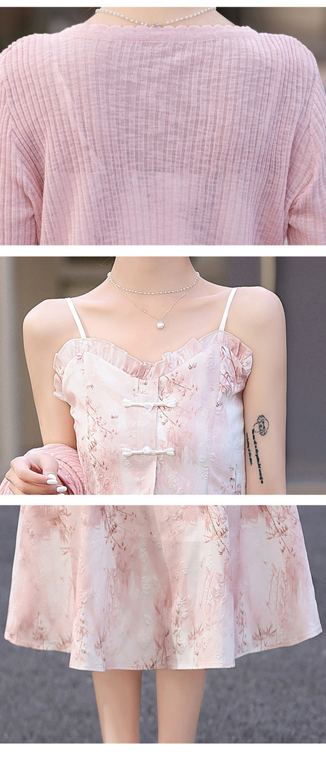 Платье на подтяжках с французским цветочным принтом, комплект из двух предметов для женщин, летний новый стиль, утягивающий талию, супер сказочный темпераментный кардиган, костюм, юбка