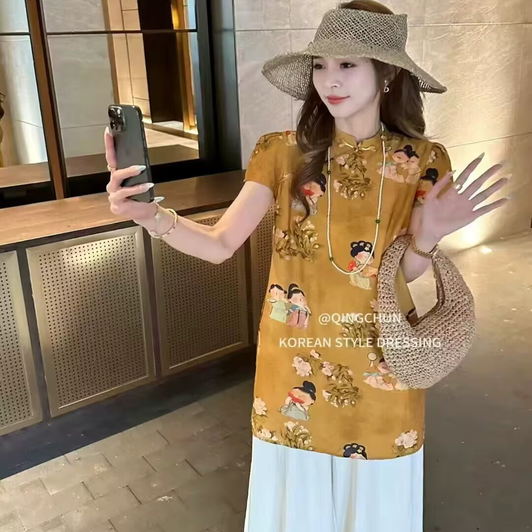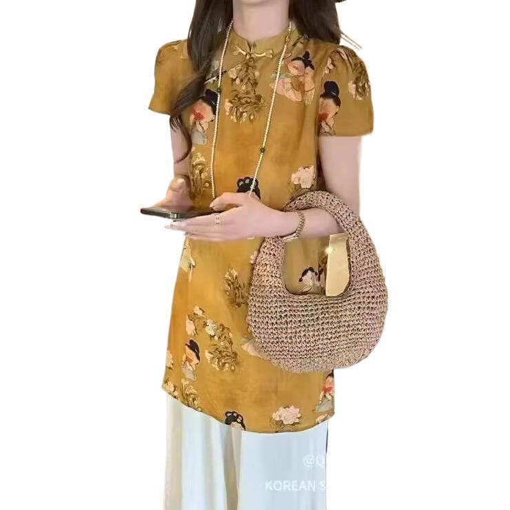 Новый китайский стиль чеонгсам топ + широкие брюки комплект из двух предметов для женщин европейские товары 2025 летний новый модный костюм