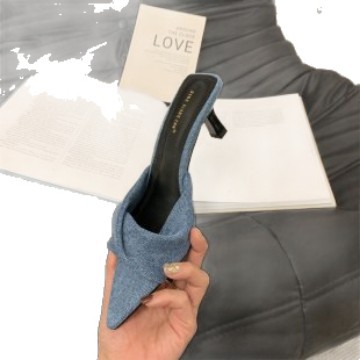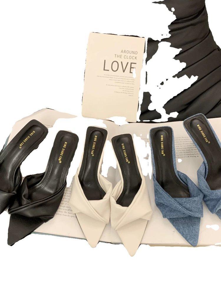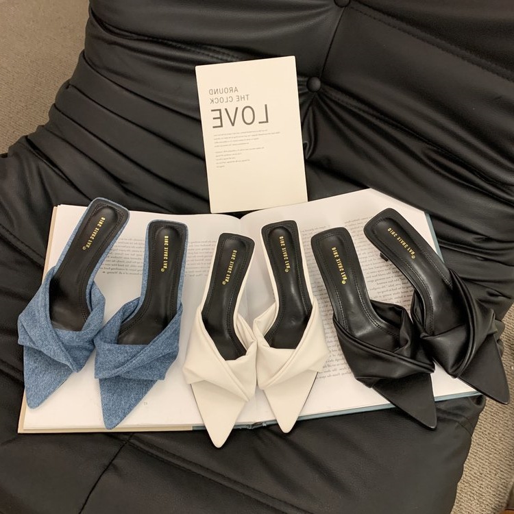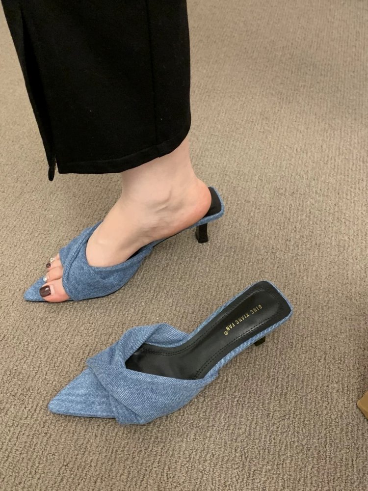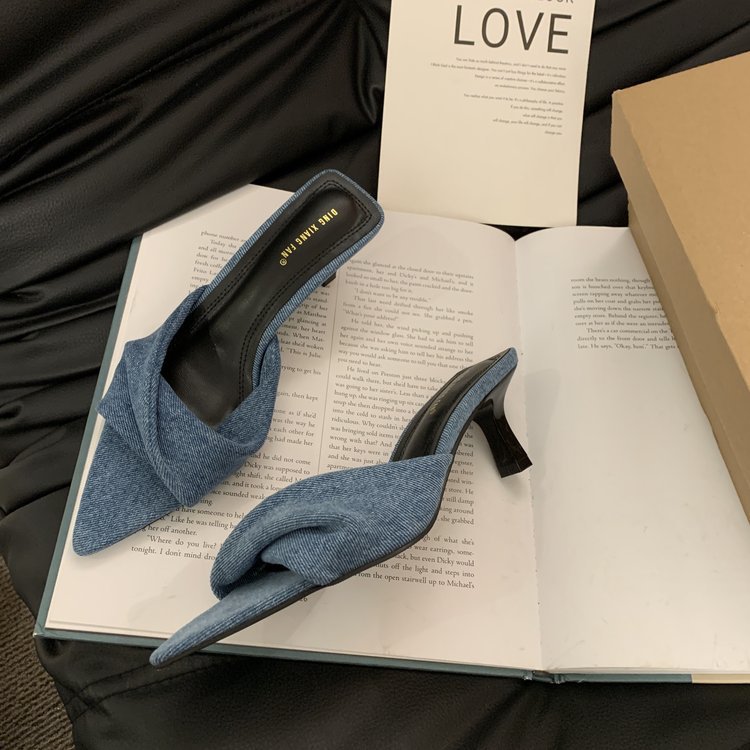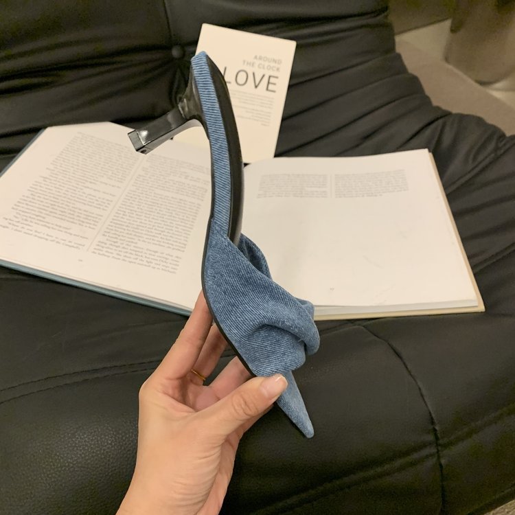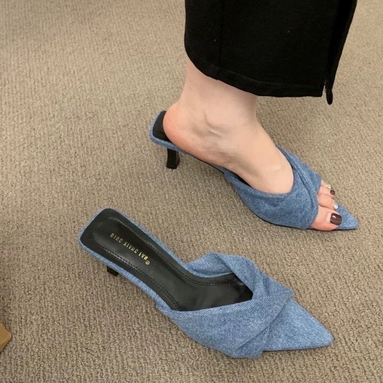 Женские туфли-лодочки в стиле феи, лето 2025, заостренный носок, открытый носок, джинсово-синие, на высоком каблуке, с бантом