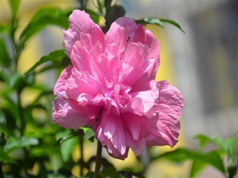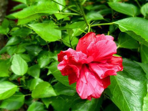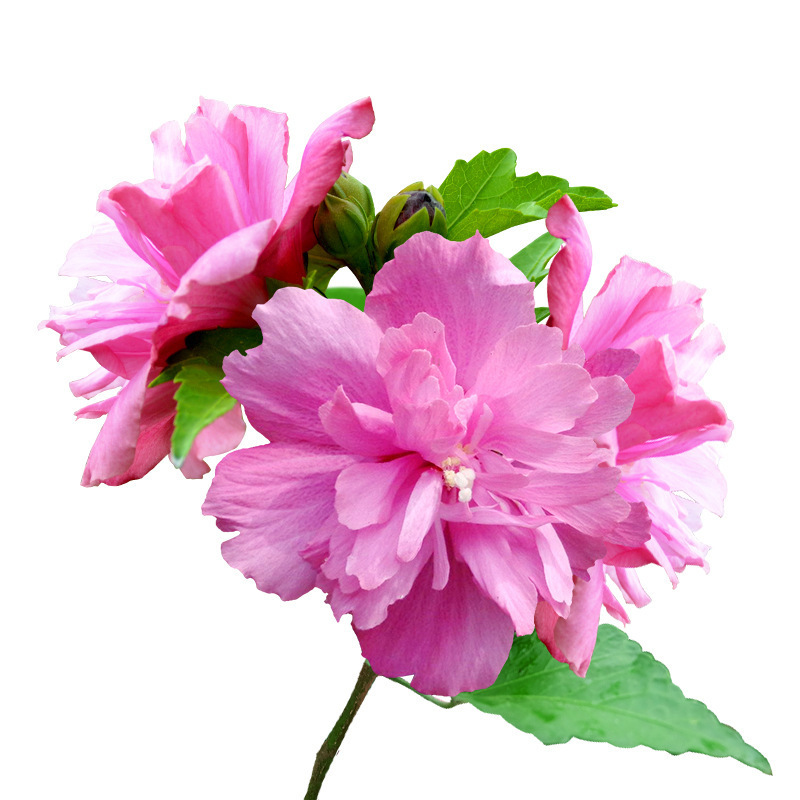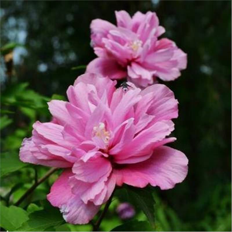 形态特征:木槿(Hibiscus syriacus),系锦葵科木槿属落叶花灌木或小灌木,株高3~5米。小枝幼时密被绒毛,后渐脱落,老枝具白色皮孔。叶片呈三角形或菱状,长3~6厘米,基部楔形,端部常3裂,边缘有钝齿,嫩叶表面有星状毛。花着生于当年生枝条,单生叶腋,花冠直径5~8厘米,呈喇叭状或风车状,单瓣,半重瓣或重瓣,花色有淡紫、紫红、深紫红、粉红、红、白等,有些品种花瓣基部呈红色或紫红色。花期6~10月。
