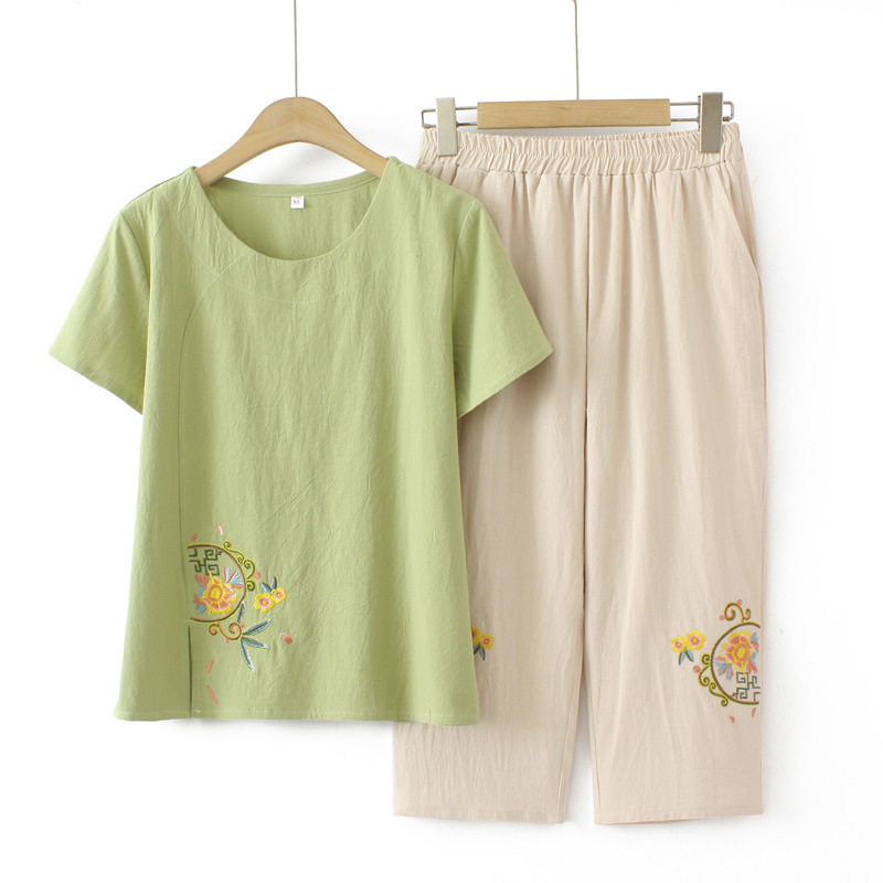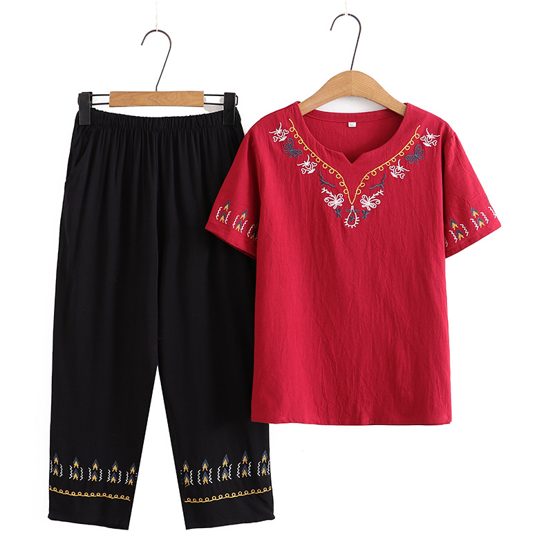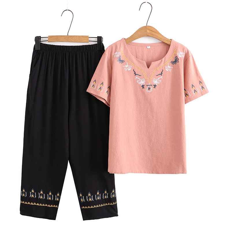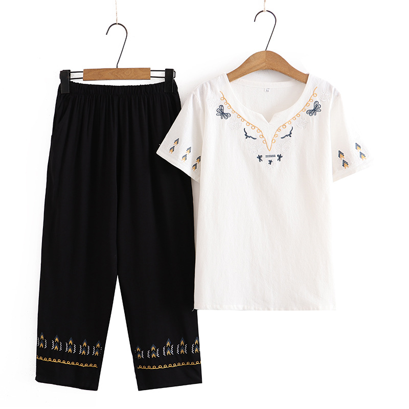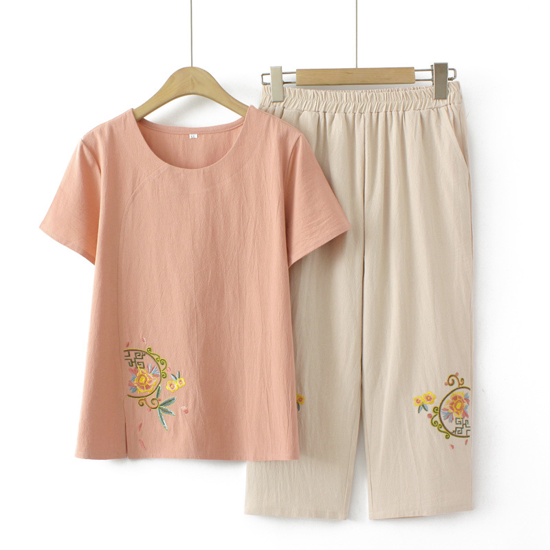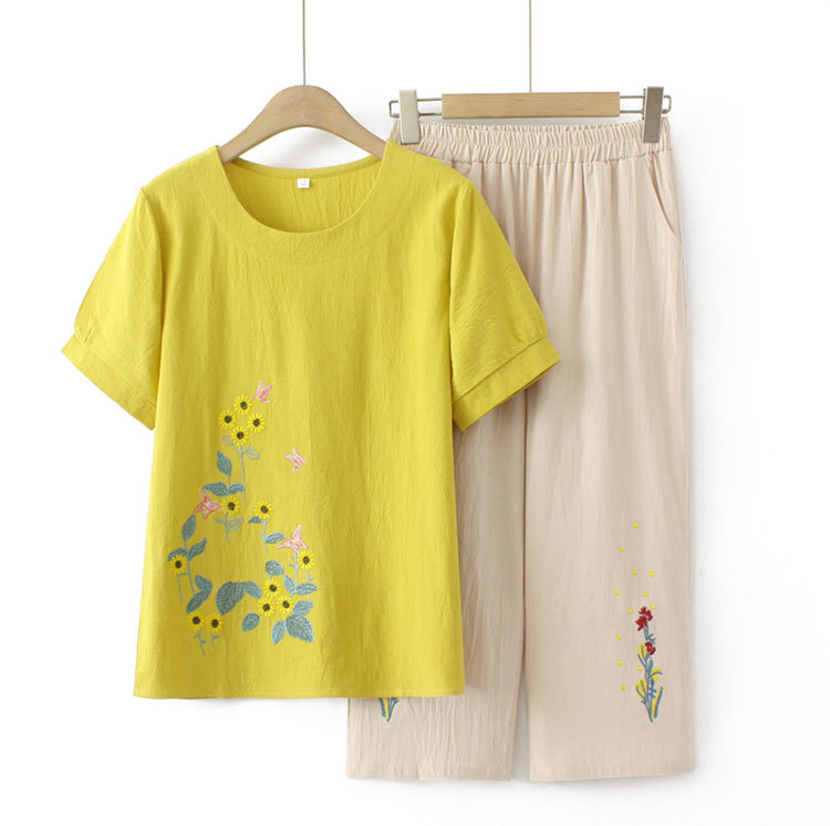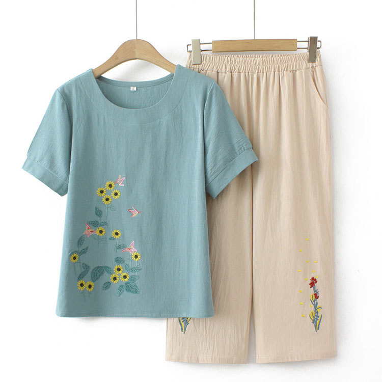 Летний костюм больших размеров для мам среднего и пожилого возраста с вышивкой, женская тонкая футболка с короткими рукавами, женский модный комплект из двух предметов
